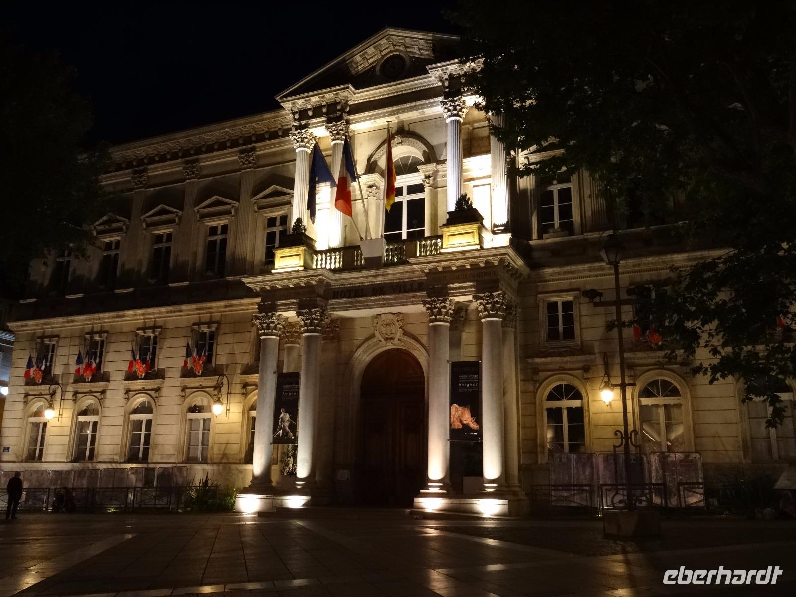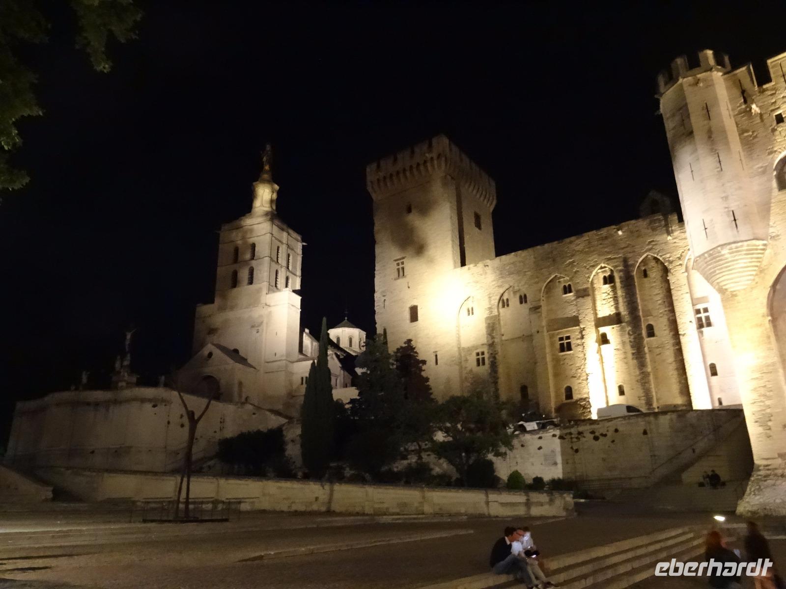 Abschließender Höhepunkt des heutigen Tages bildete ein nächtlicher Spaziergang durch Avignon. Wir liefen durch eines von 13 Stadttoren der dicken Stadtmauer, welche vier Kilometer lang ist, ins Zentrum von Avignon. Vorbei am Theater, Rathaus, Synagoge, Markthalle und der Kirche Saint Pierre erreichten wir den monumental beeindruckenden Papstpalast. Spektakulär beleuchtet wirkte er
