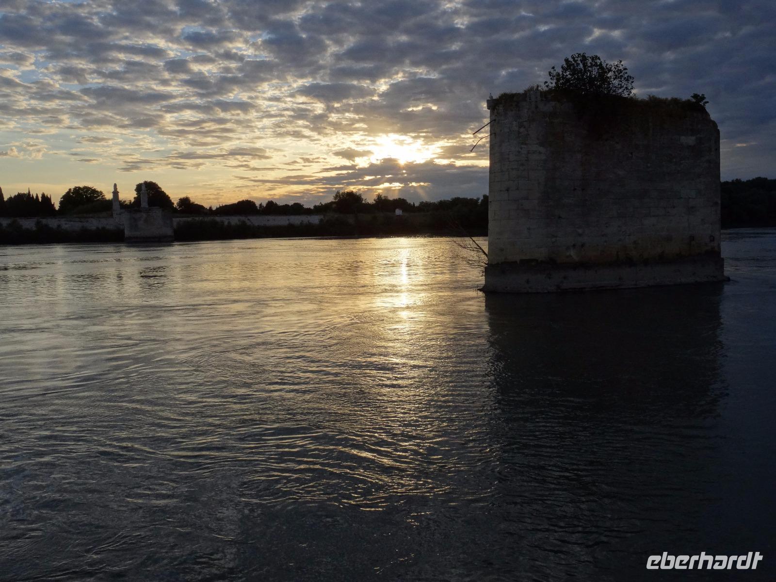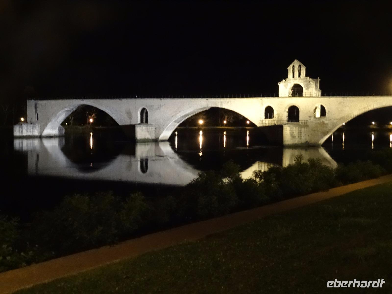 noch gewaltiger als am Tag. Nicht weniger beeindruckend war der folgende Blick auf die berühmte Brücke -Saint Benzet- aus dem Lied "Sur le pont d' Avignon". Leider gibt es nur noch einen Teil zu bewundern, denn Krieg und Hochwasser reduzierten die einst aus 22 Schwüngen bestehende Brücke auf vier Bögen.