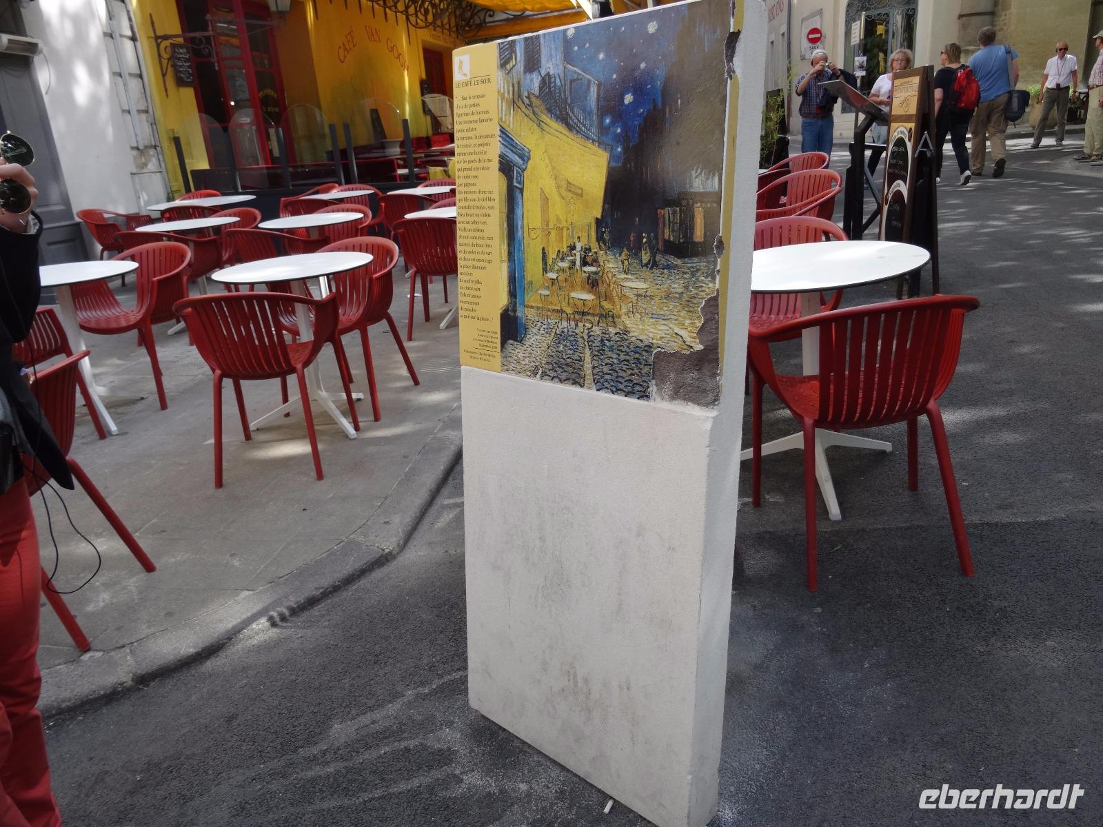 Nichts geht in Arles ohne Vincent van Gogh, welcher hier so etwas wie seine zweite Heimat gefunden hatte. Die Stadt verehrte ihm u.a. damit, dass sie überall, wo der Maler seine Staffelei aufgestellt und gemalt hatte, Markierungen im Fußweg einließ.