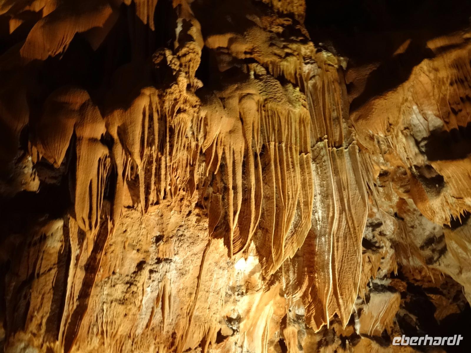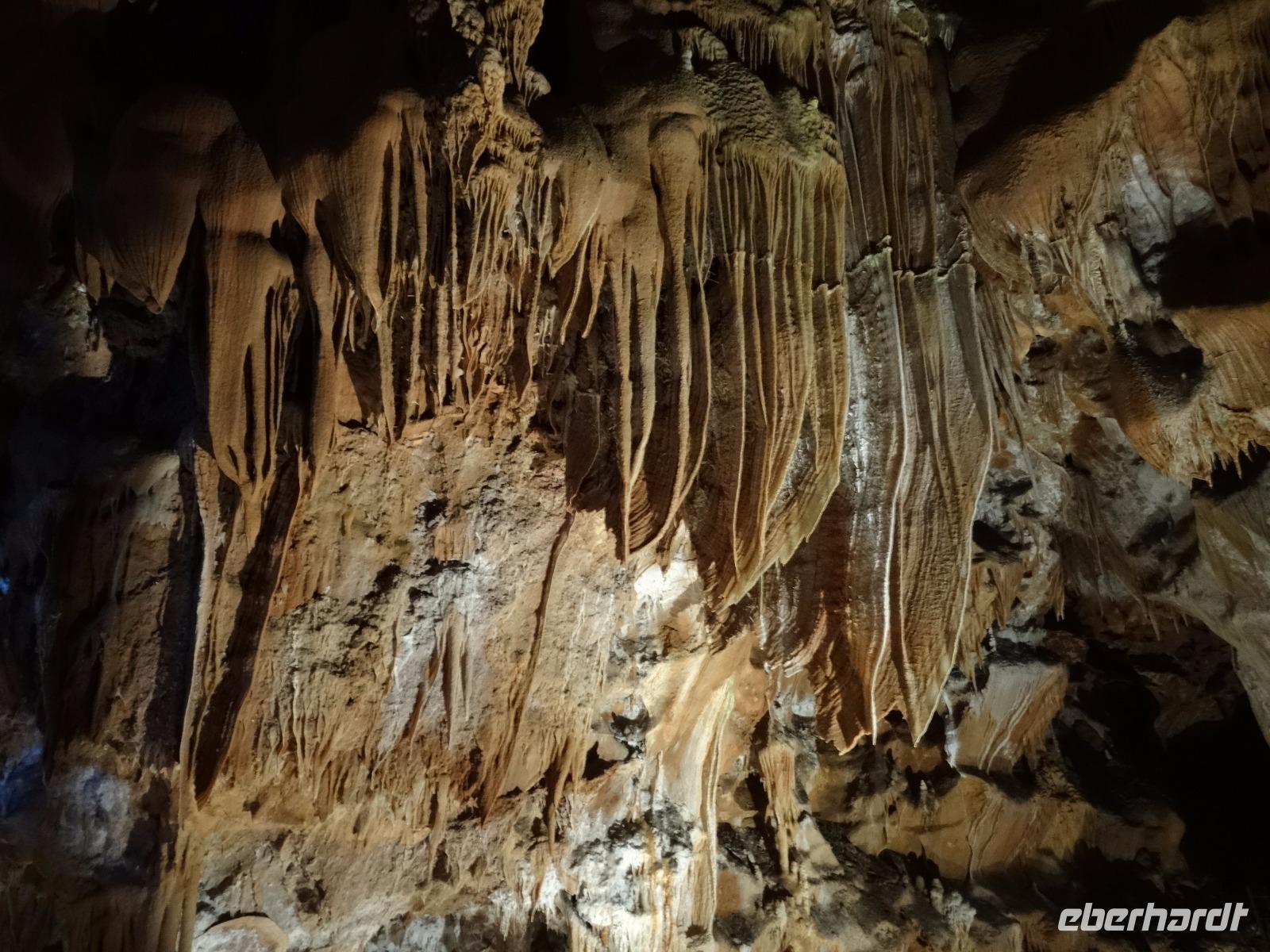 Weiter geht es zur natürlichen "Grotte de la Madeleine". Mutig steigen wir die 174 ungleichmäßigen Stufen bei hoher Luftfeuchtigkeit 40 Meter tief hinab ins Innere der Grotte und bekamen eine kleine Musik- und Lichtershow zur Belohnung. Wer aus gesundheitlichen Gründen nicht mit einsteigen kann, wurde mit einem für die Region typischen Kastaninenlikör oder anderem Getränk sowie einem phantastischen Blick auf Schluchten der Ardeche vor der Grotte entschädigt.