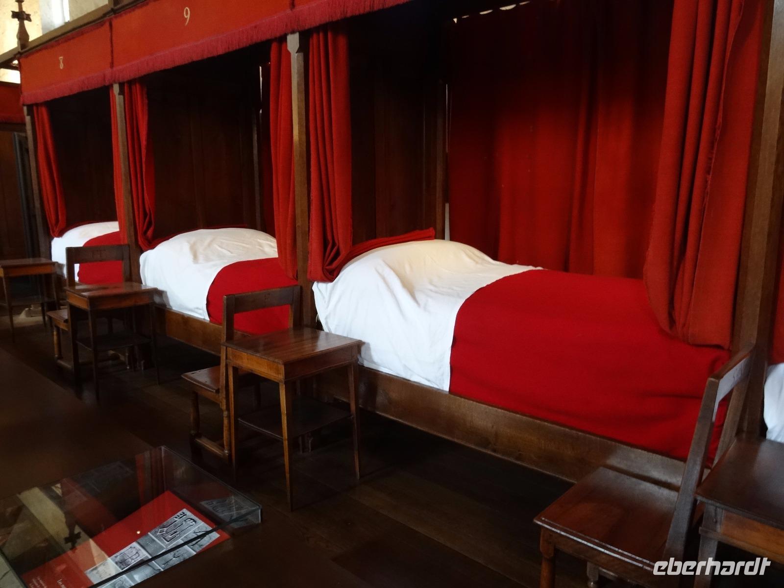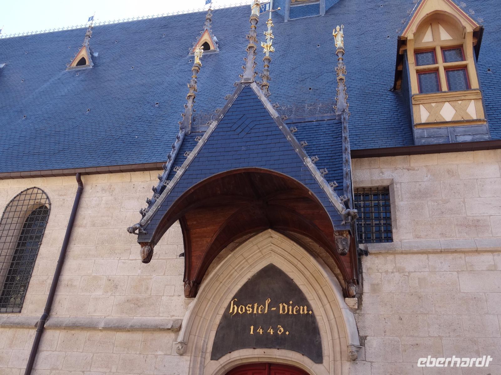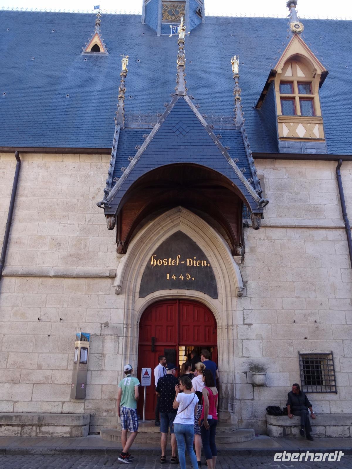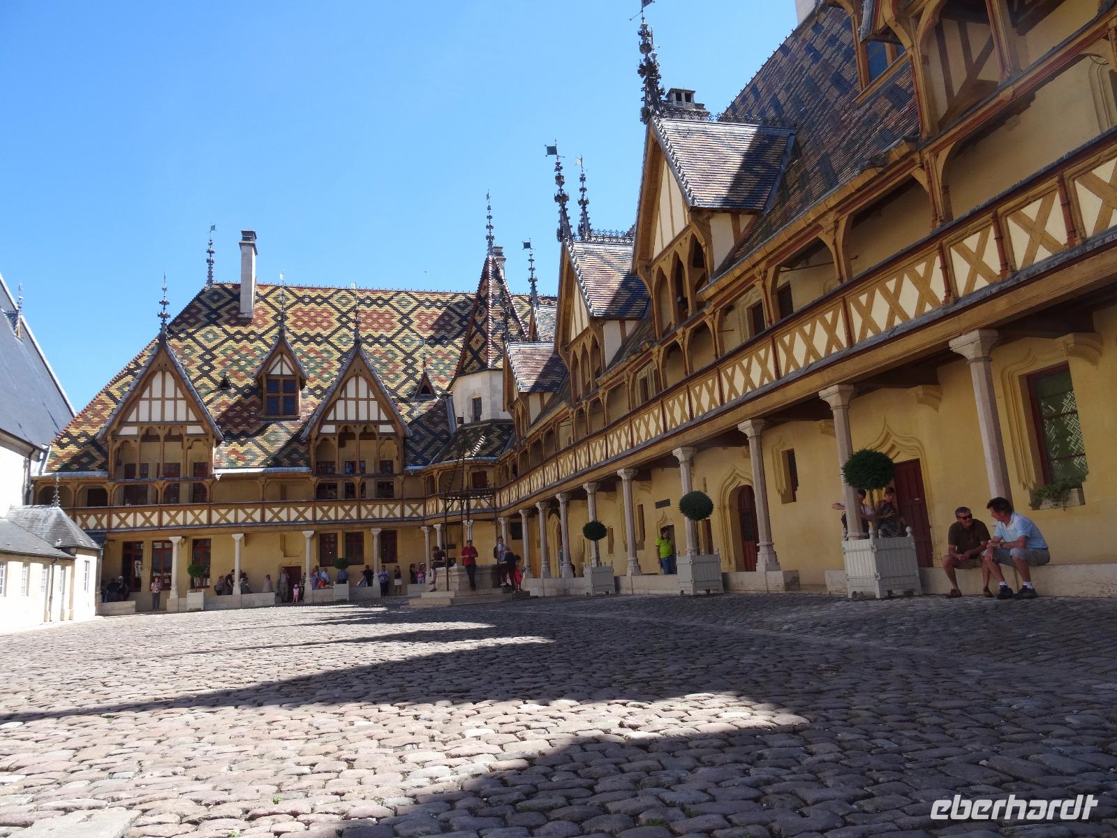 Entlang der "Route des Grands Crus" durch kleine verträumte Weindörfer erreichten wir den Ort Beaune mit dem berühmten mittelalterlichem Krankenhaus "Hotel Dieu". Dessen Gründer Nicolas Rolin hat dieses beispielhafte Krankenhaus im 14. Jahrhundert als "Palast für die Armen" errichten lassen und seither fungierte es über 500 Jahre zu diesem Zweck. Erst seit 1977 ist es Museum und Altersheim. Nicht nur das Museum an sich beeindruckt, sondern auch die Architektur des Hauses ist überwältigend. Die Dächer sind mit farbig glasierten Dachziegeln gedeckt. Wir besichtigten die Schlafsäle, Küche und Apotheke. Höhepunkt unter den vielen Kunstwerken ist ein "Wandteppich der tausend Blüten" und vor allem der Weltgerichtsaltar von Roger van der Weyden.