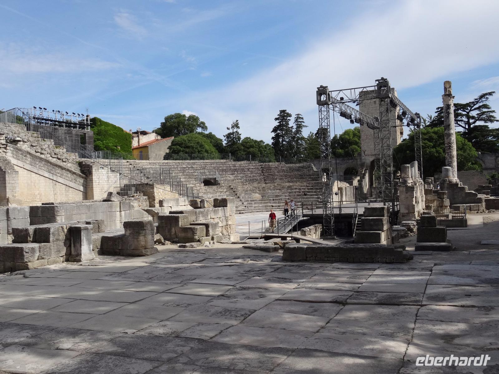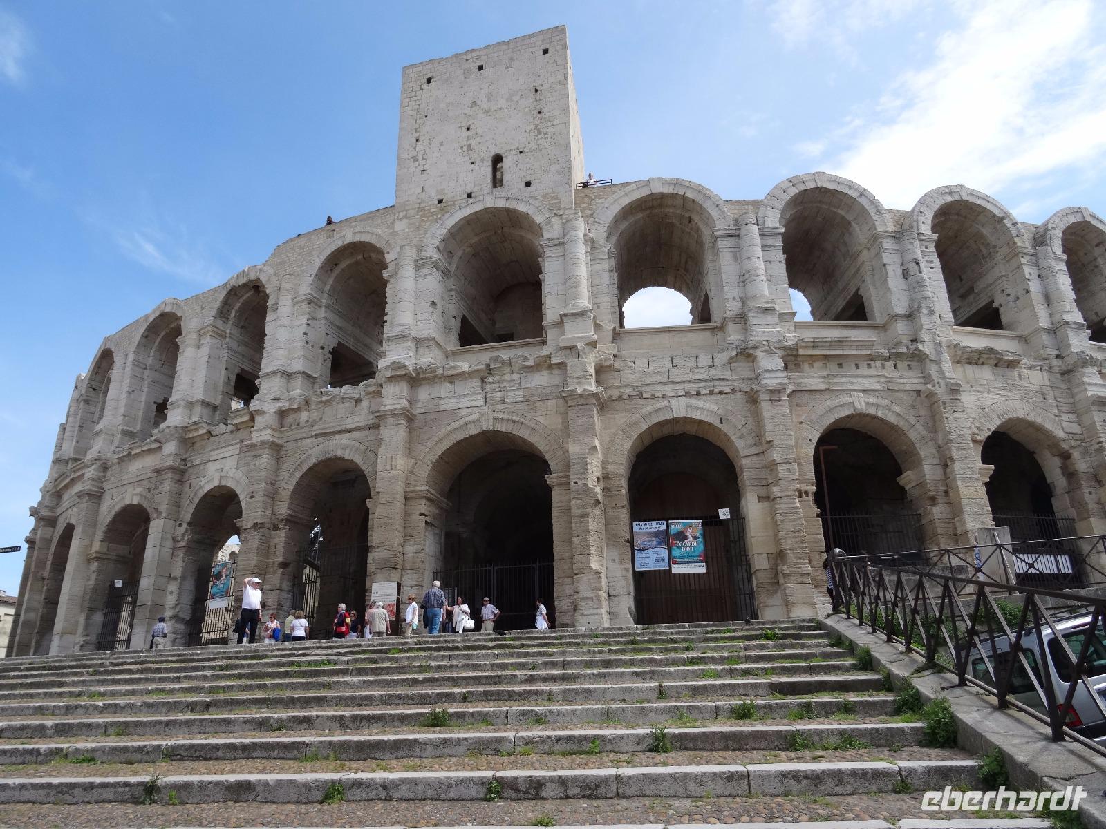 Oder anderseits Arles mit dem antiken Amphitheater=Arena, wo noch heute unblutige Stierkämpfe mit den Stieren der Camarque stattfinden. Übrigens können die Stiere 8 Mal kämpfen, wenn sie wollen. Dann gehen sie in ihre vollverdiente "Rente".