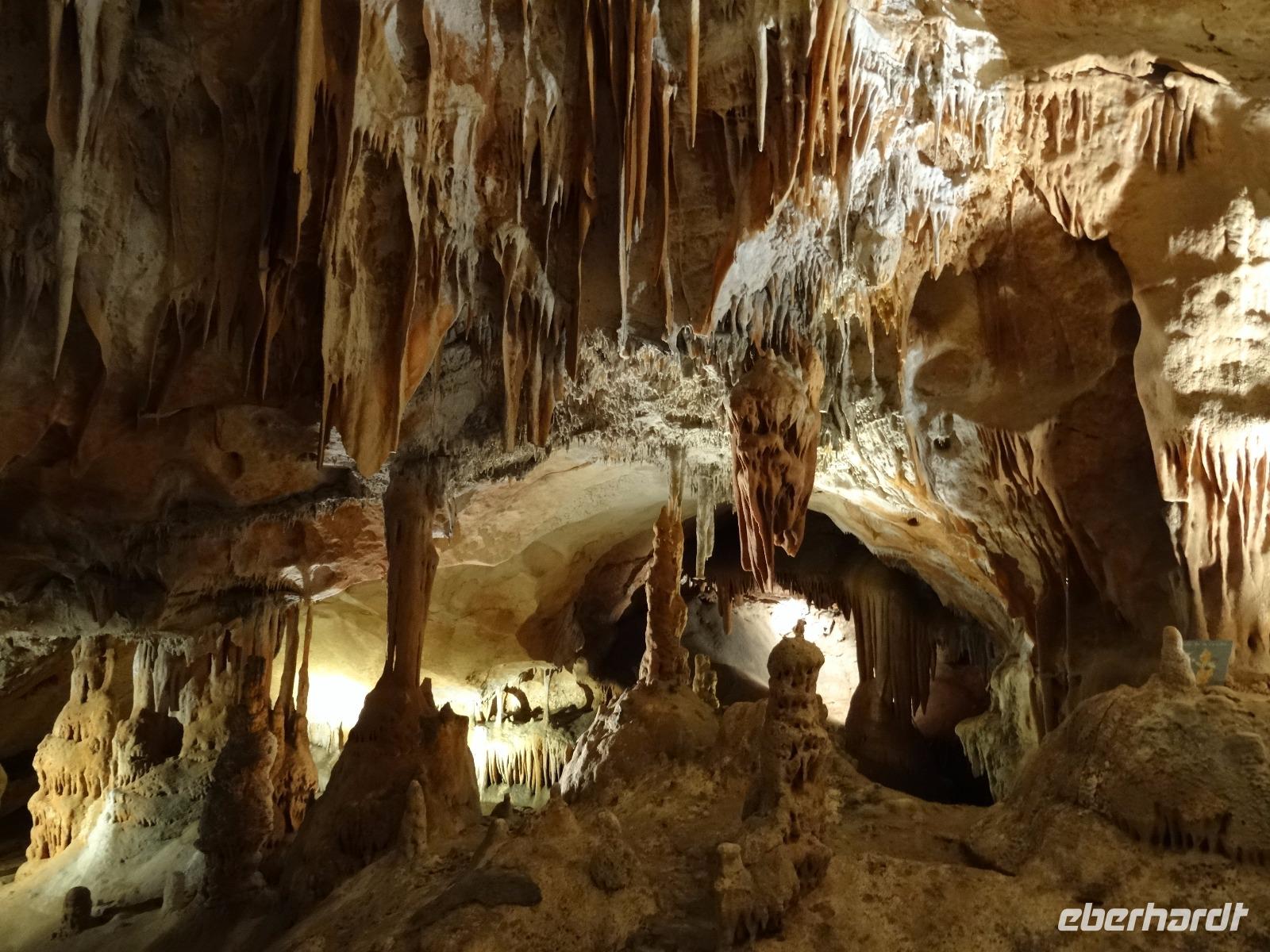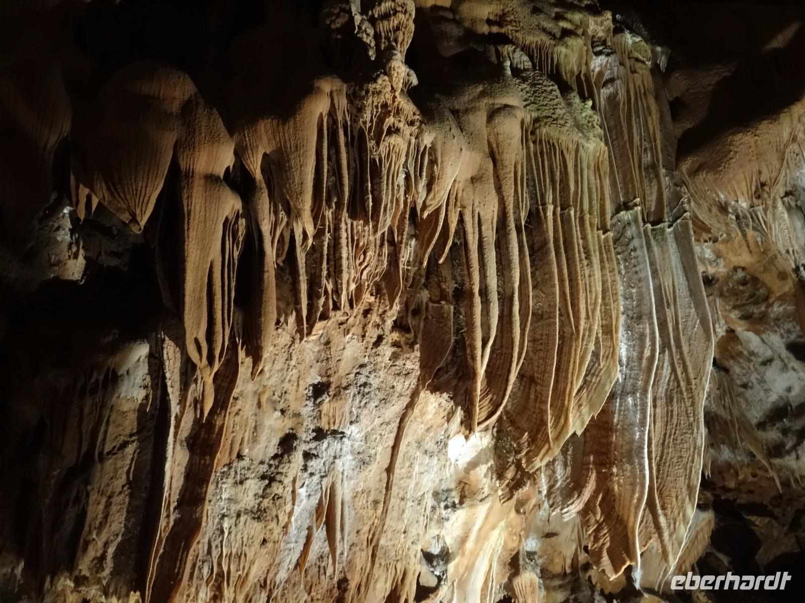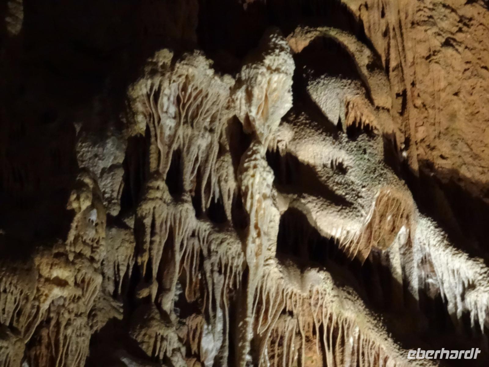 Wir fuhren zuerst zur natürlichen "Grotte de la Madeleine". Mutig stiegen wir die 174 ungleichmäßigen Stufen bei hoher Luftfeuchtigkeit 40 Meter tief hinab ins Innere der Grotte und bekamen eine kleine Musik- und Lichtershow zur Belohnung. Wer aus gesundheitlichen Gründen nicht mit einsteigen konnte, wurde mit einem für die Region typischen Kastanienlikör oder anderem Getränk sowie einem phantastischen Blick auf die Schluchten der Ardeche vor der Grotte entschädigt.