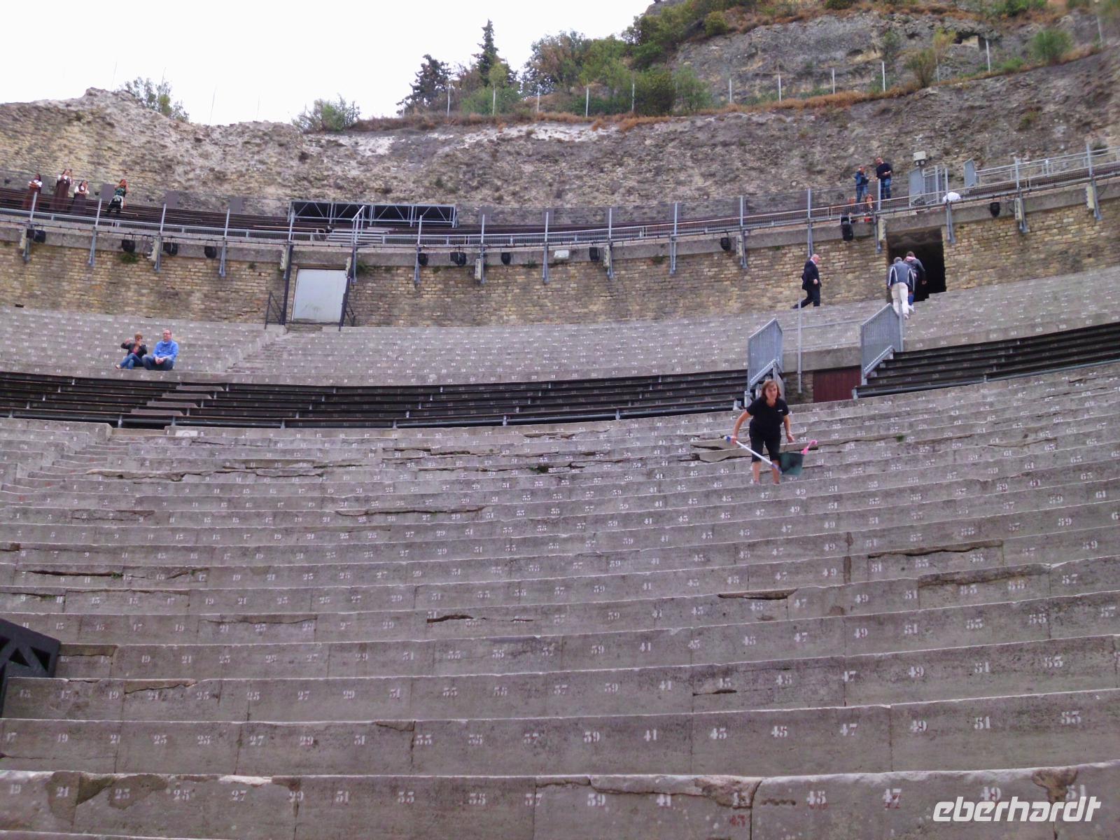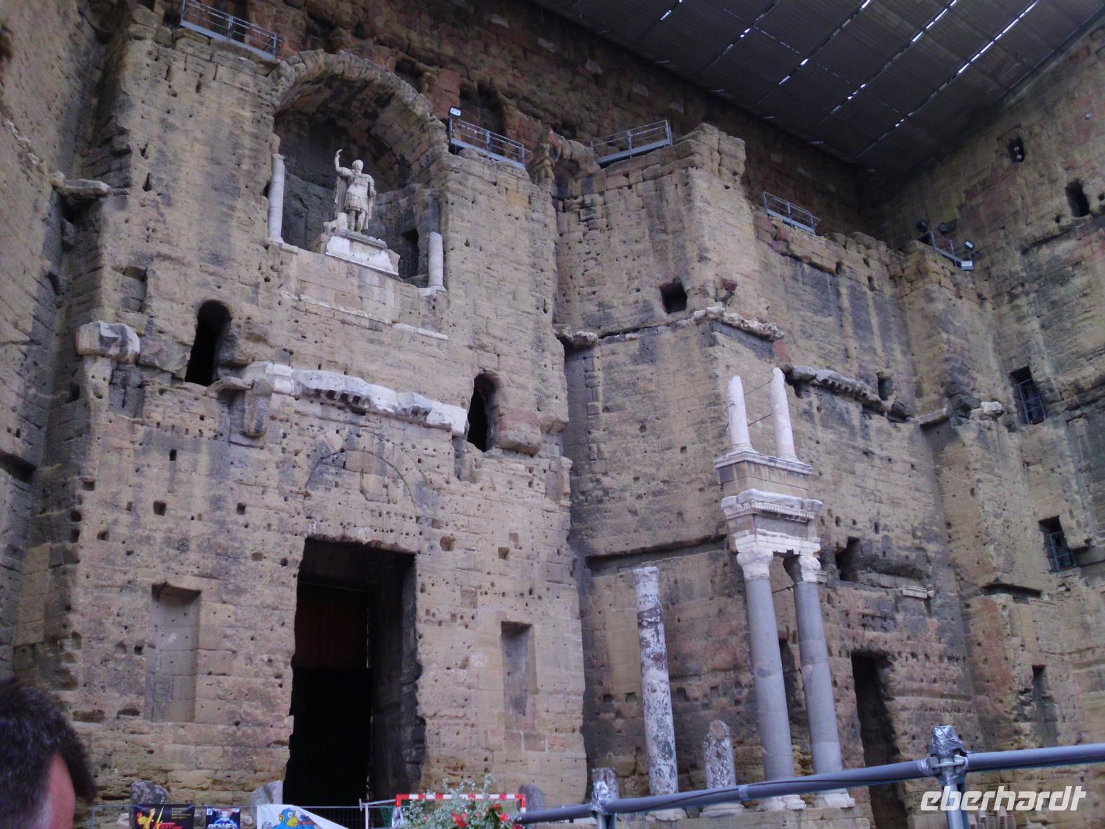 Von Lyon bis ans Mittelmeer erstreckt sich das Rhonetal, dessen Landschaften wir zu beiden Seiten bewundern können, immer markanter wird die Landschaft und die Architektur je mehr wir uns der Provence nähern. Kleine beschauliche Dörfer mit den typischen Steinhäusern sind zu sehen, viele thronen auf einem Hügel. Ein besonderes Erlebnis ist auch die Ein- und Ausfahrt in den zahlreichen Schleusen. 2 der größten Schleusen unserer Tour liegen auf diesem Streckenabschnitt und so passieren wir kurz vor Vivier die Schleuse Chateauneuf mit 18 Höhenmetern und wenig später die Schleuse Bollene mit 23 Höhenmetern. Dann beginnt auch der erste Ausflug am Nachmittag in die Stadt Orange. Es gibt einen kurzen Stop in Chateneuf du Pape, damit die Gäste in ihre Ausflugsbusse einsteigen können. Vorbei am großen Weinanbaugebiet Chateneuf du Pape erfahren wir über den Weinanbau, dessen Reben hier vor allem auf steinigem Boden wachsen. Orange ist das Eingangstor zur Provence, ein Ort mit 30.000 Einwohnern und berühmt für seinen 2000 Jahre alten Triumphbogen und sein antikes Amphitheater, welches wir besichtigen. Die Besonderheit dieses Amphitheater ist, das selbst die imposante riesige Bühnenwand noch steht und eine herrliche Kulisse für Aufführungen bietet.