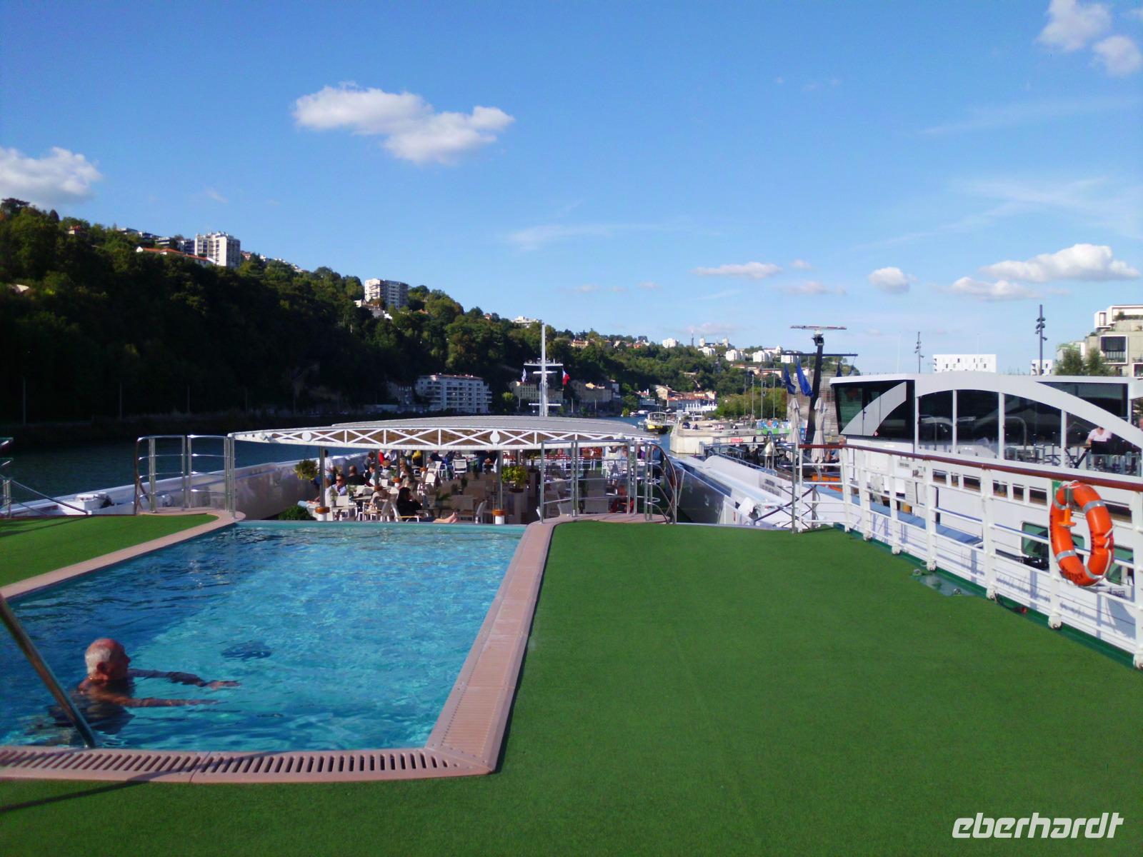 Nun endlich können wir Lyon in seiner ganzen Schönheit kennen lernen und begeben uns auf eine Stadtrundfahrt Lyon. Wir besichtigen die Kathedrale Notre Dame auf dem Hügel Fouvier, die hoch über der Stadt thront, später sind wir zu Besuch in einer Seidenweberei und dann geht es in das Altstadtviertel Vieux Lyon mit seinen herrlichen alten Geschäften und den Trabouliers (Hausdurchgänge), die die Seidenweber nutzten, um ihre Ballen trocken zu transportieren. Eigenartig, je nördlicher wir reisen, desto besser wird das Wetter. Die Sonne ist uns hold und wir genießen den Tag bei individuellem Landgang oder an Bord. Nun traut sich auch der Erste ins 26 Grad warme Poolwasser!