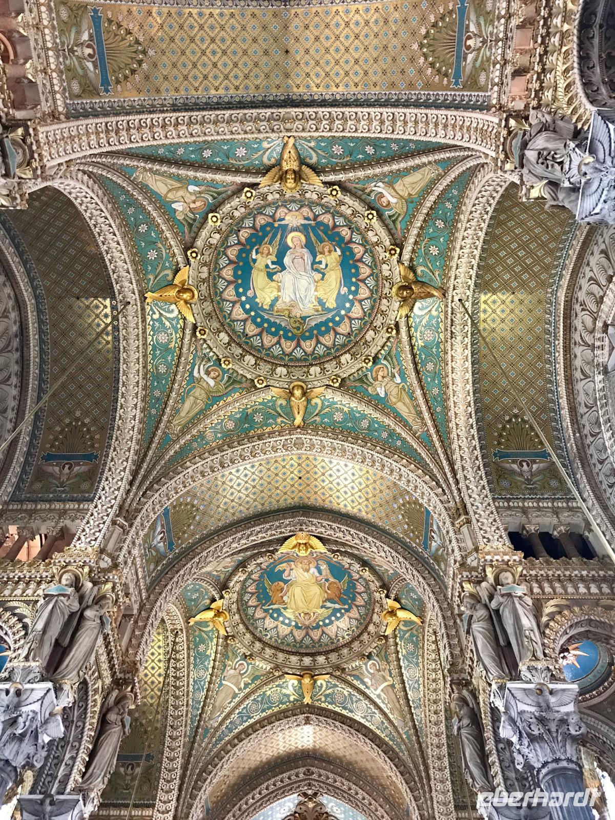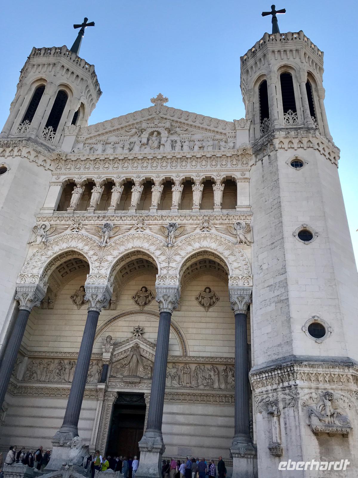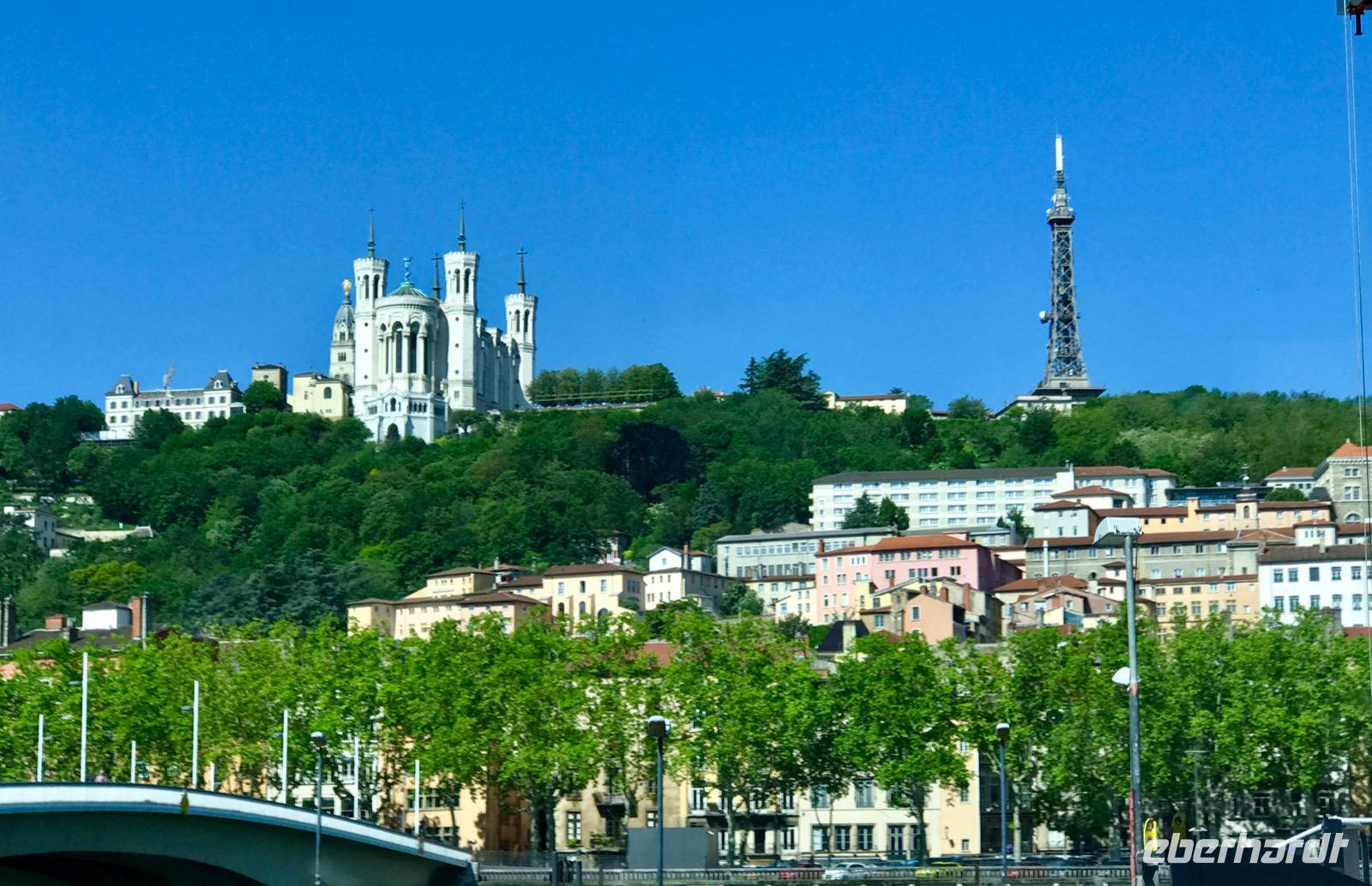 Am Vormittag haben wir zwei Möglichkeiten, an Ausflügen in die Stadt teilzunehmen. Eine Reisegruppe besucht Lyon und die Stadt der Seide und die andere Reisegruppe sieht sich Lyon und die Markthallen an. Lyon hat eine 2000-jährige Geschichte. Auf einer Stadtrundfahrt wird die Geschichte erlebbar, angefangen beim römischen Amphitheater, über die mittelalterlichen Bauten auf dem Hügel Fourvier, über die Renaissance-Architektur in der Altstadt Vieux Lyon bis zu den modernen Bauten, die sich vom Zusammenfluss der Rhone und Saone beim Stadtviertel Confluence bis zu unserer Anlegestelle hinziehen. Zunächst besichtigen wir die Basilika Notre-Dame-de-Fourviere, erbaut Ende des 19. Jahrhunderts, auf dem Fourviere-Hügel. Von hier hat man einen wunderbaren und umfassenden Blick auf die Stadt.