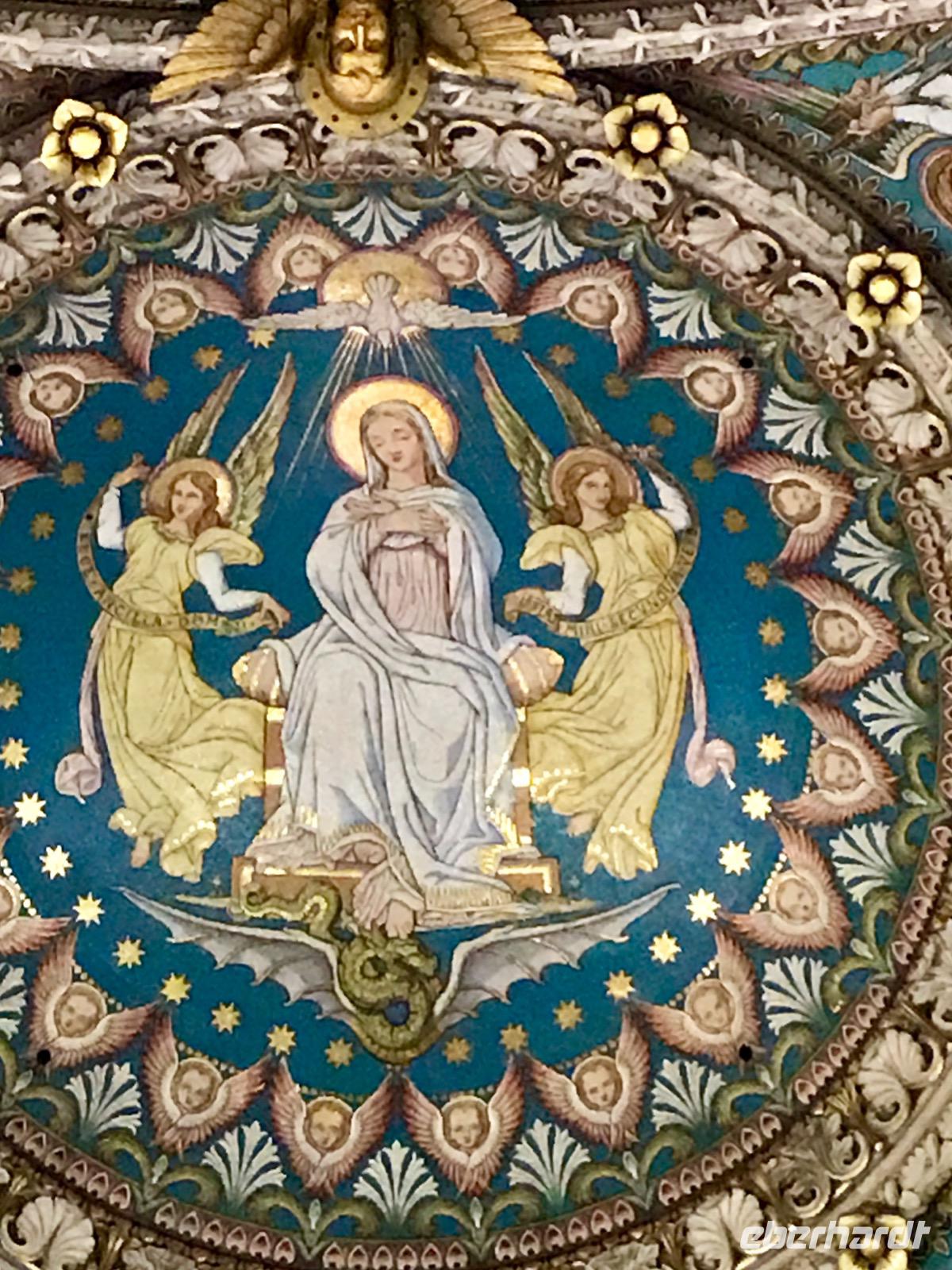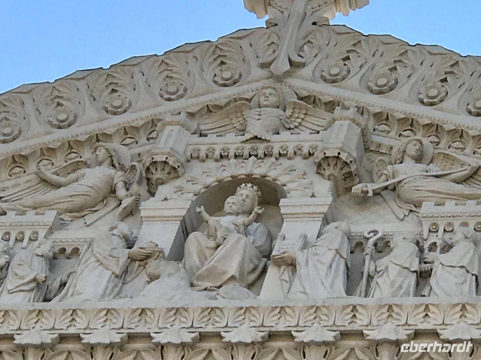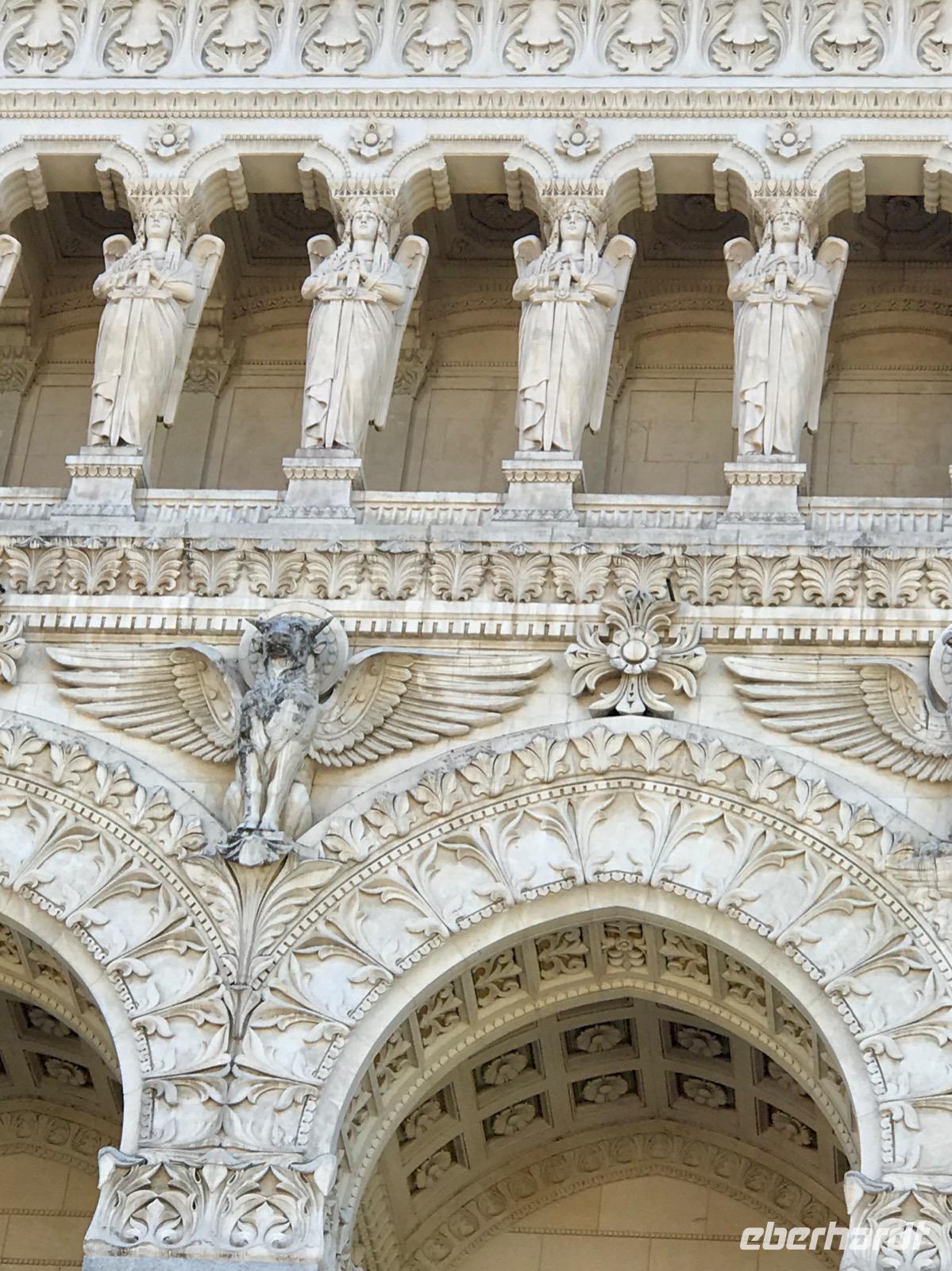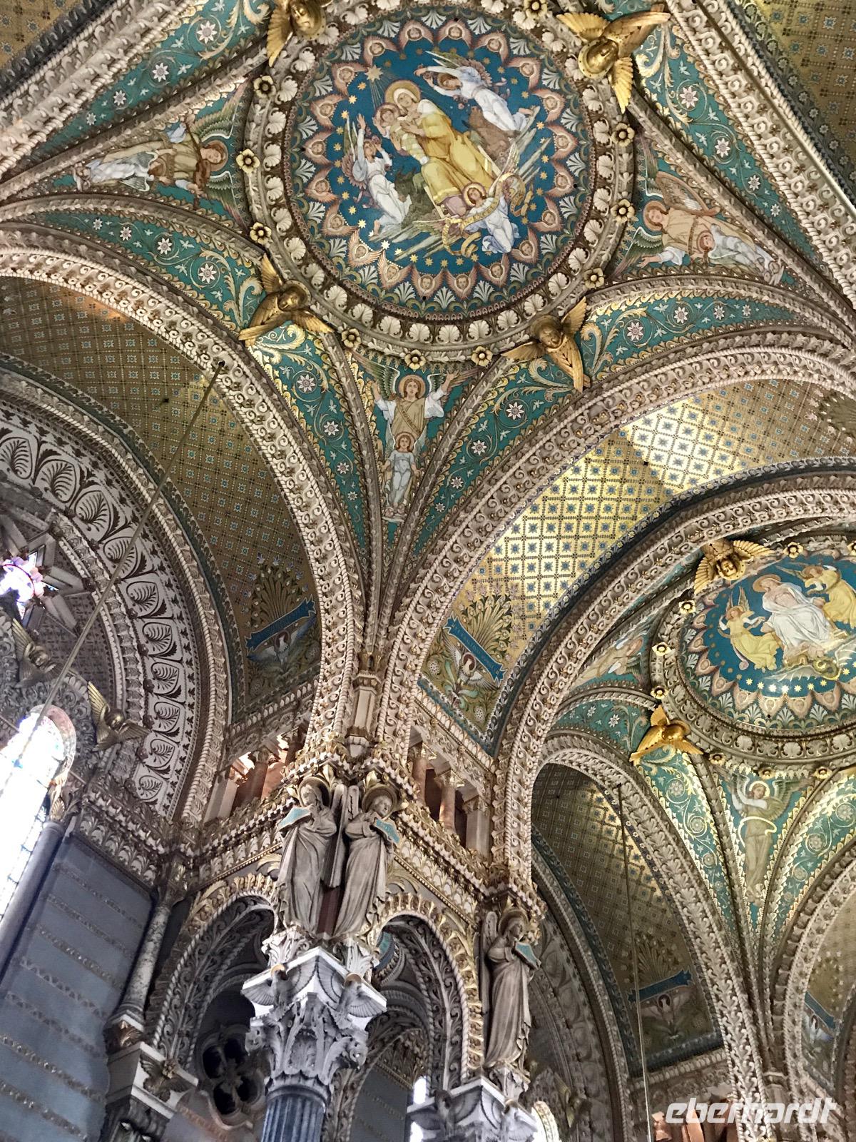 Am Vormittag haben wir zwei Möglichkeiten, an Ausflügen in die Stadt teilzunehmen. Eine Reisegruppe besucht Lyon und die Stadt der Seide und die andere Reisegruppe sieht sich Lyon und die Markthallen an. Lyon hat eine 2000-jährige Geschichte. Auf einer Stadtrundfahrt wird die Geschichte erlebbar, angefangen beim römischen Amphitheater, über die mittelalterlichen Bauten auf dem Hügel Fourvier, über die Renaissance-Architektur in der Altstadt Vieux Lyon bis zu den modernen Bauten, die sich vom Zusammenfluss der Rhone und Saone beim Stadtviertel Confluence bis zu unserer Anlegestelle hinziehen. Zunächst besichtigen wir die Basilika Notre-Dame-de-Fourviere, erbaut Ende des 19. Jahrhunderts, auf dem Fourviere-Hügel. Von hier hat man einen wunderbaren und umfassenden Blick auf die Stadt.