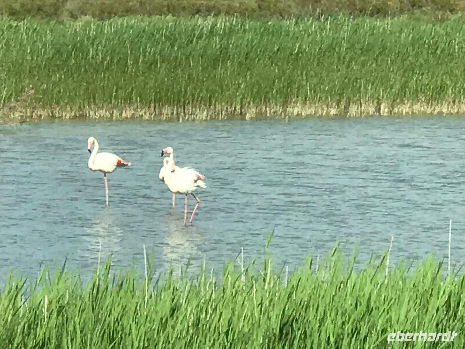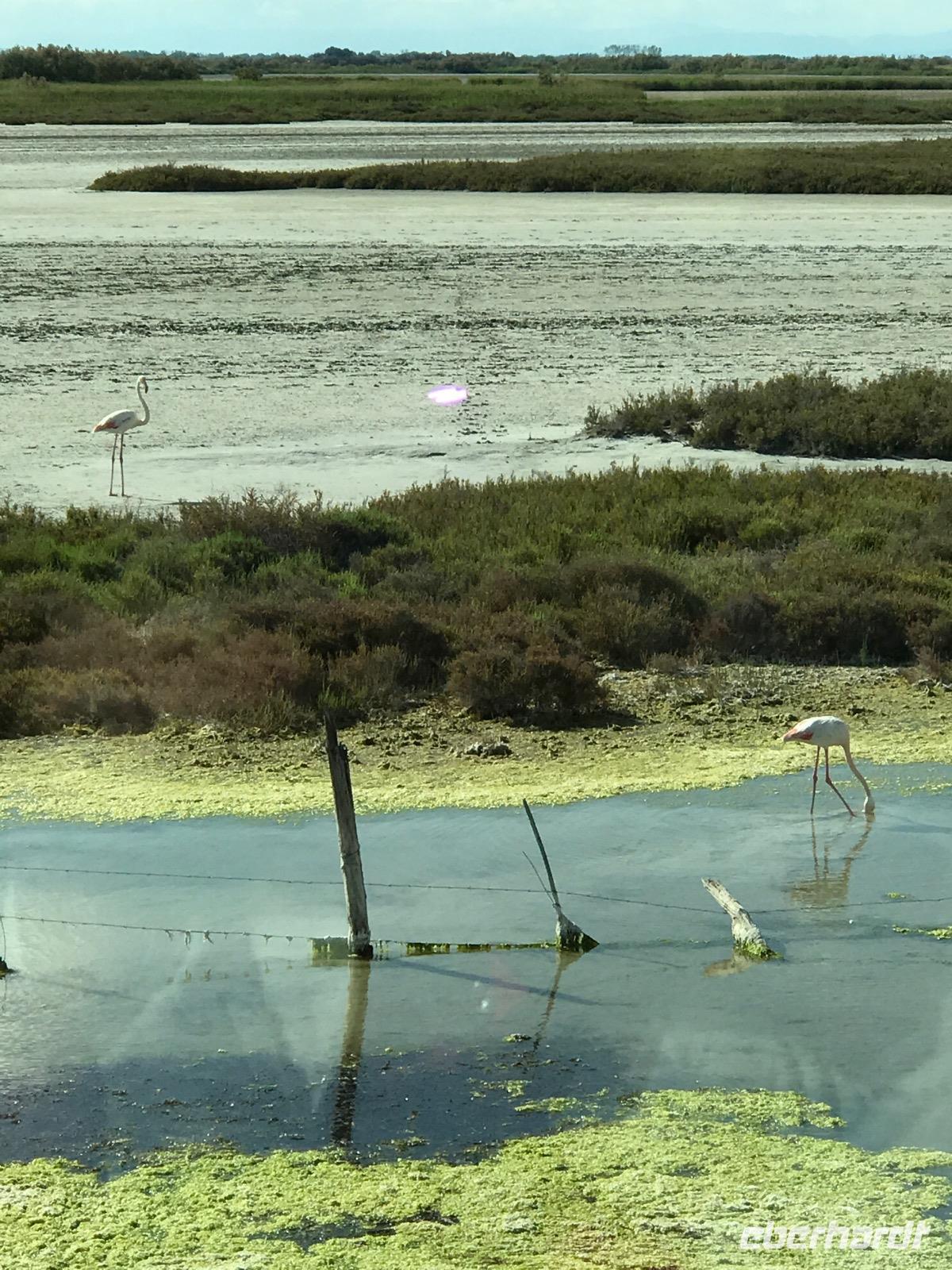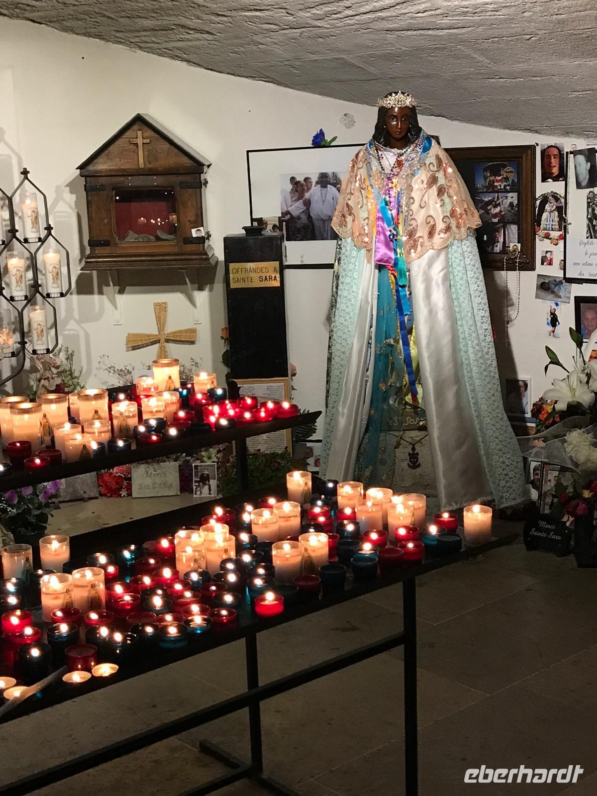 Andere Reisegäste nehmen den Ausflug in die Camargue wahr, per Bus oder gar per Jeep. Eine Naturliebhaberfahrt in das Schwemmland des Rhone-Deltas. Es ist eine beindruckende Landschaft, eine mit 400 Arten reiche Wasservogelwelt. Leider bleiben uns die Namen von vielen Vögeln, die wir sehen verborgen. Aber den großen Flamingo sehen wir in den weiten Wasserflächen, wie er den Hals beugt und das Wasser durch seinen Schnabel filtert, immer auf der Suche nach Nahrung. Da sind sie auch die freilebenden und doch beaufsichtigten weißen Pferde einer ganz besonderen Pferderasse und die schwarzen Stiere der Camargue, deren Hörner immer nach oben gen Himmel zeigen. Sie werden wegen des Fleisches gehalten. Wir lernen auch etwas über die Pflanzen, die hier wachsen, und erfahren vom Reisanbau. Unser Ausflug endet am Mittelmeer in Les-Saint-Maries-de-la-Mer, dem kleinen Wallfahrtsort der Sinti und Roma. Hier finden wir in der zentralen Kirche die schwarze Madonna.