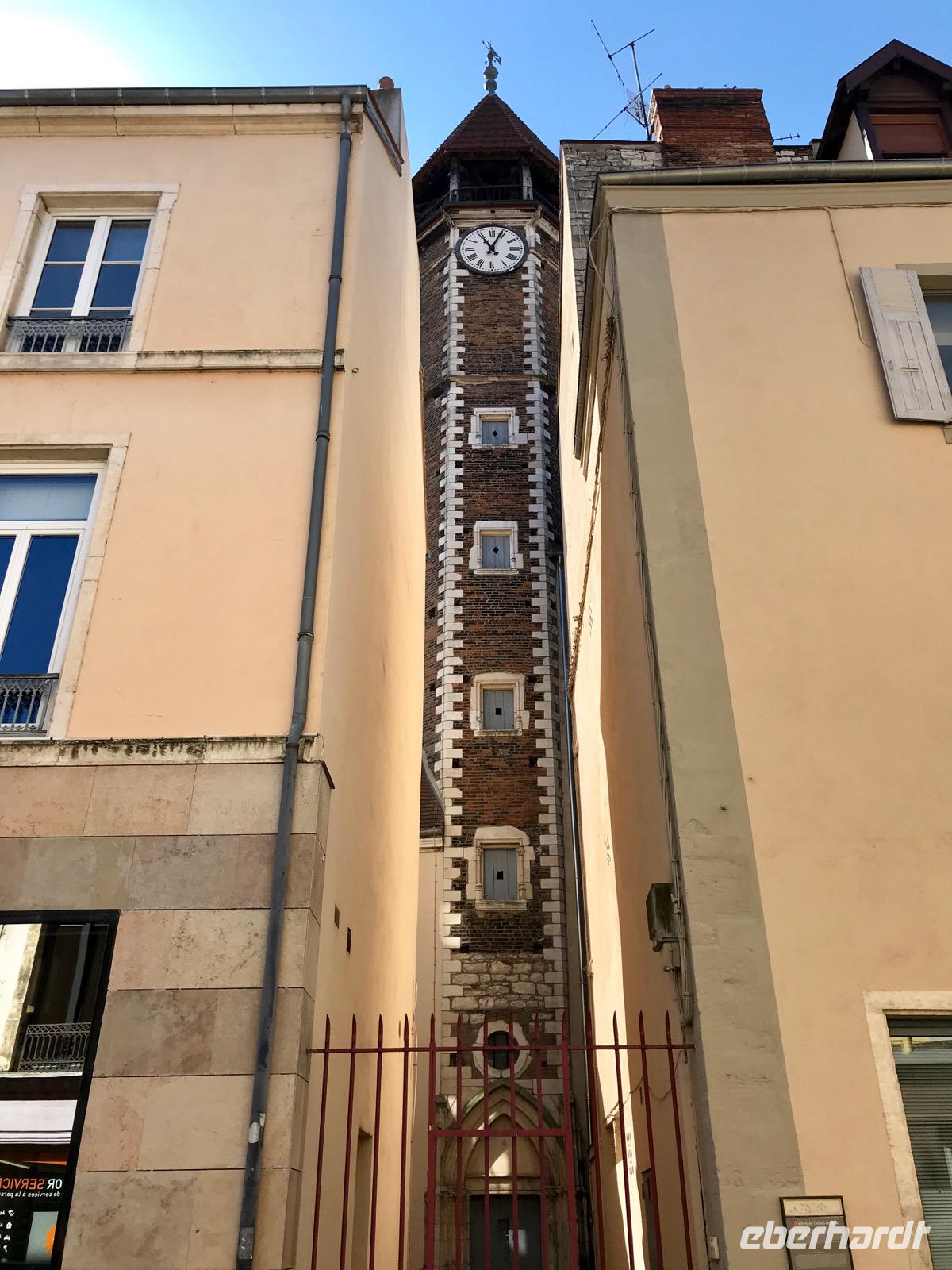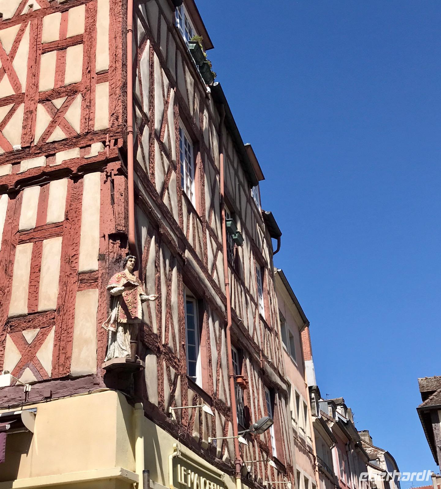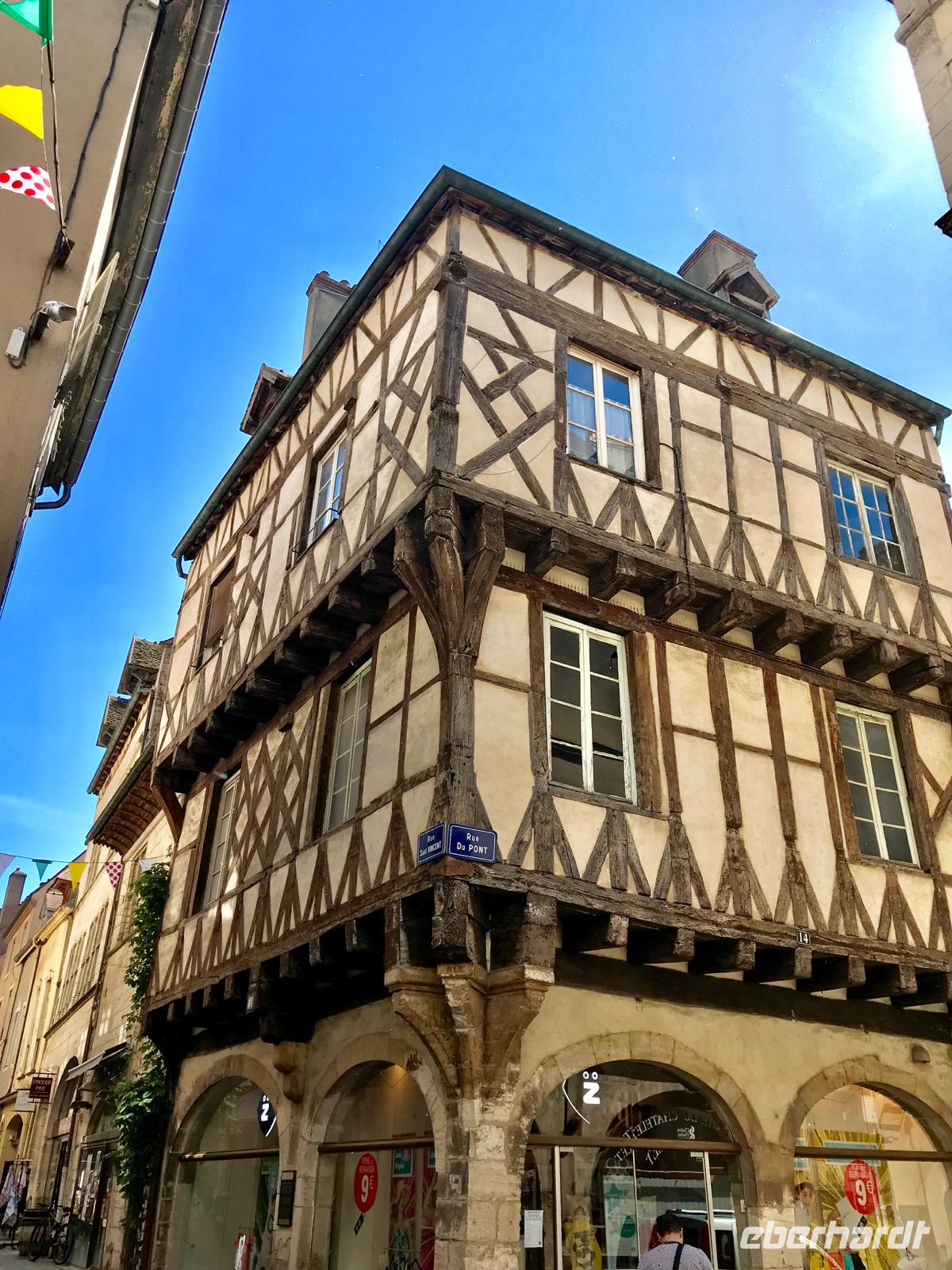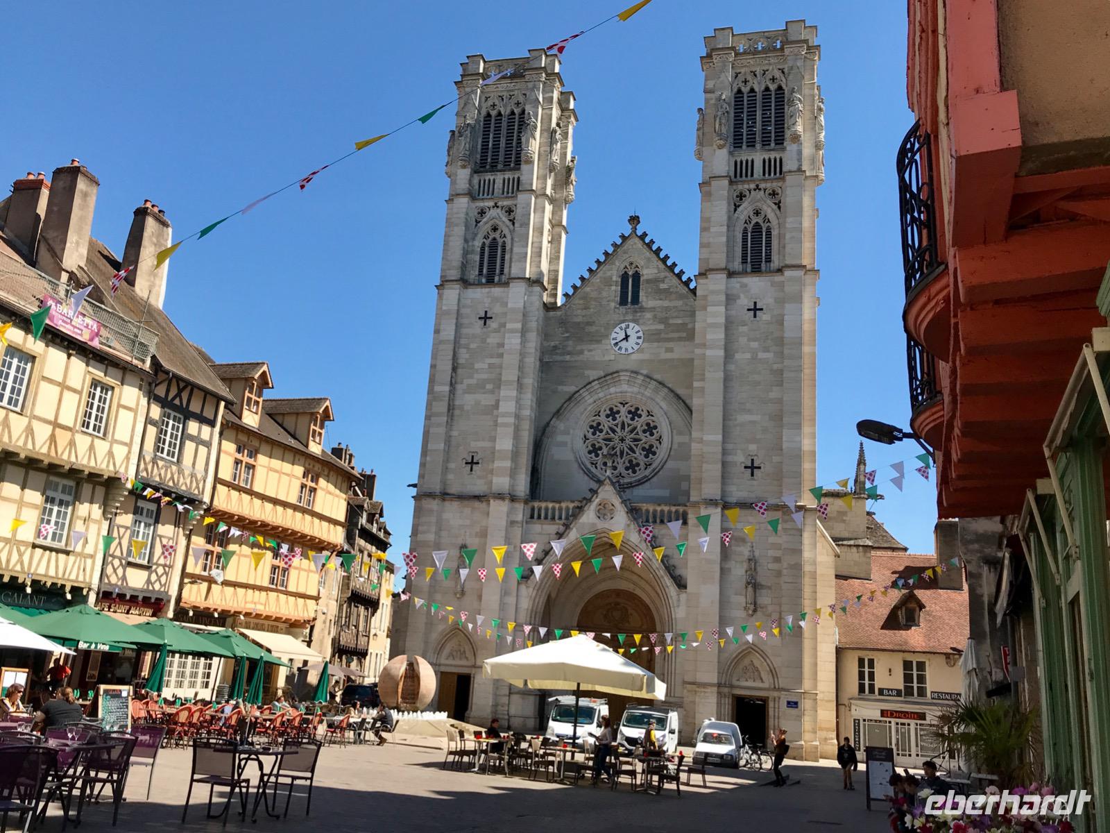 Andere Reisegäste erkunden individuell die kleine Stadt. Man kann sich nicht verlaufen, alle Wege führen zurück zur Uferstraße und zu unserem Schiff. Am Morgen dauert es eine Weile ehe die Stadt erwacht, die Ladenbesitzer öffnen die Türen, die Gaststättenbesitzer stellen die Gassen und Plätze mit Tischen und Stühlen voll. Alles macht einen beruhigenden Eindruck, die deutsche Hektik wollen wir hier gern vergessen. Im Zentrum der Stadt liegt der Platz St. Vicent mit der Kathedrale St. Vicent aus dem 13.-15. Jahrhundert und einer Reihe schöner Fachwerkhäuser. Im südlichen Viertel der Stadt an der Saone finden wir alte Häuser aus den vergangenen Jahrhunderten, liebevoll restauriert.