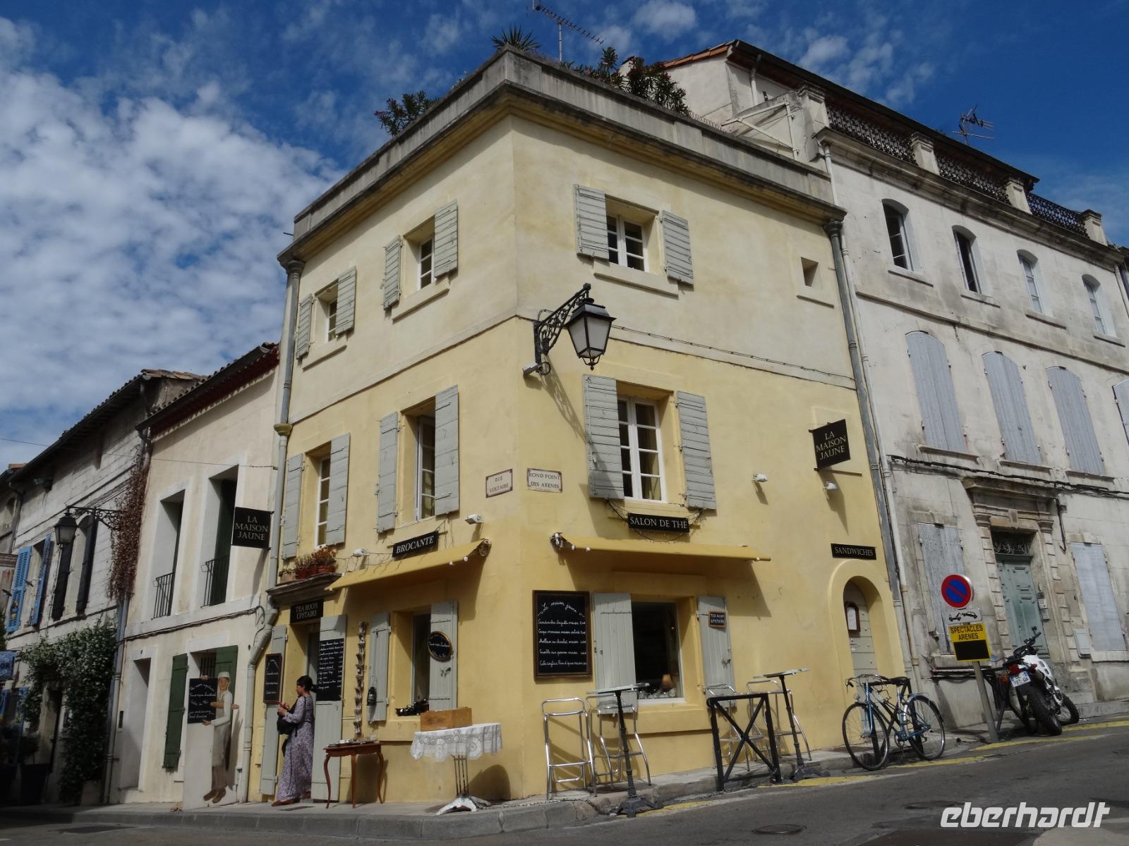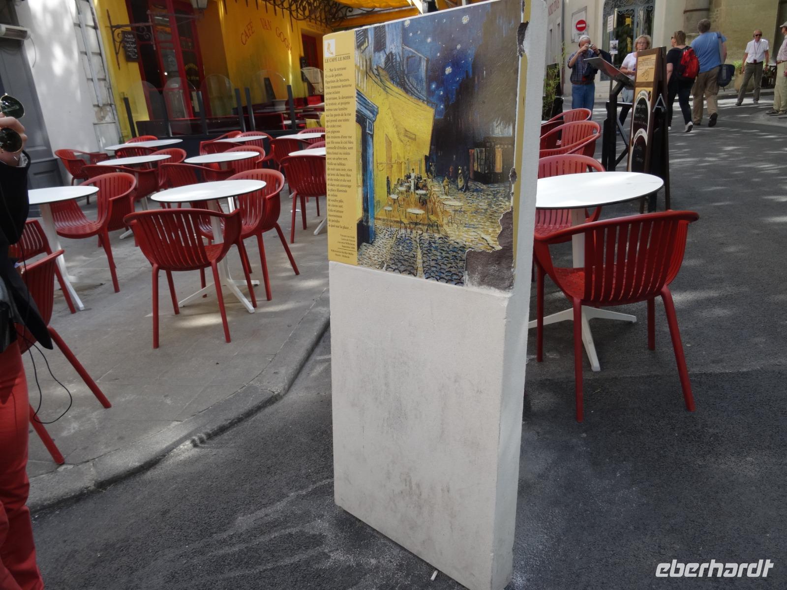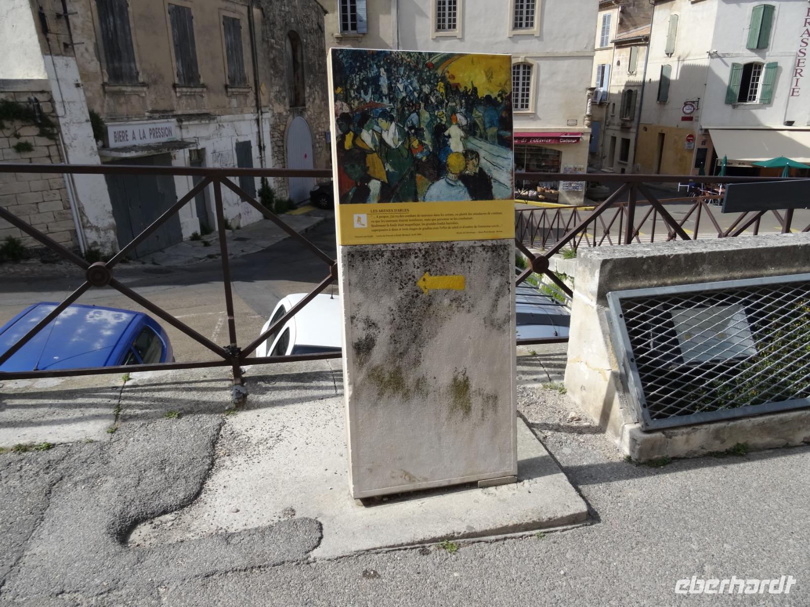 In Arles geht auch nichts ohne Vicent van Gogh. Er fand hier so etwas wie seine zweite Heimat. Die Stadt verehrt ihn unter anderem damit, dass sie überall, wo der Maler seine Staffelei aufgestellt und gemalt hatte, Markierungen in den Fußweg einbrachte. Van Gogh seinerseits huldigte die Stadt mit seinem bekannten Gemälde "Die Brücke von Arles".