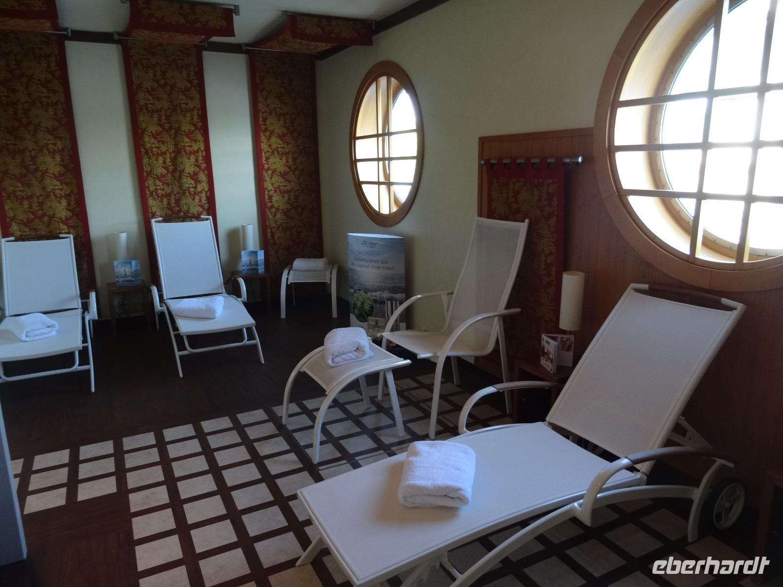 Wir genossen in Ruhe das erste exquisite Frühstück bei Kaiserwetter. Danach hatten wir bis zum frühen Nachmittag frei. Der Spa-Bereich war bereit, um sich "verschönern" zu lassen. Begehrt waren auch die Plätze auf dem Sonnendeck, wo man von den Strahlen der Sonne gekitztelt mit einem Drink in der Hand entspannt einen der vielen Schleusengänge live verfolgen konnte.