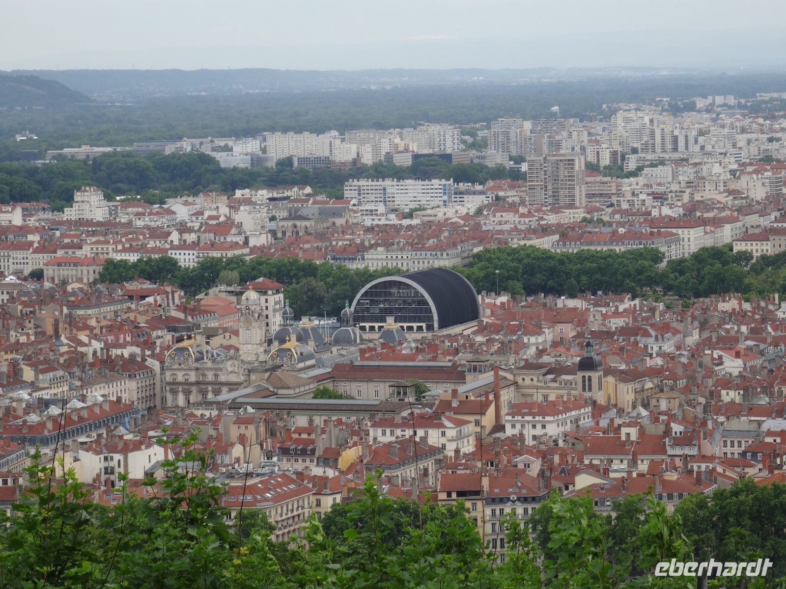Von hier bot sich ein faszinierender Blick auf die Stadt an den zwei Flüssen Rhone und Saone. Lyon ist eine grüne Stadt. Die Rhone ist durch eine Baumallee markiert. Den Fluss selbst sieht man aber nicht.