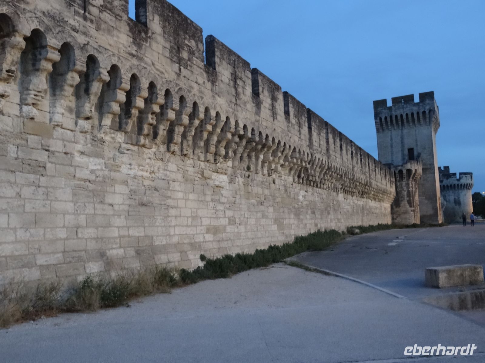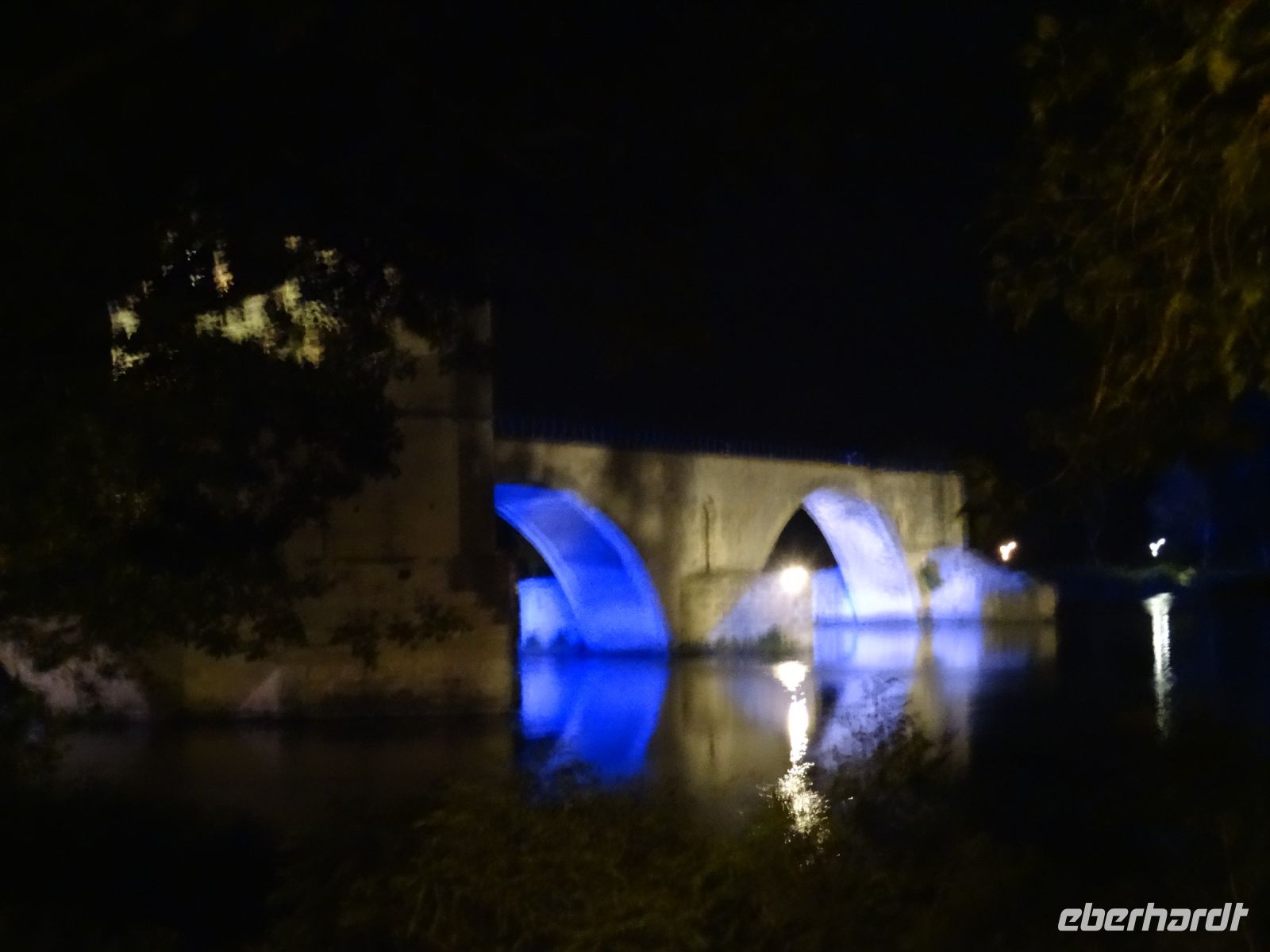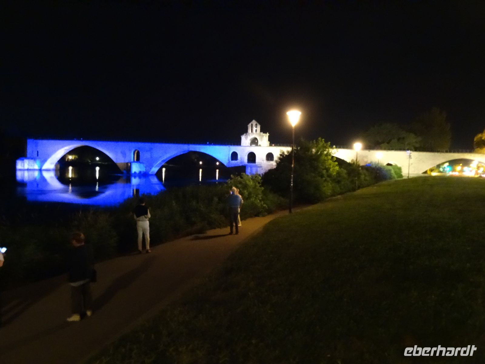 Es dämmerte bereits als wir zu unserem Spaziergang durch die Altstadt von Avignon aufbrachen. Wir liefen durch eines von 13 Stadttoren der dicken Stadtmauer, welche vier Kilometer lang ist. Vorbei am Theater, Rathaus, Synagoge und der Kirche Saint Pierre gelangten wir zum monumental beeindruckenden Papstpalast. Spektakulär beleuchtet, wirkt er noch gewaltiger als bei Tag. Nicht weniger beeindruckend war der folgende Blick auf die berühmte Brücke "Saint Benzet" aus dem bekannten Lied "Sur le pont d'Avignon".