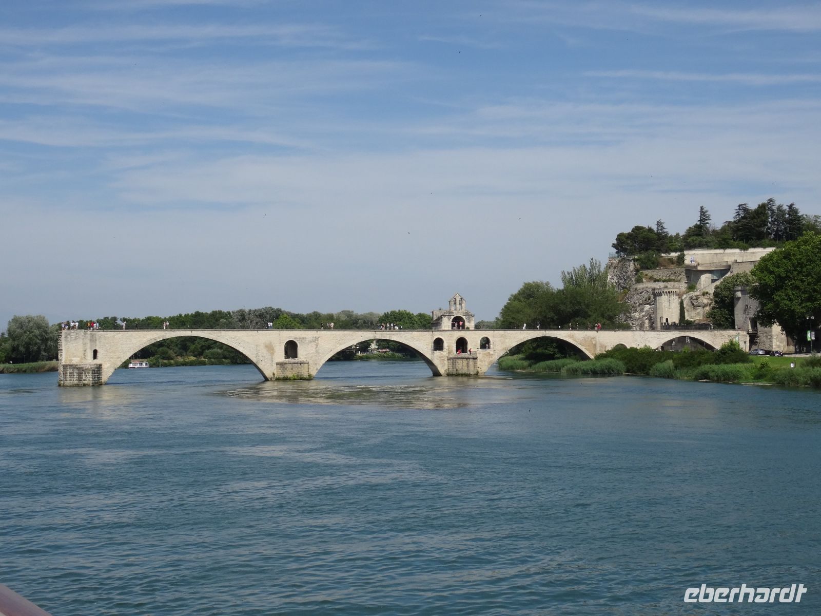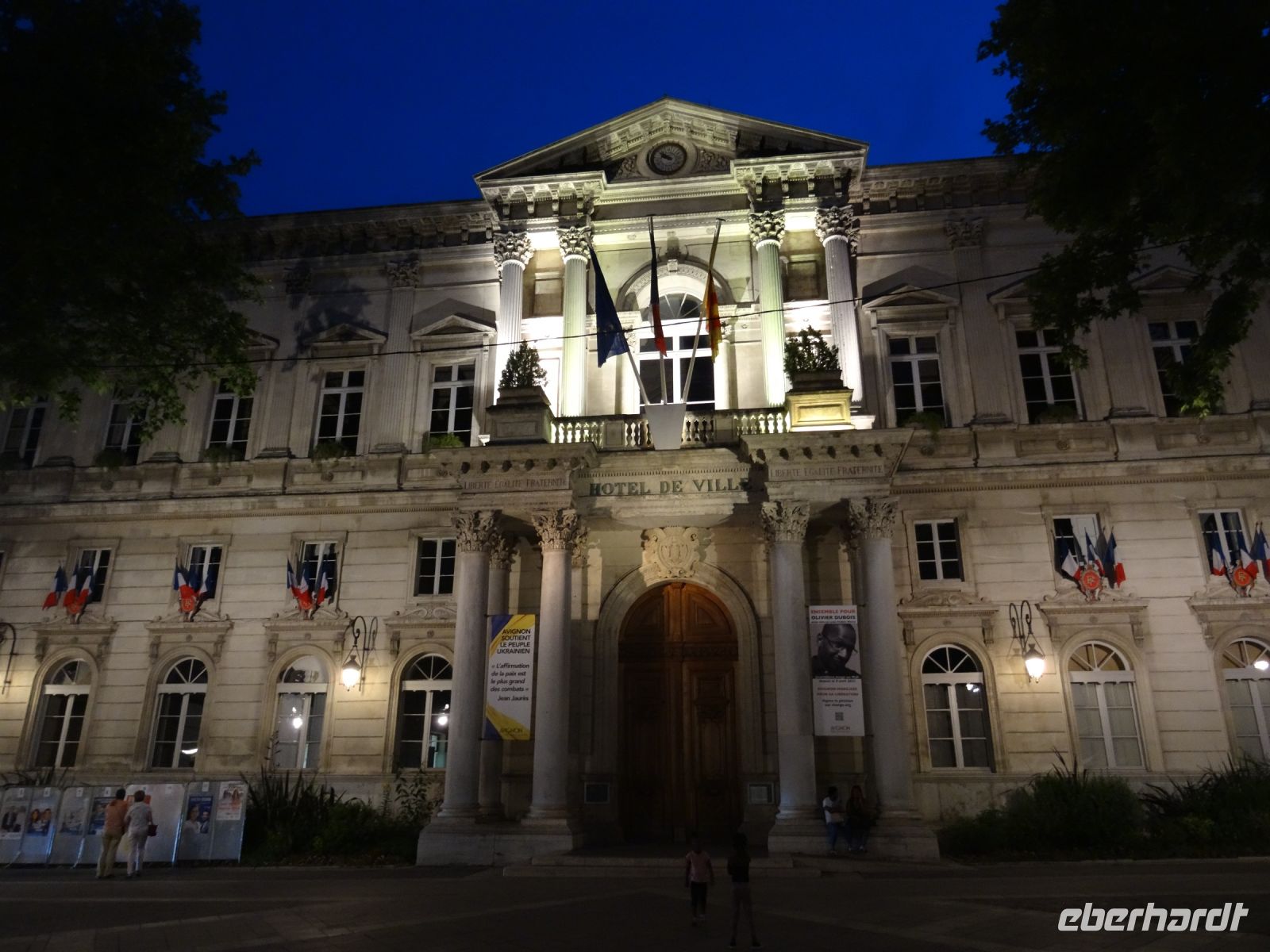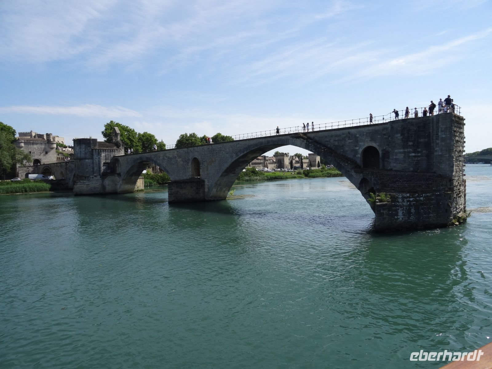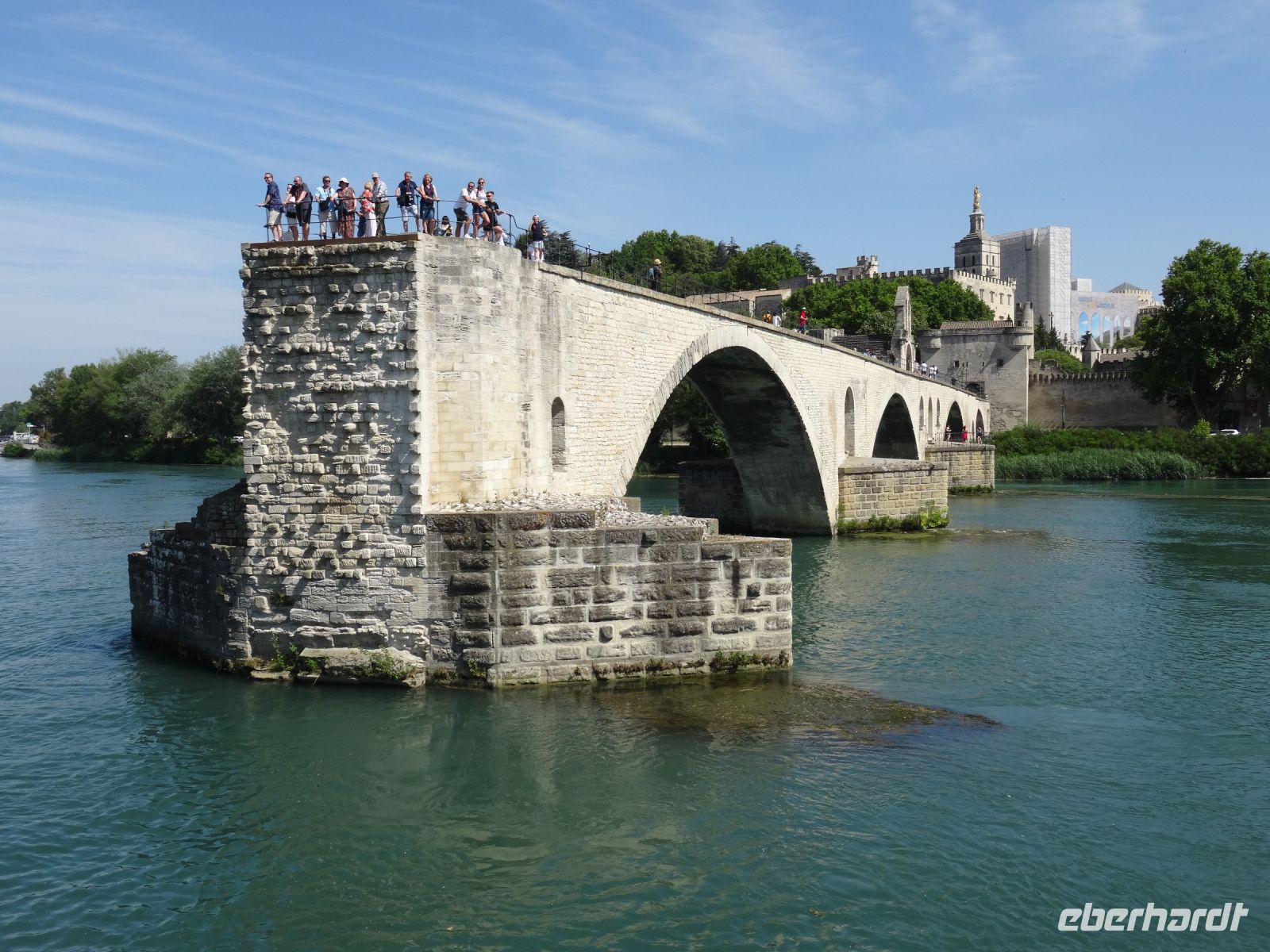 Es dämmerte bereits als wir zu unserem Spaziergang durch die Altstadt von Avignon aufbrachen. Wir liefen durch eines von 13 Stadttoren der dicken Stadtmauer, welche vier Kilometer lang ist. Vorbei am Theater, Rathaus, Synagoge und der Kirche Saint Pierre gelangten wir zum monumental beeindruckenden Papstpalast. Spektakulär beleuchtet, wirkt er noch gewaltiger als bei Tag. Nicht weniger beeindruckend war der folgende Blick auf die berühmte Brücke "Saint Benzet" aus dem bekannten Lied "Sur le pont d'Avignon".