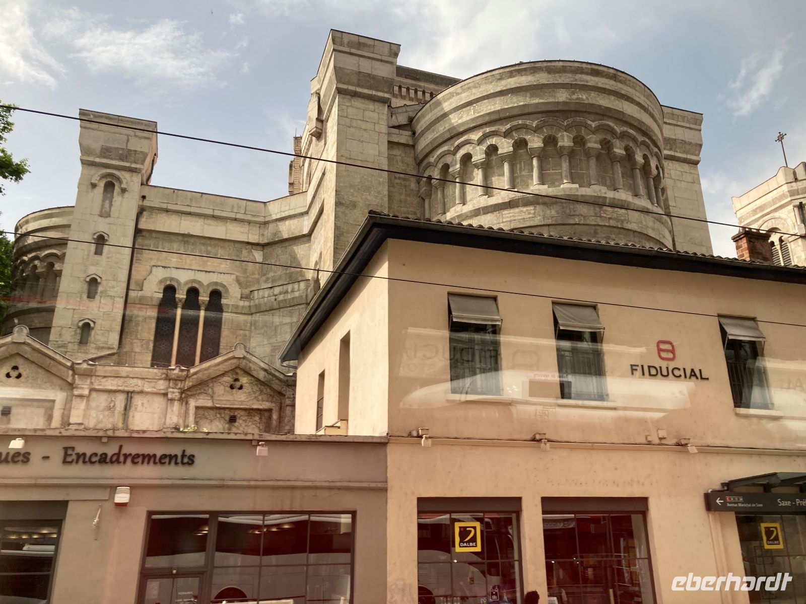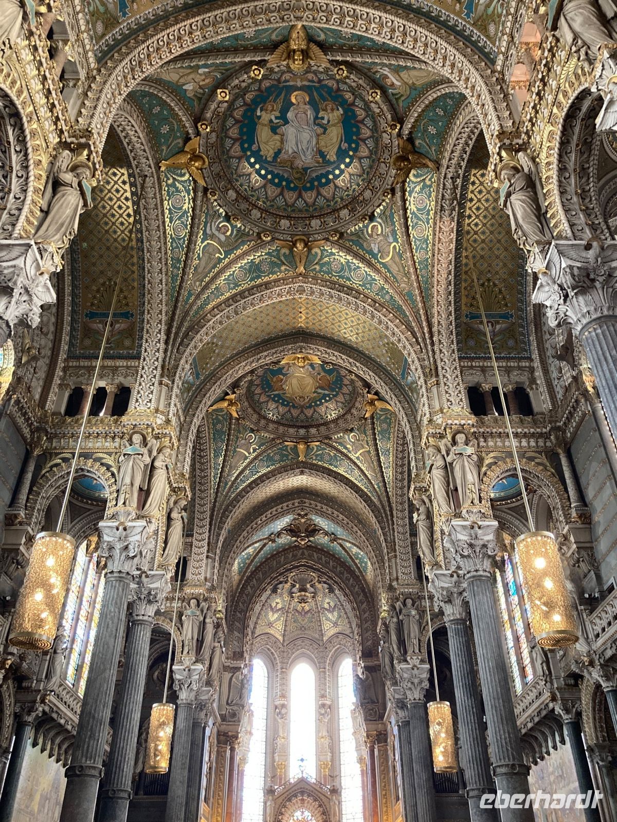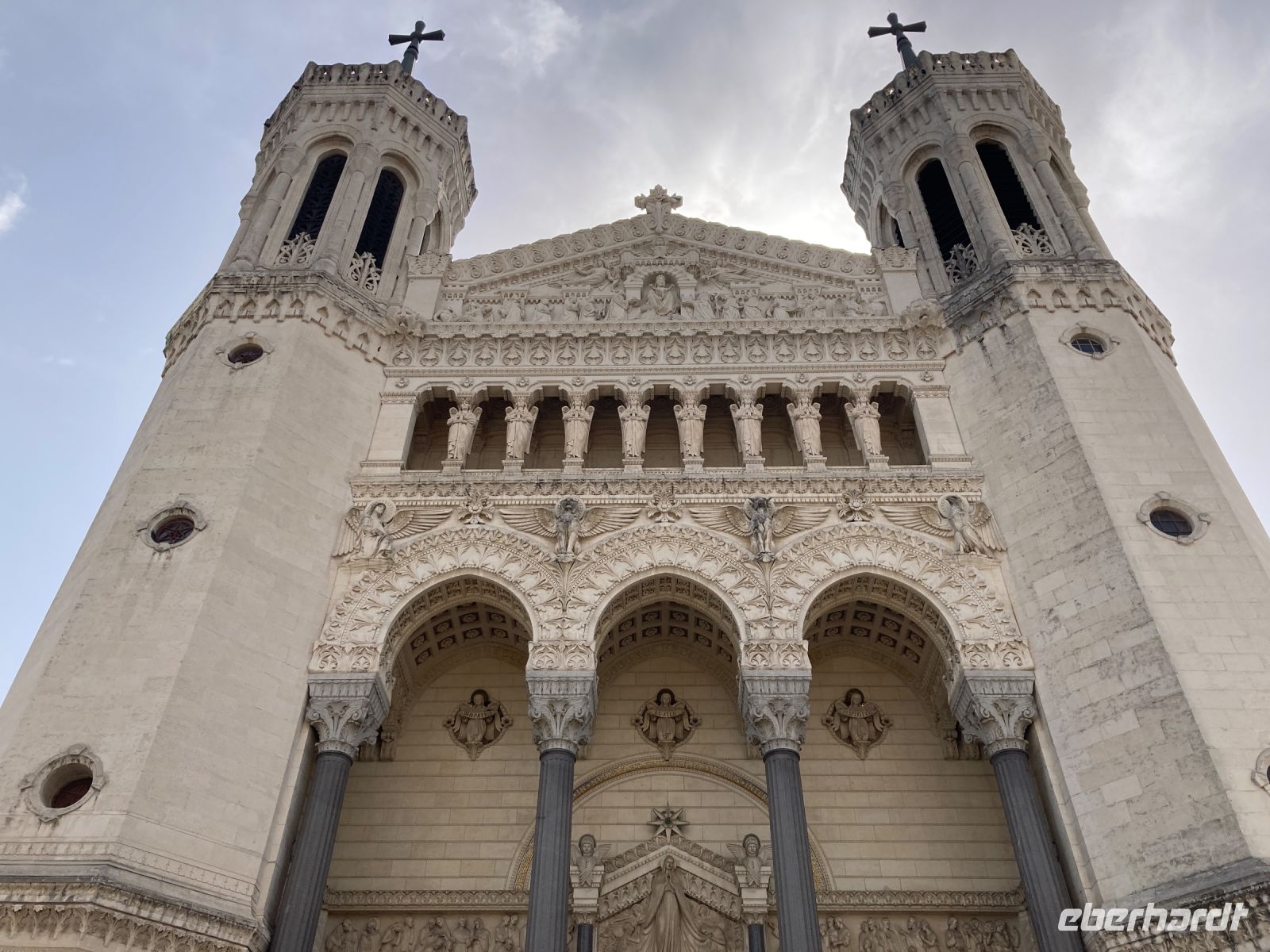 Am Morgen grüßt Lyon und natürlich wollen wir diese Stadt ein wenig besser kennenlernen. Mit den Stadtführerinnen geht es zunächst im Bus zur Markthalle, die den Namen des großen Kochs und Sohnes der Stadt Paul Bocuse trägt. Zugegeben, das Warenangebot ist äußerst verlockend. Allerdings so kurz nach dem Frühstück schon wieder essen? Aber bekanntlich kommt der Appetit ja mit dem Essen und so werden die Häppchen der unterschiedlichen Hartwürste und Käsesorten doch gerne probiert. Nach dem Gaumenschmaus steht nun ein wenig Stadthistorie auf dem Programm. Um sich einen besseren Überblick über Lyon zu verschaffen geht es hinauf zur Notre-Dame de Fourvière. Diese Wallfahrtskirche ist das Wahrzeichen von Lyon und dabei ist sie noch gar nicht so alt. Erbaut wurde sie ab 1872, um schließlich 1896 geweiht zu werden. Trotz ihres kirchengeschichtlich jungen Alters, hat sie den Besuch eines Papstes zu melden.