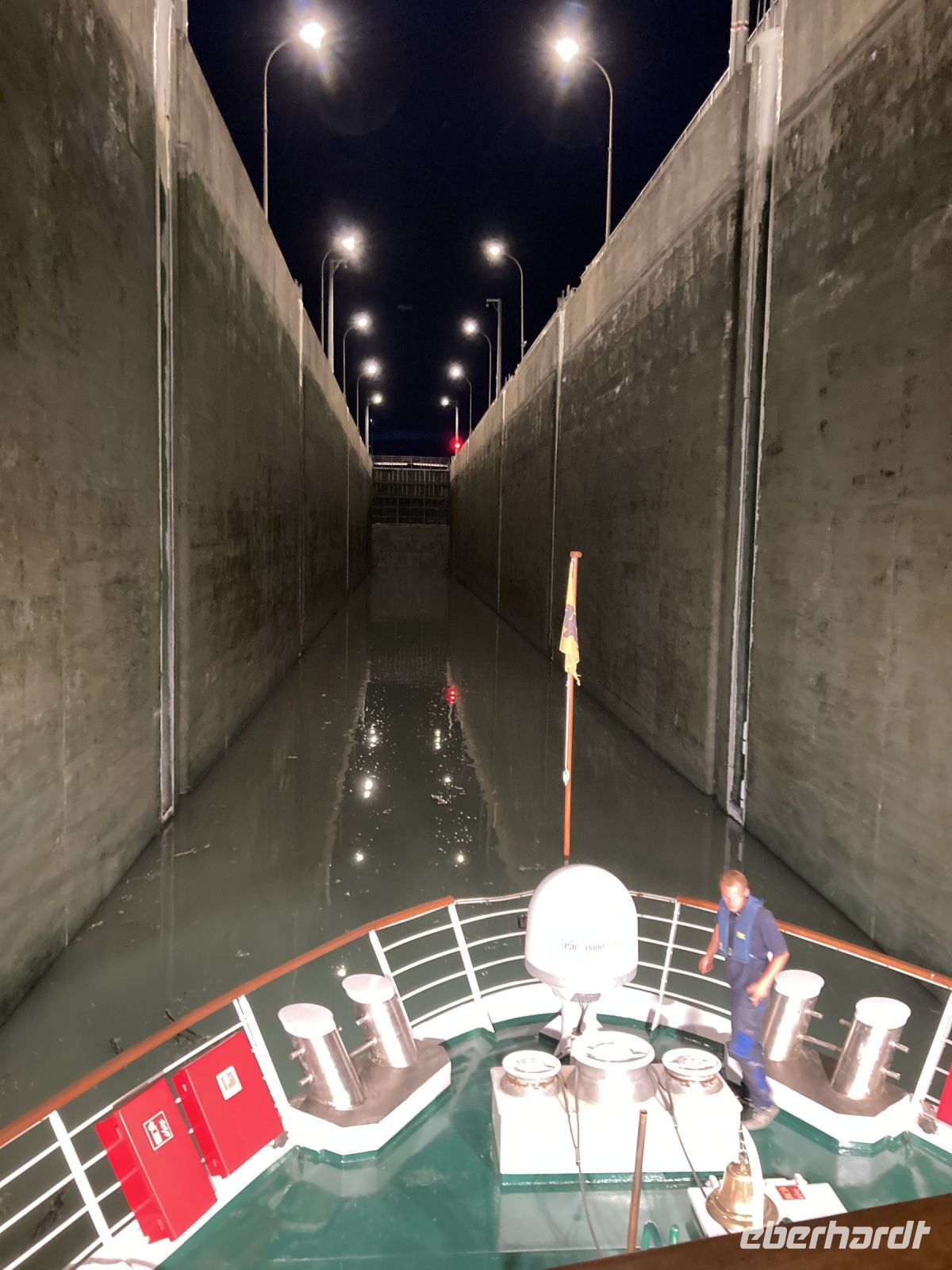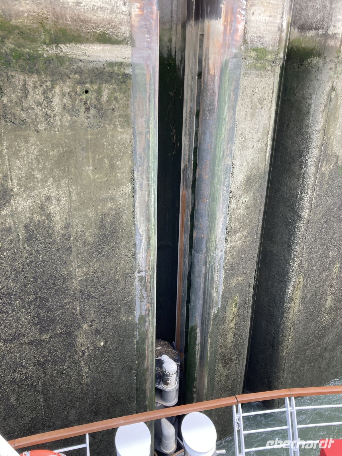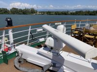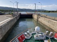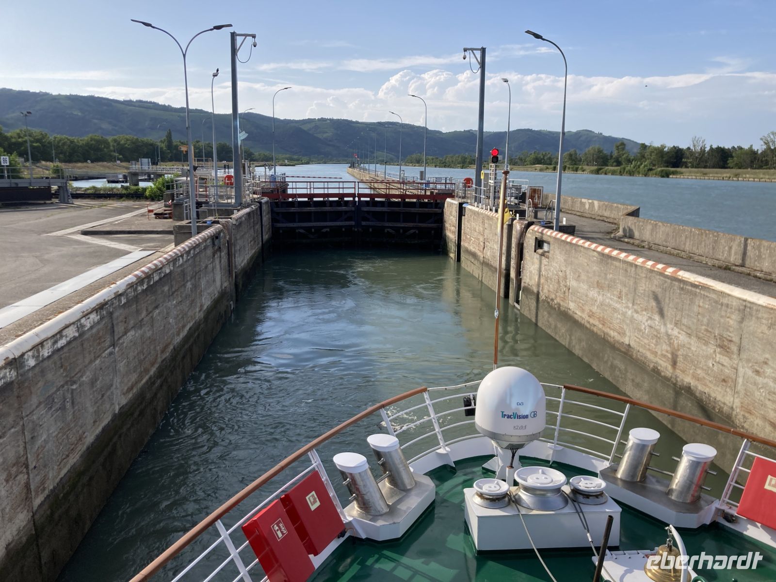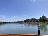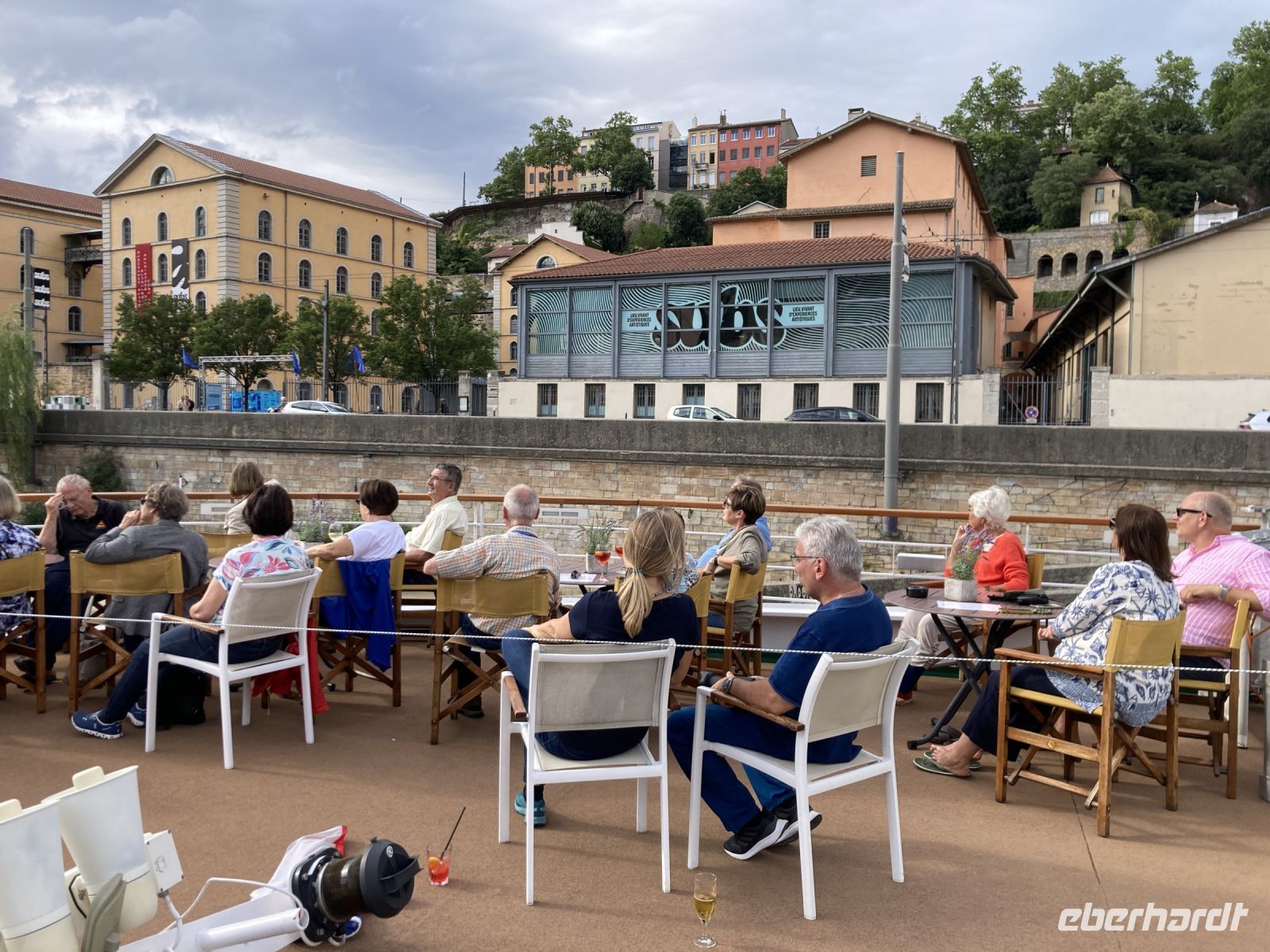 Erfreulicherweise konnten wir eine ruhige Nacht verbringen und Evgenij ist auch gut am Bus angekommen. Wir starten gegen 8 Uhr in Richtung Lyon und erreichen gegen 14:40 die Anlegestelle. Ein bisschen müssen wir uns noch gedulden, denn die Einschiffung beginnt es um 15 Uhr. Allerdings wird unser Gepäck schon auf die Stella gebracht, die heute hinter der Luna steht. Bei den zahlreichen Schiffen auf dieser Strecke ist das Anlegen an ein weiteres Kreuzfahrtschiff keine Ausnahme. Kurz vor 15 Uhr steigen wir gemütlich aus dem Bus und dürfen dann auf das Schiff. Nach dem Einchecken geht es auf die Kabinen. Ein Einschiffunggssnack steht im Restaurant für uns bereit. Nach der Sicherheitsunterweisung nehmen die Gäste schon ihr erstes Glas auf dem Sonnendeck, schließlich sollen wir ja um 18 Uhr ablegen. Unser Ziel ist die Saône, die uns zunächst nach Chalon bringen wird, wo wir am darauffolgenden Tag unsere Augen öffnen werden.