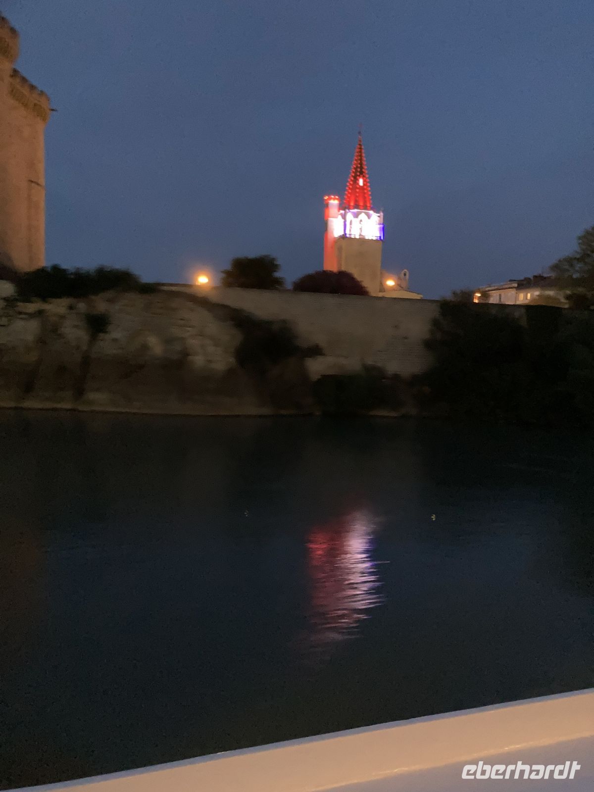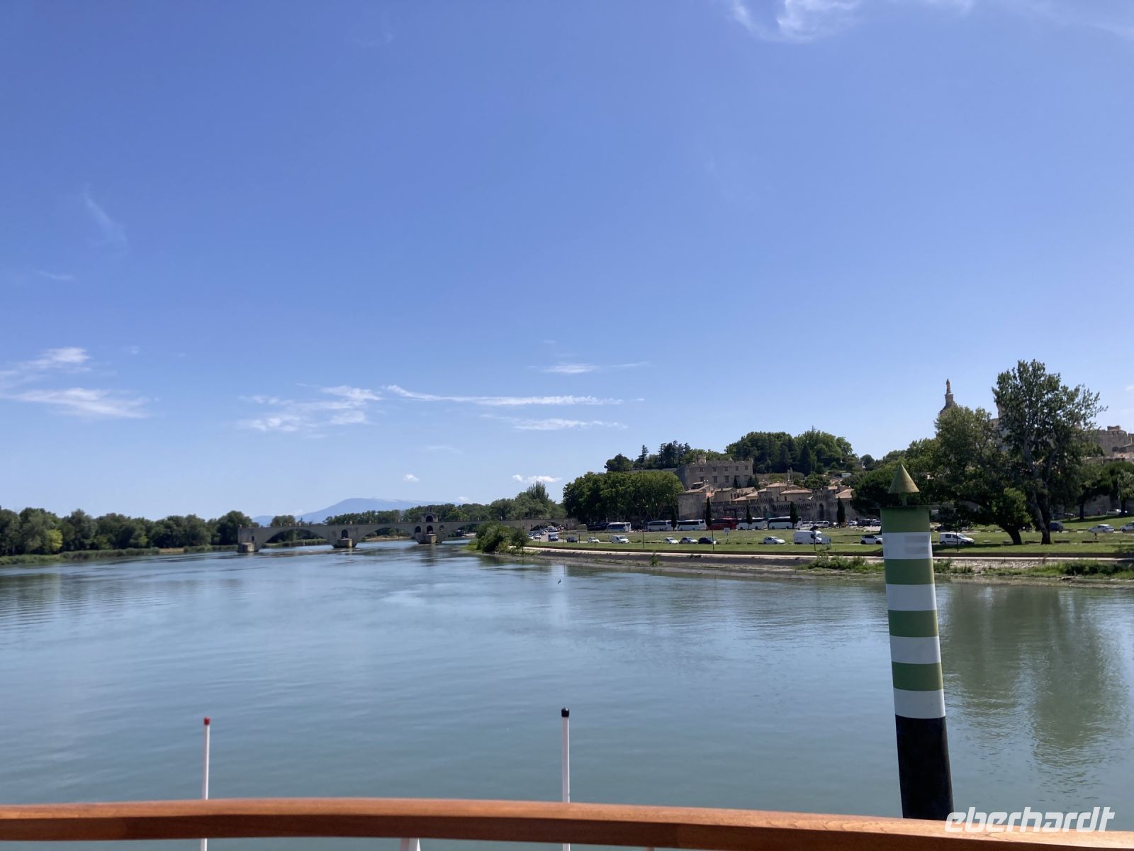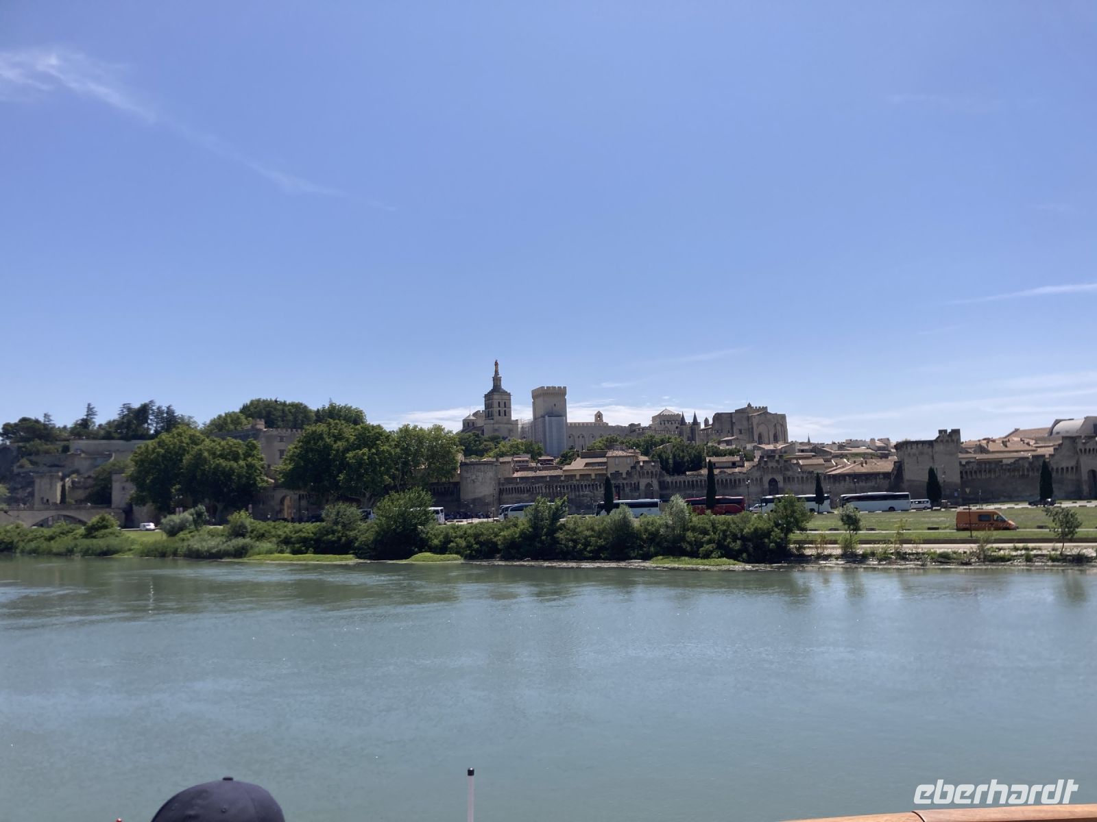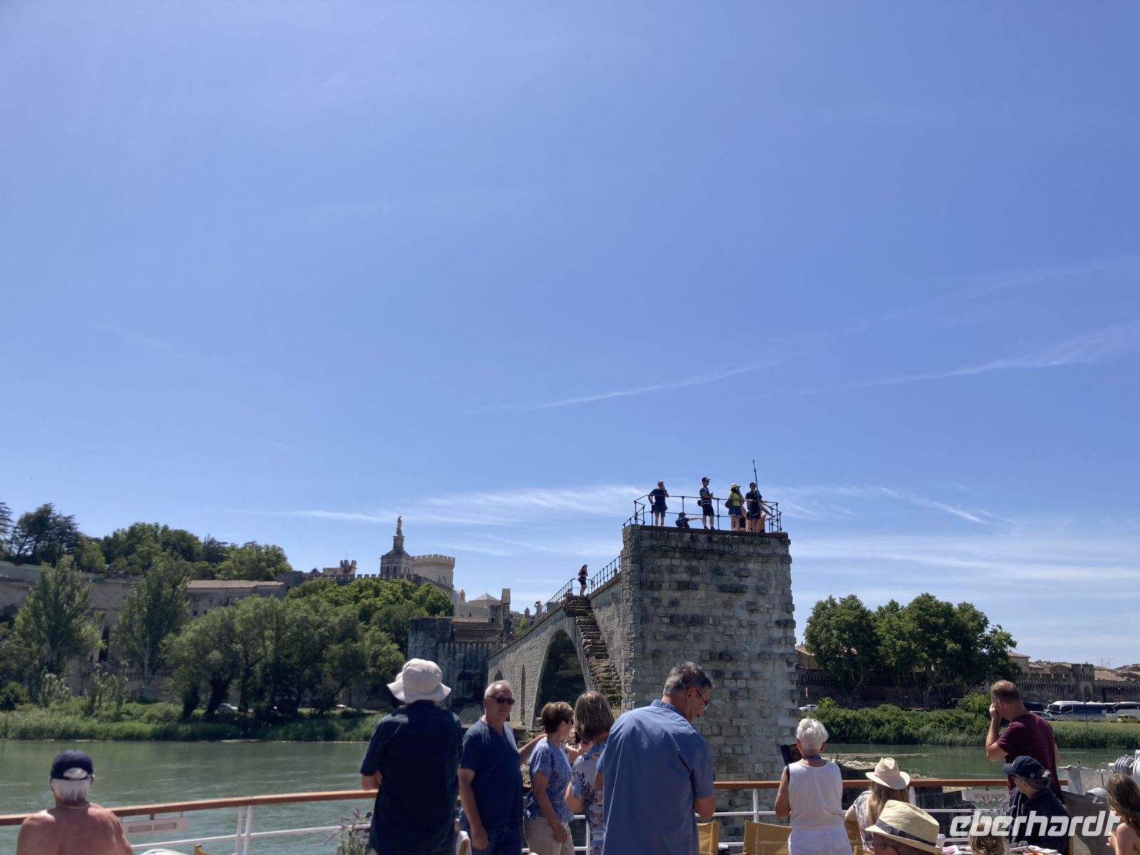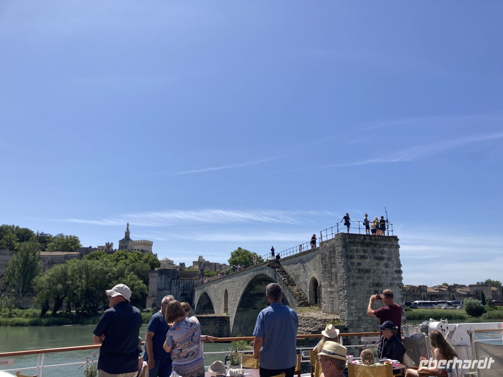 Nach dem Frühstück statten einige Gäste einer besonderen Weinregion einen Besuch ab. Chateauneuf-du-Pape. Die Weine dürfen sich nur auf diese Herkunft beziehen, wenn sie bestimmte Traubensorten verwenden und diese müssen auch noch rund um den Ort angebaut werden. Diese Einschränkung lohnt sich jedoch, zahlen die Weine doch zu den begehrtesten nicht nur in Frankreich. Während wir also diese Weinregion erkunden, fährt die Stella weiter in Richtung Avignon. Zum Mittag sind dann wieder alle an Bord und stärken sich für den Stadtrundgang in Avignon. Getanzt hat leider niemand auf dem Pont Saint-Bénézet. Heute leider nur noch eine Ruine, doch schon diese zeugt davon, wie mächtig dieses Bauwerk einst war. Vier Meter Breite und Bögen, die 33 Meter breit und 13 Meter hoch sind, ließen die Brücke lange als die längste Europa gelten. Doch Hochwasser und politische Unruhen führten schließlich dazu, dass die Brücke 1660 aufgegeben wurde. Unweit der Brücke befindet sich der Papstpalast. Dieser ist heute nicht nur Museum, sondern auch Schauplatz des Avignoner Sommer: Zahlreiche Konzerte und Theateraufführungen finden hier statt. Und überhaupt: Wer mit offenen Augen durch Avignon läuft, entdeckt an einigen Fassaden Darstellungen von Theaterszenen und Fotos von bekannten Schauspielern, die in jungen Jahren hier auch im Sommer Theater spielten. Den Abend lassen wir auf dem Sonnendeck ausklingen, bei Barbecue und Chansons live gesungen.