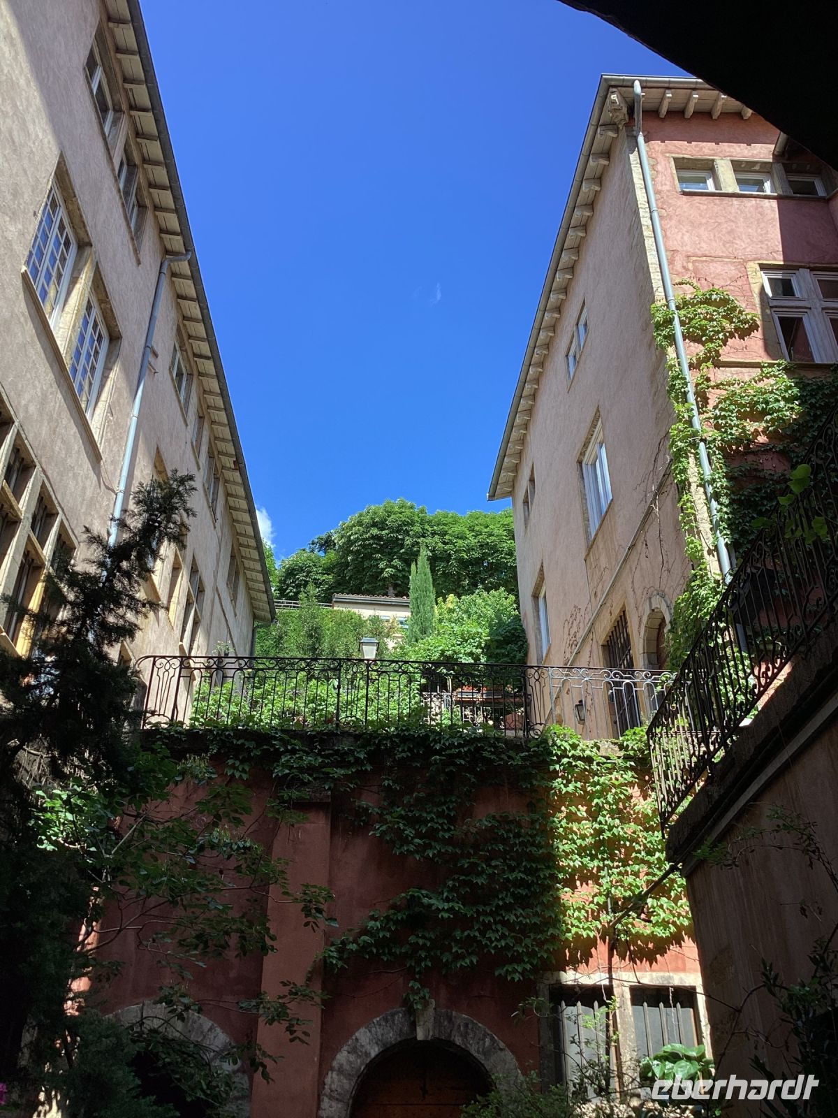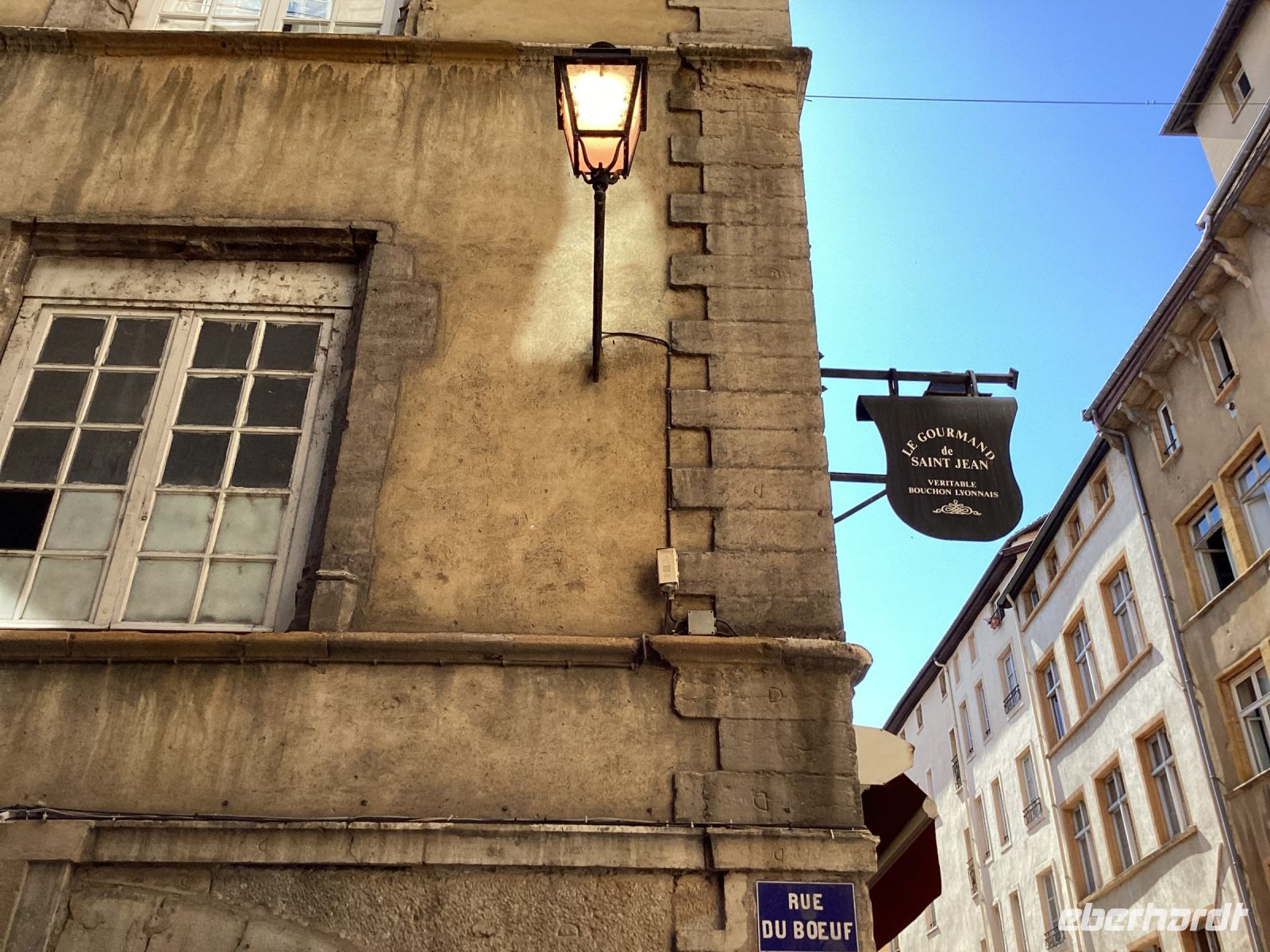 Der Ausblick von hier oben ist herrlich, auch wenn wir den Mont Blanc nicht sehen. Dafür ist es mittlerweile zu warm und zu diesig. Von Paul Bocuse war ja schon die Rede. Zeit, um die Markthalle zu besuchen, der er seinen Namen gab. Zugegeben, ein architektonisches Schmuckstück ist sich nicht. Diese Markthalle punktet mit ihren inneren Werte - und diese sind einfach nur erstaunlich und köstlich. Zu guter Letzt nehmen wir noch Tuchfühlung mit der Altstadt auf. Die Stadt der Seidenweber hat eine Besonderheit, die mit dem Stoff zu tun hat. Da man vermeiden wollte, das die Stoffballen nass werden, hat man Durchgänge geschaffen, die es ermöglichen trockenen Fuße durch die Stadt zu den Händler und den Werkstätten zu kommen.