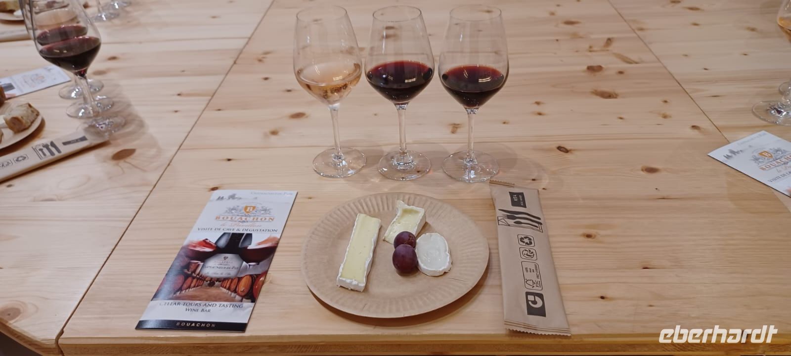 Der Vertrieb erfolgt selbständig ohne genossenschaftliche Kooperation. Wir probieren, nein-zelebrieren die Geruchs-u. Geschmacksaufnahme von zwei Rotweinsorten, einem Rosé; dazu die Empfehlung unterschiedlicher Camemberts durch den Chef der Produktion.