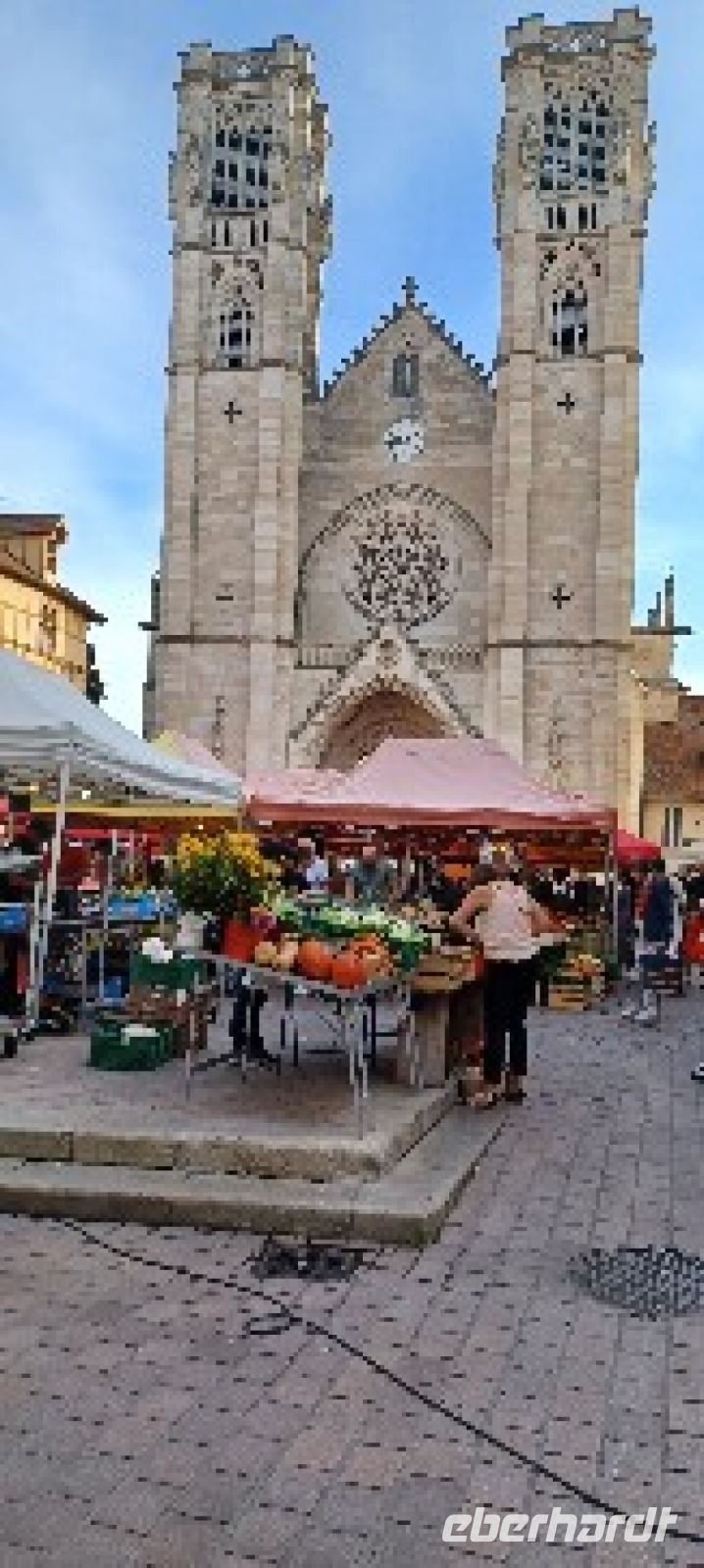 Das beschauliche Städtchen im Burgund ist bekannt durch die Anfänge der Fotografie, indem Joseph Nicephore Niepce durch seine Erfindung der Heliografie den Grundstein für die Entwicklung der modernen Fotografie legte. Das Fotografiemuseum gegenüber dem Schiffsquai ist auch an diesem Sonntag kostenfrei zu besuchen. Unsere Stadtführerin leitet uns zur Kathedrale St. Vincent auf dem gleichnamigen Platz. Wir besichtigen zuerst die Kathedrale bevor 10:00 Uhr der Sonntagsgottesdienst beginnt. Wir werden noch mehrere Kathedralen besichtigen, jede einzigartig, z.T. in Kombination mehrerer Baustile, wie z.B. Romanik über Frühgotik bis Hochgotik. Bewundernswert die bunten Glasfenster von denen zwei noch aus der romanischen Zeit stammen. Vor der Kirche der sonntägliche Markt: geschäftiges Treiben. Es werden Lebensmittel eingekauft; vergleichbar mit unserem Wochenendeinkauf im Supermarkt. Man kennt sich, spricht miteinander. Für Touristen sind die bunten Stände mit Taschen u. Körben gedacht.