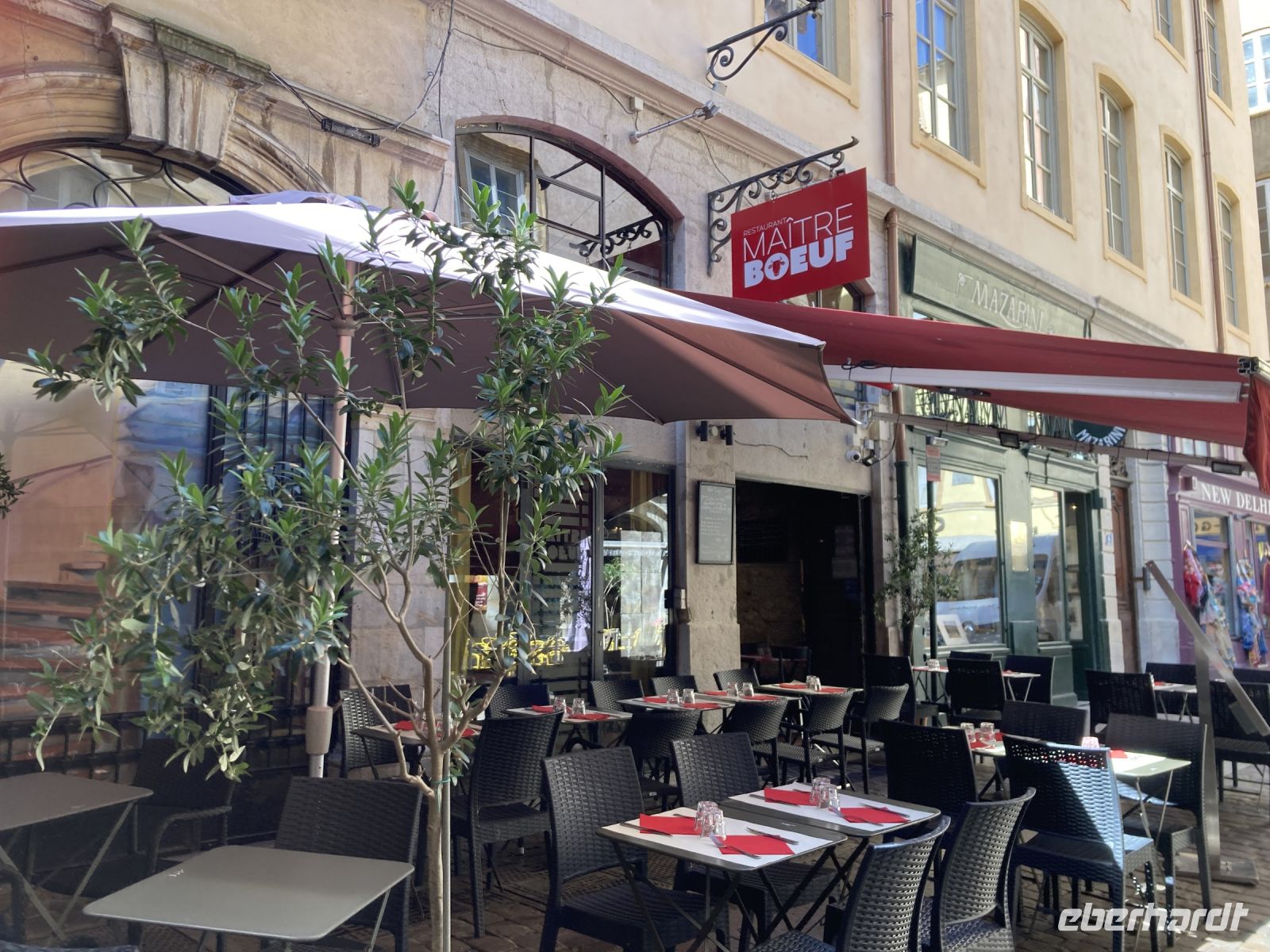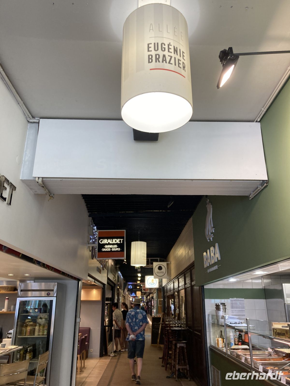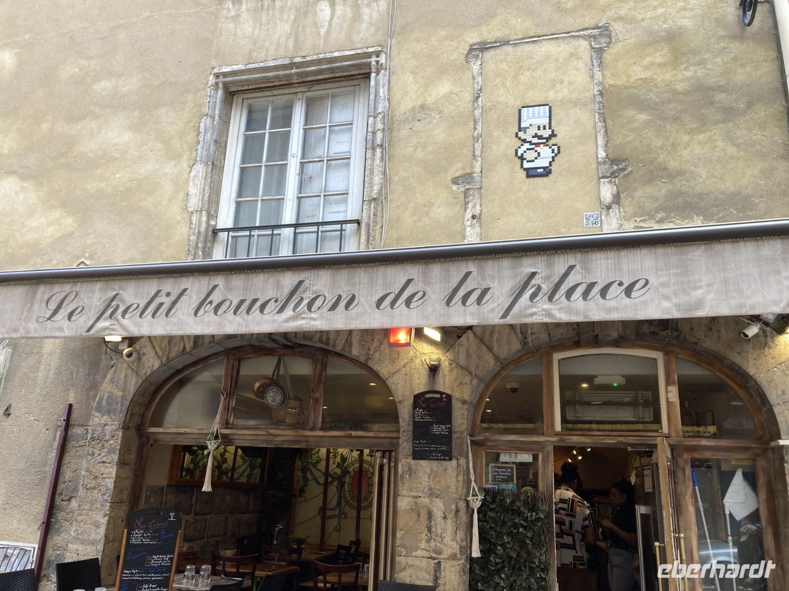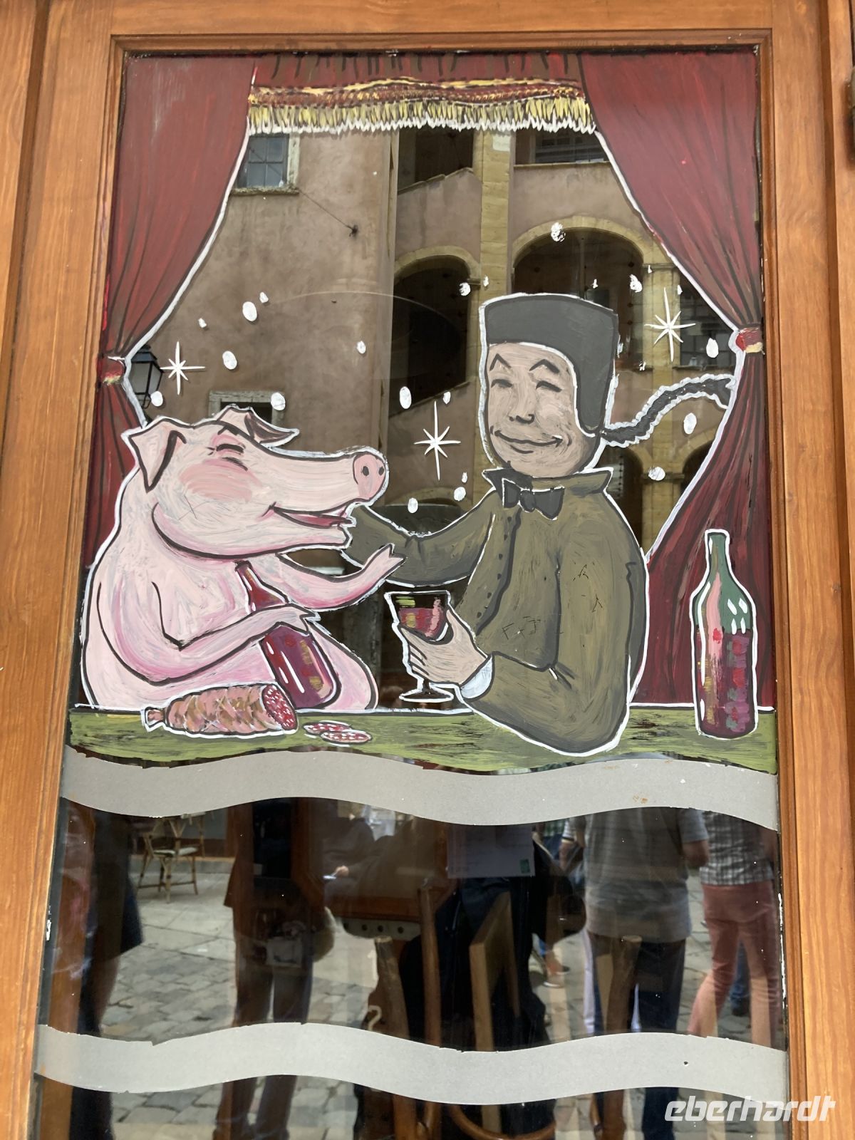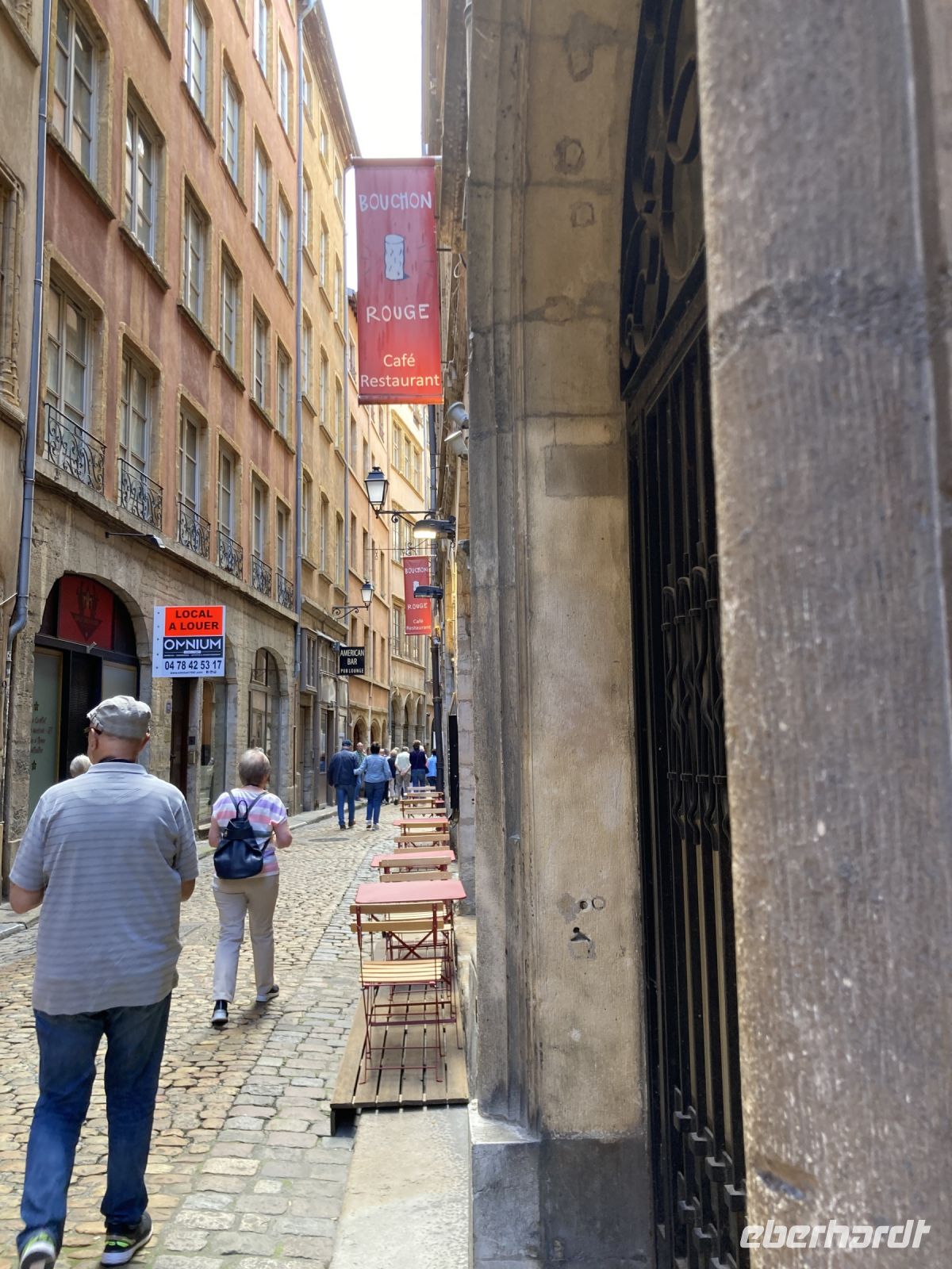 Wir wagen einen letzten Blick auf die sich unter uns ausbreitende Stadt. Im Anschluss geht es nun noch zur Altstadt hinunter. Zahlreiche Restaurants warten hier auf ihre Gäste. Der Bouchon Lyonnais weist den Weg zu einer traditionellen Küche und natürlich dürfen die Traboules nicht fehlen. Wir öffnen eine Tür. Von außen ein Eingang zu einem Privathaus. Aber dieses Haus ist vielmehr. Es gehört zu jenen Häusern, die durch eine Vielzahl von Durchgängen verbunden sind, um so schnell einen regenfreien Weg vom Fluss zu den Händlern und Werkstätten zu schaffen. In Lyon soll es 500 von diesen Durchgängen, den Traboules, geben. Wieder im Bus fahren wir nun zur Markthalle, die den Namen des großen Kochs und Sohnes der Stadt Paul Bocuse trägt. Zugegeben, das Warenangebot ist äußerst verlockend. Und tatsächlich müssten wir am besten einen eigenen Herd hier haben, um alles einmal auszuprobieren. Aber unserer Besuch bleibt keine Trockenübung. Bei einem Gläschen Wein probieren wir die gute Wurst aus Lyon und einen Ziegenkäse. Das macht auf jeden Fall Appetit auf das Mittagessen. Wir kehren zum Schiff zurück, wo schon alles für unsere Abfahrt vorbereitet ist. Wir nehmen nun südlichen Kurs.