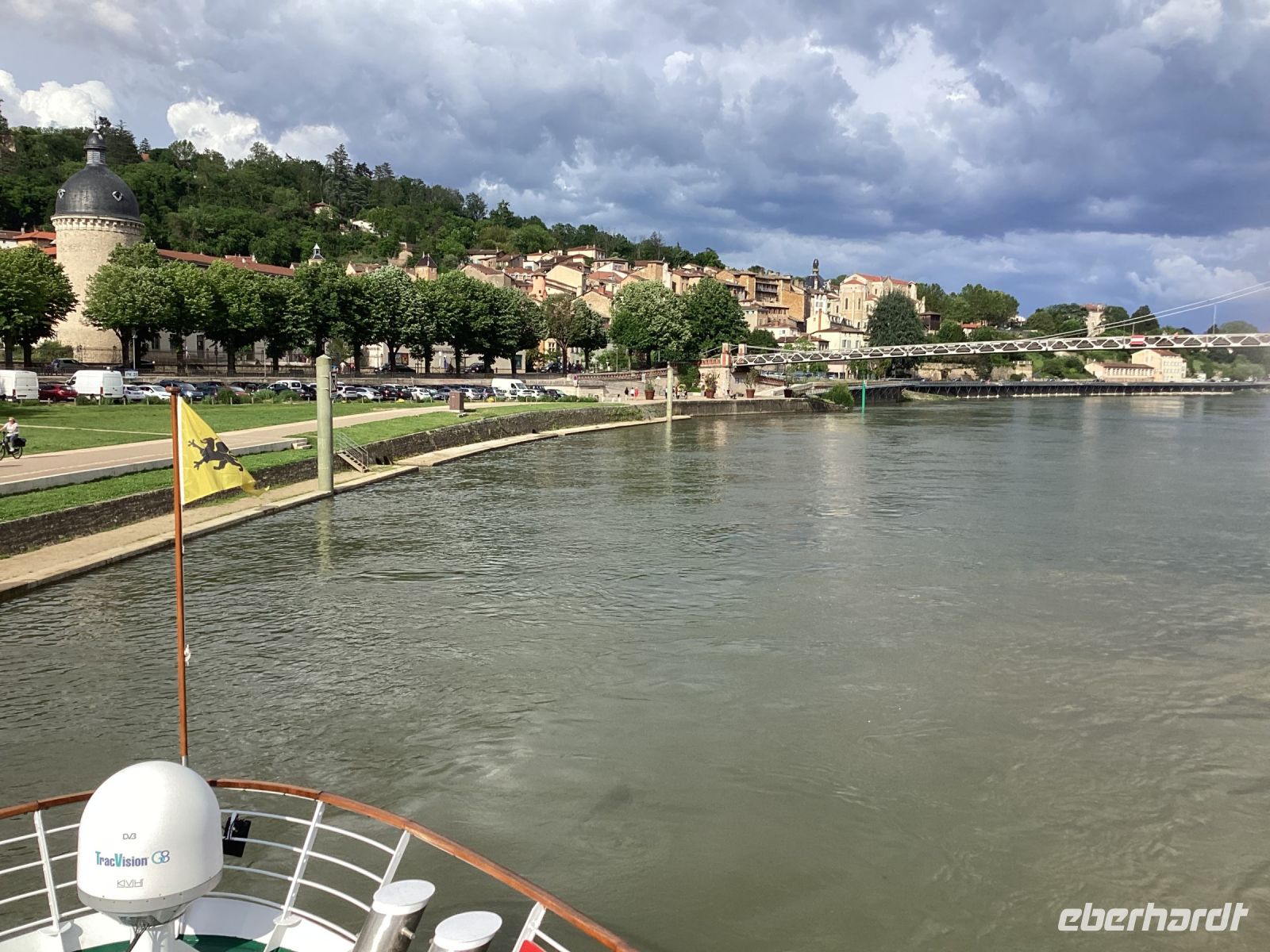 Hierfür treffen wir uns nach dem Frühstück zu einem kleinen Rundgang. Wie bedeutsam diese Stadt einst war, lässt sich leider nur noch an wenigen Gebäuden ablesen. Ein Beweis ist das wunderschöne Holzhaus ( Maison bois) mit seinen besonderen Schnitzereien. Oder Pont Saint-Laurent: Diese Brücke, welche die Saône überspannt, erscheint noch im mittelalterlichen Antlitz. Damit ist sie eine der wenigen verbliebenen Brücken. Während der Religionskriege fanden hier viele Hugenotten den Tod, als sie von der Brücke in den Fluss geworfen wurden. Zur Mittagszeit starten die Stella flussabwärts. Die Gäste, die auf den Spuren zum Beaujolais, erleben das Ablegen nicht, denn sie sind schon unterwegs in das beschauliche Örtchen Oingt und zur Weinprobe. Wir werden sie wieder in Trévoux an Bord nehmen. Für uns alle geht es nun in Richtung Lyon. Obwohl der Tag uns herrliche Sonne bescherte, gerät unsere Einfahrt nach Lyon verregnet. Mal sehen, was der morgige Tag für uns bereit hält.