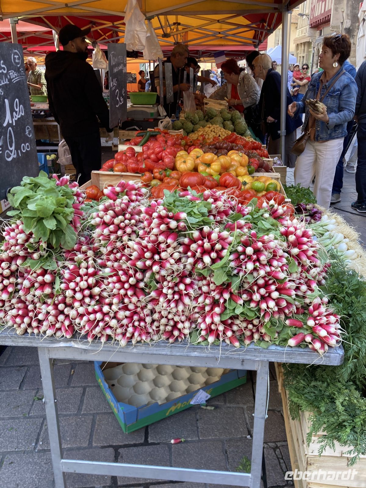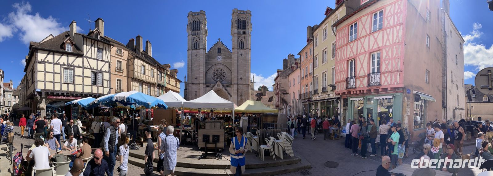 Sonne und Sonntags in Chalon-sur-Saône ist eine herrliche Kombination. Denn diese Stadt ist nicht nur wegen der schönen Fachwerkhäuser ein Augenschmaus, jeden Sonntag findet hier ein herrlicher Markt statt. Das ist ein Schaulaufen der Gemüse- und Käsehändler, der Wurstwaren und vieles mehr. Das tolle an diesem Markt ist, dass er so gar nicht touristisch ist. Hier kaufen die Menschen aus der Stadt und des Umlandes ein. Wer immer einen Eindruck eines französischen Marktes bekommen wollte, ist hier genau richtig. Einige Gäste nehmen an dem geführten Rundgang teil. Andere gehen gemeinsam mit mir über den Markt und erkunden ein wenig die Stadt.