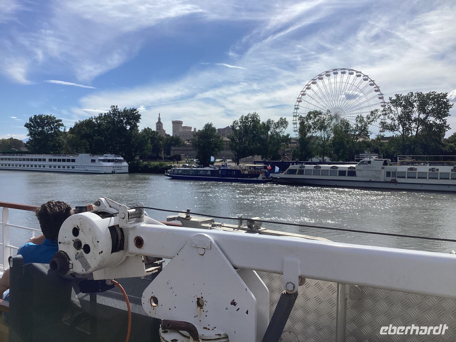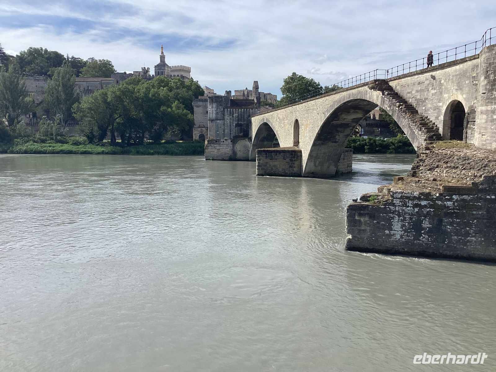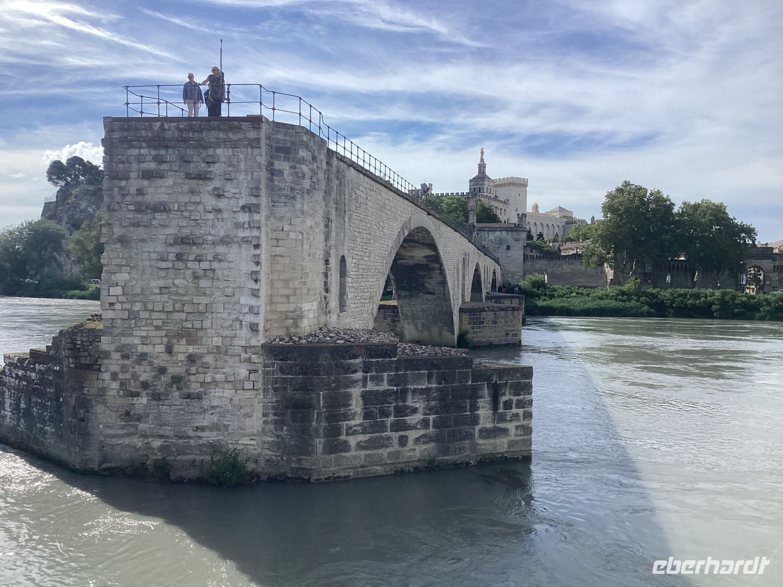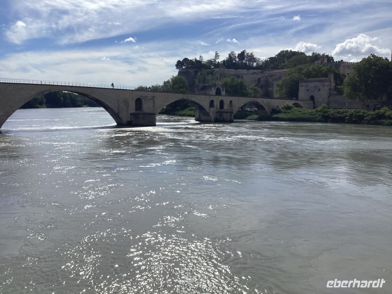 Unsere erste Begegnung mit dem Süden Frankreichs wird Avignon sein. Da wir dieses Mal sehr zeitig unterwegs sind, macht unser Kapitän noch eine Panoramafahrt bis zur berühmten Brücke. So können wir die Stadtansicht, vor allem aber den Pont Saint-Bénézet schon aus der Nähe betrachten. Heute ist die Brücke nur noch eine Ruine, doch schon diese zeugt davon, wie mächtig dieses Bauwerk einst war. Eine Breite von vier Meter und Bögen, die eine Weite von 33 Meter haben und 13 Meter hoch sind, ließen die Brücke lange als die längste Europa gelten. Doch Hochwasser und politische Unruhen führten schließlich dazu, dass die Brücke 1660 aufgegeben wurde. Unweit der Brücke befindet sich der Papstpalast. Dieser ist heute nicht nur Museum, sondern auch Schauplatz des Avignoner Sommer: Zahlreiche Konzerte und Theateraufführungen finden hier statt. Bei unserem Aufenthalt beginnt gerade der Theatersommer. In der Hauptstraße finden sich immer wieder Gruppen, die auf ihre Ausführung aufmerksam machen wollen, mal leise, mal mit großem Spektakel. Wer mit offenen Augen durch Avignon läuft, entdeckt an einigen Fassaden Darstellungen von Theaterszenen und Fotos von bekannten Schauspielern, die in jungen Jahren hier auch im Sommer an Inszenierungen teilnahmen oder mit Regisseuren diskutierten.