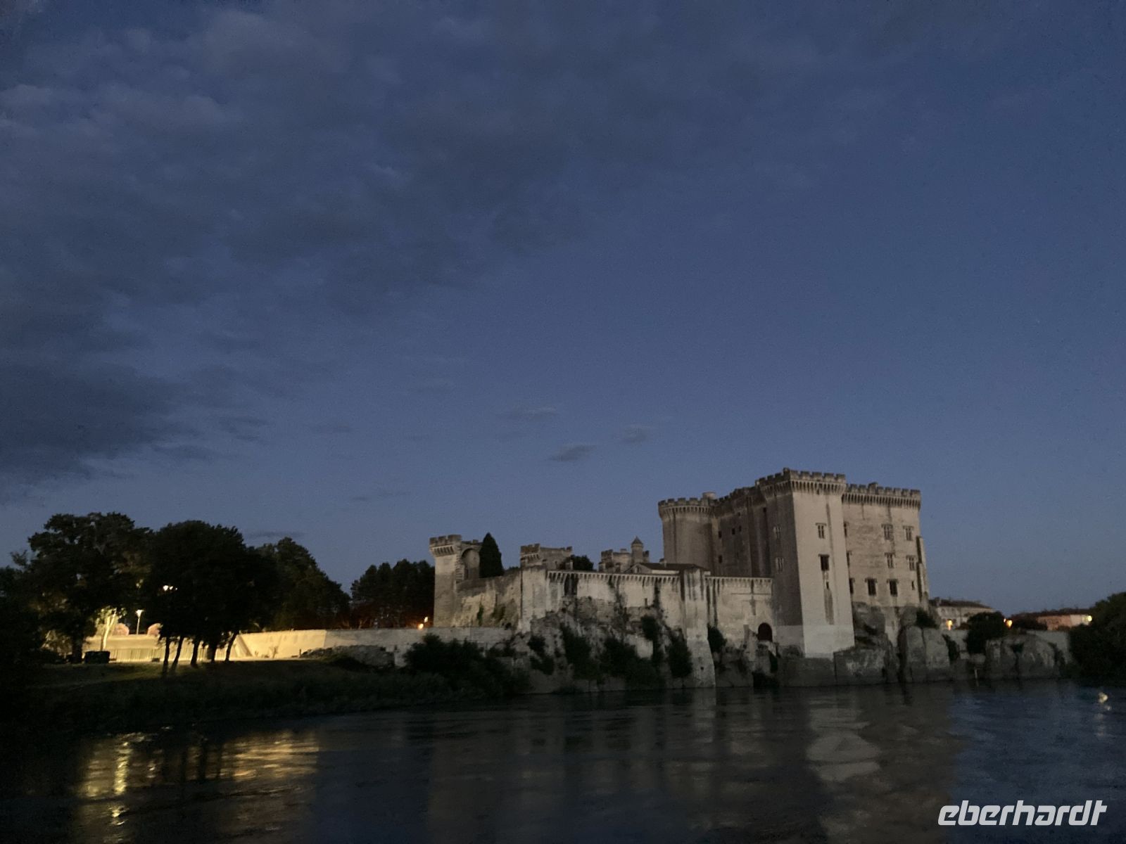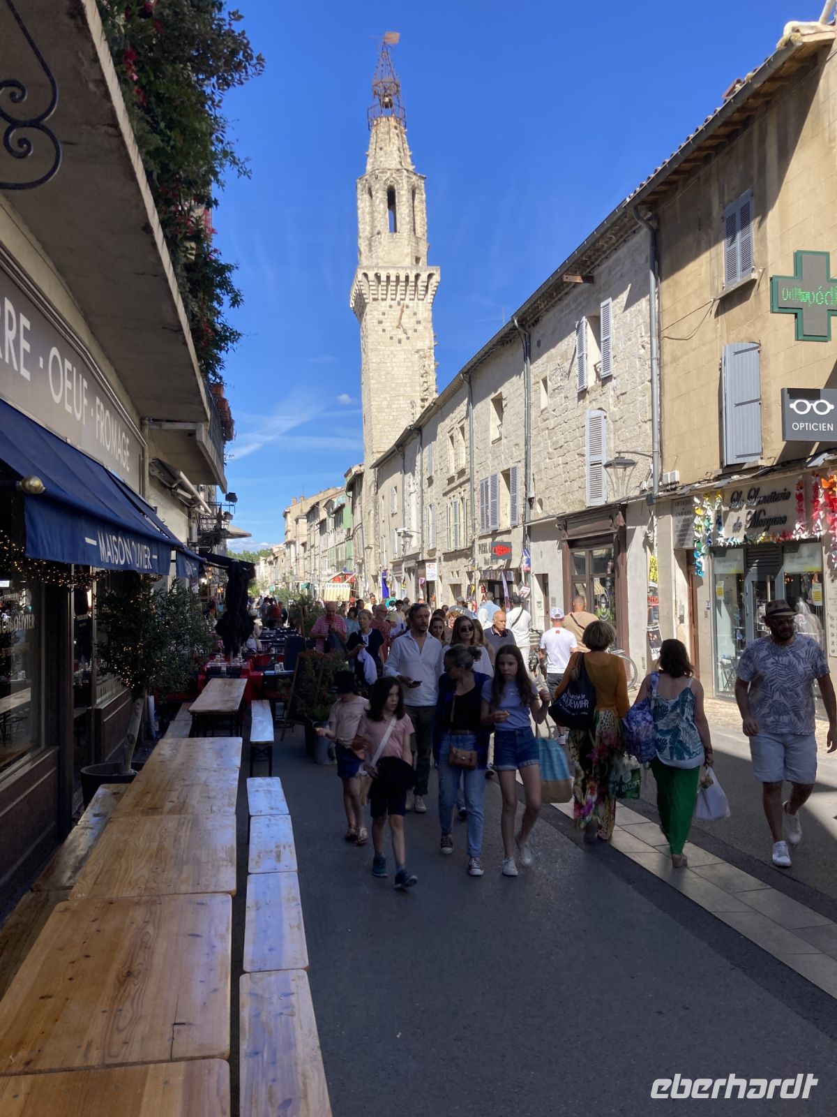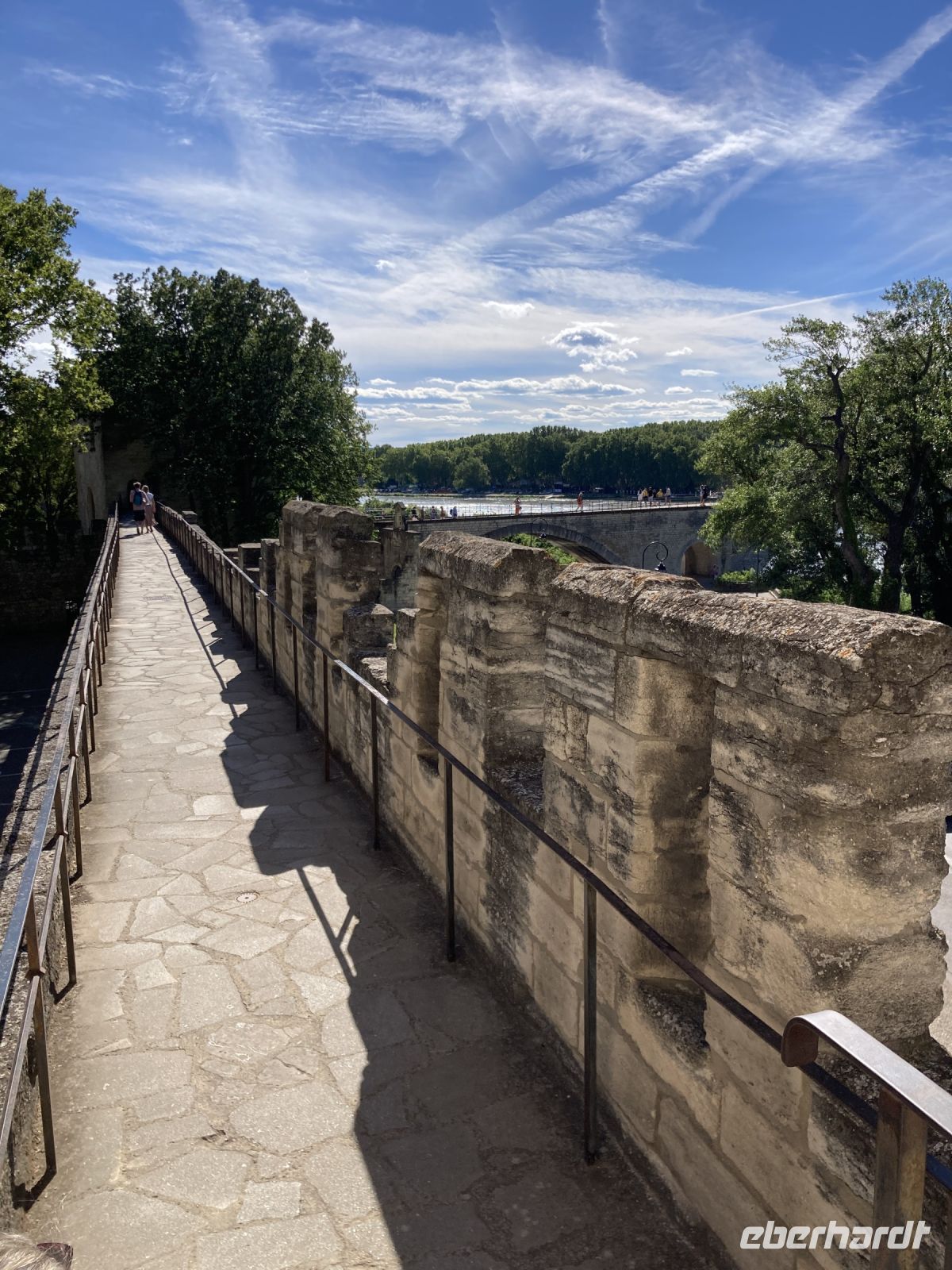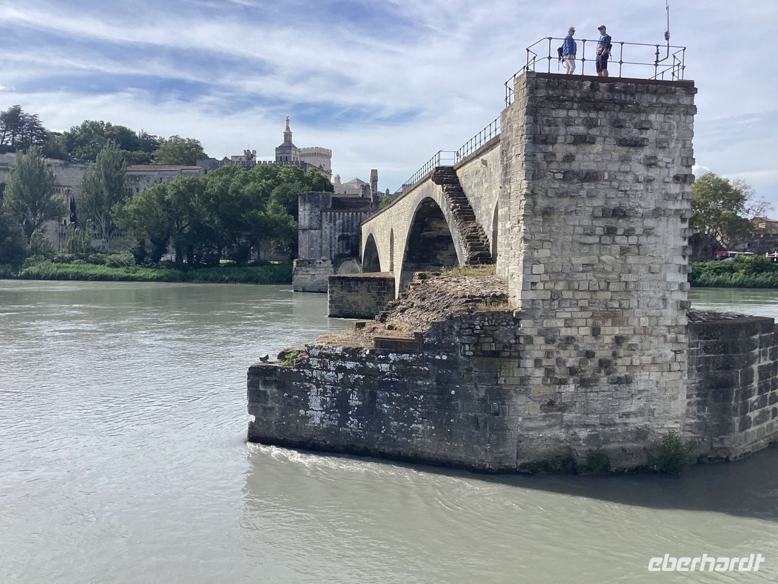 Unsere erste Begegnung mit dem Süden Frankreichs wird Avignon sein. Da wir dieses Mal sehr zeitig unterwegs sind, macht unser Kapitän noch eine Panoramafahrt bis zur berühmten Brücke. So können wir die Stadtansicht, vor allem aber den Pont Saint-Bénézet schon aus der Nähe betrachten. Heute ist die Brücke nur noch eine Ruine, doch schon diese zeugt davon, wie mächtig dieses Bauwerk einst war. Eine Breite von vier Meter und Bögen, die eine Weite von 33 Meter haben und 13 Meter hoch sind, ließen die Brücke lange als die längste Europa gelten. Doch Hochwasser und politische Unruhen führten schließlich dazu, dass die Brücke 1660 aufgegeben wurde. Unweit der Brücke befindet sich der Papstpalast. Dieser ist heute nicht nur Museum, sondern auch Schauplatz des Avignoner Sommer: Zahlreiche Konzerte und Theateraufführungen finden hier statt. Bei unserem Aufenthalt beginnt gerade der Theatersommer. In der Hauptstraße finden sich immer wieder Gruppen, die auf ihre Ausführung aufmerksam machen wollen, mal leise, mal mit großem Spektakel. Wer mit offenen Augen durch Avignon läuft, entdeckt an einigen Fassaden Darstellungen von Theaterszenen und Fotos von bekannten Schauspielern, die in jungen Jahren hier auch im Sommer an Inszenierungen teilnahmen oder mit Regisseuren diskutierten.