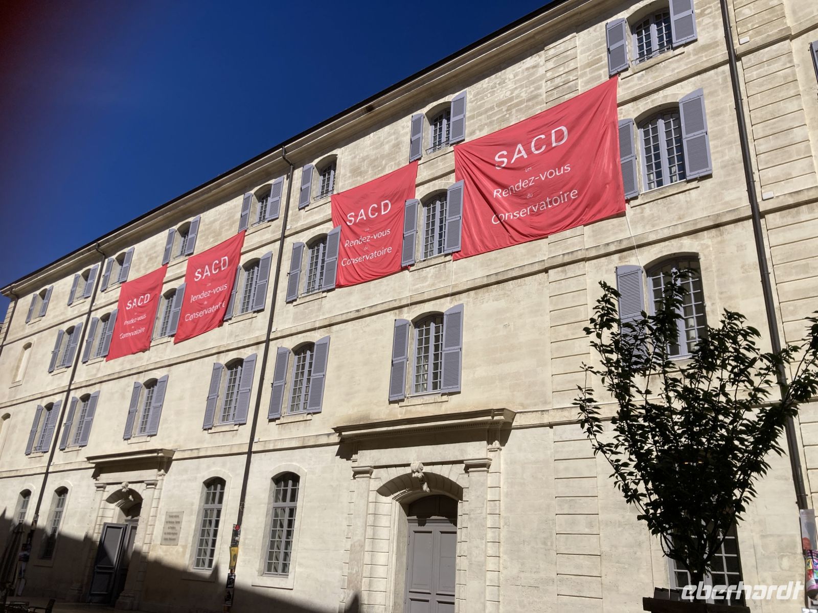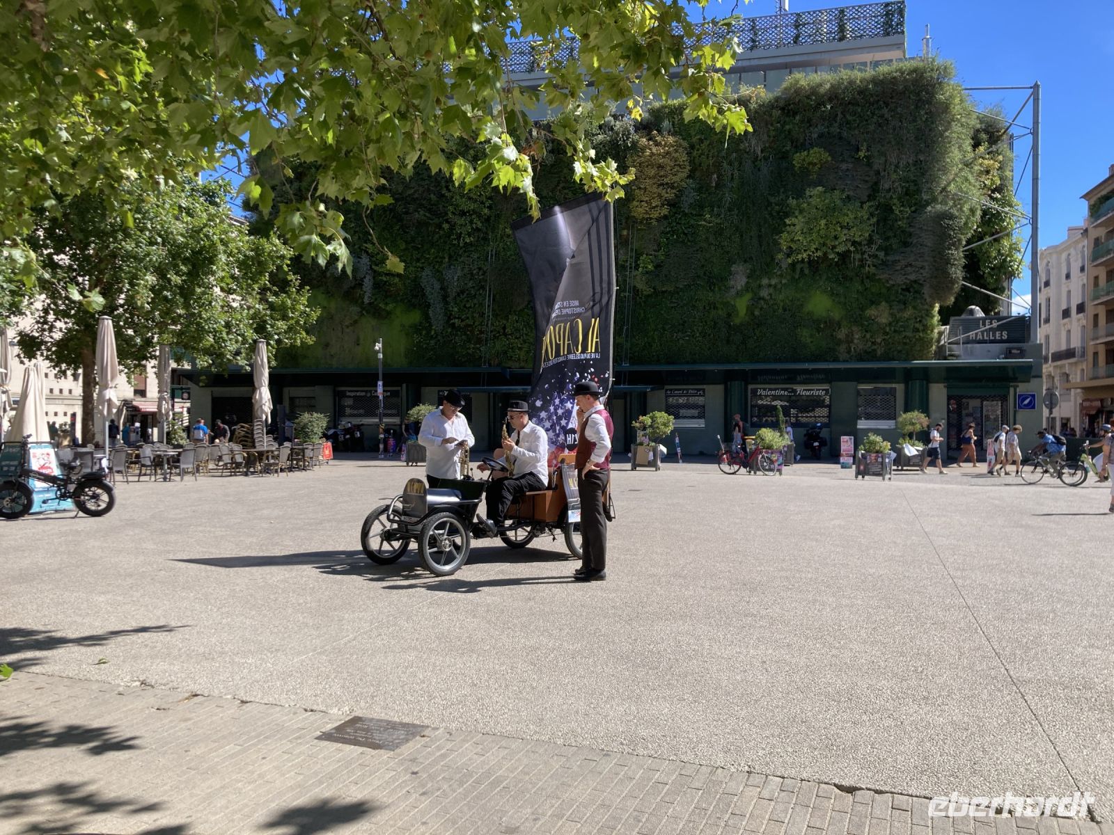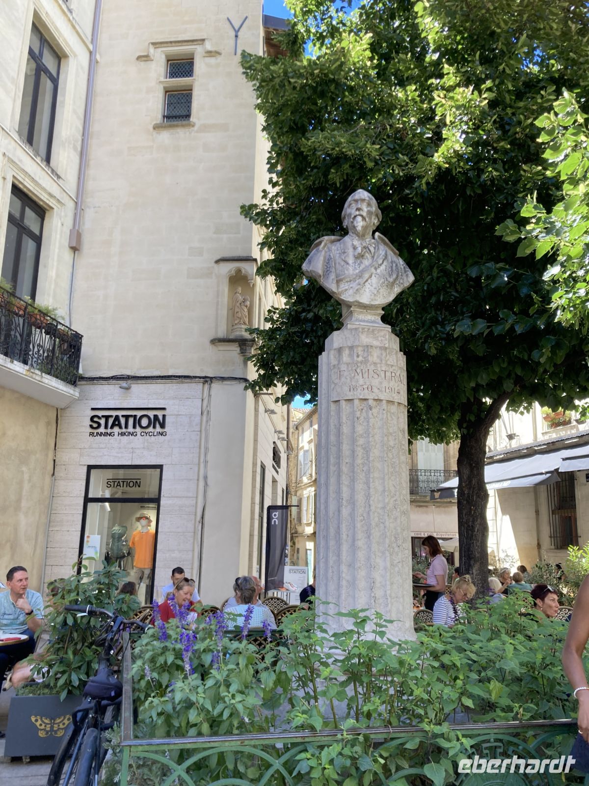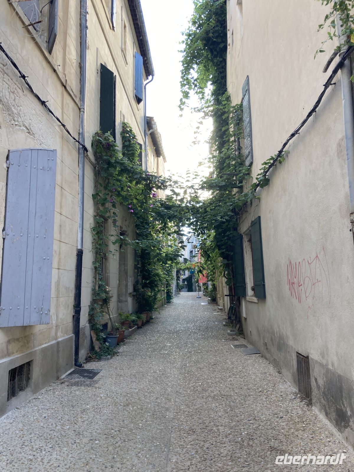 Unsere erste Begegnung mit dem Süden Frankreichs wird Avignon sein. Da wir dieses Mal sehr zeitig unterwegs sind, macht unser Kapitän noch eine Panoramafahrt bis zur berühmten Brücke. So können wir die Stadtansicht, vor allem aber den Pont Saint-Bénézet schon aus der Nähe betrachten. Heute ist die Brücke nur noch eine Ruine, doch schon diese zeugt davon, wie mächtig dieses Bauwerk einst war. Eine Breite von vier Meter und Bögen, die eine Weite von 33 Meter haben und 13 Meter hoch sind, ließen die Brücke lange als die längste Europa gelten. Doch Hochwasser und politische Unruhen führten schließlich dazu, dass die Brücke 1660 aufgegeben wurde. Unweit der Brücke befindet sich der Papstpalast. Dieser ist heute nicht nur Museum, sondern auch Schauplatz des Avignoner Sommer: Zahlreiche Konzerte und Theateraufführungen finden hier statt. Bei unserem Aufenthalt beginnt gerade der Theatersommer. In der Hauptstraße finden sich immer wieder Gruppen, die auf ihre Ausführung aufmerksam machen wollen, mal leise, mal mit großem Spektakel. Wer mit offenen Augen durch Avignon läuft, entdeckt an einigen Fassaden Darstellungen von Theaterszenen und Fotos von bekannten Schauspielern, die in jungen Jahren hier auch im Sommer an Inszenierungen teilnahmen oder mit Regisseuren diskutierten.