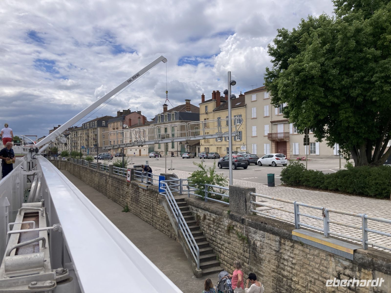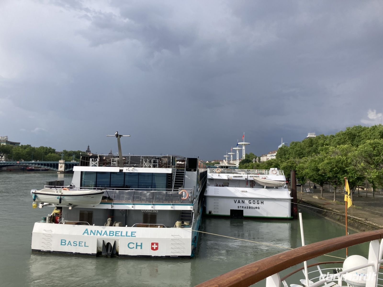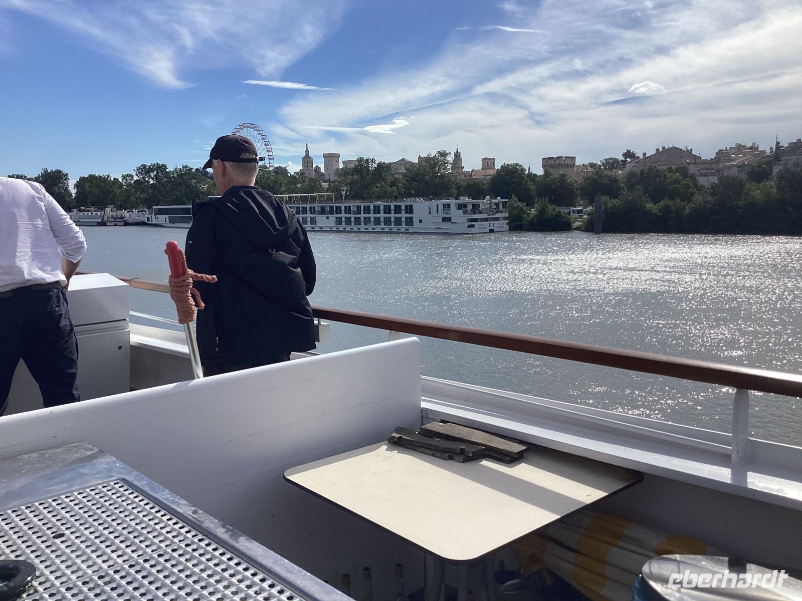 Nachdem wir unseren Kreuzfahrtdirektor Tobias schon kurz gesehen haben, lernen wir nun die Ausflugsmanagerin Jana kennen. Von ihr erfahren wir die letzen Informationen zu den Ausflügen. Glücklicherweise haben die meisten Eberhardt-Gäste ihre Ausflüge schon reserviert. Gerade in der Hochsaison ist eine Nachbuchung nicht immer möglich. Eigentlich sollten wir Lyon um 18 Uhr in Richtung Norden verlassen. Doch auch dieses Mal verzögert sich unsere Abfahrt, da Fluggäste fehlen. Aus der erhofften halben Stunden werden dann doch gute 60 Minuten, wobei die Fluggäste immer noch nicht an Bord sind, sondern bei einem außerplanmäßigen Stopp zusteigen werden. Uns ficht dies jedoch nicht an. Einige genießen die Ausfahrt auf dem Sonnendeck, andere sitzen schon beim Abendessen und lassen die Stadt an sich vorbei ziehen. Der Stopp hinter Lyon gestaltet sich dann doch recht interessant, denn das Anlegen ist für das doch recht große Schiff nicht ganz so einfach. Kapitän und Matrosen leisten Maßarbeit. Bei der Vorstellung der Crew erfahren wir dann, dass immer noch nicht alle Fluggäste an Bord sind. Geplant ist ein weiterer Stopp gegen Mitternacht. Wir lehnen uns ganz entspannt zurück und genießen einfach ohne Stress den Abend. Busfahren hat doch einige Vorteile….