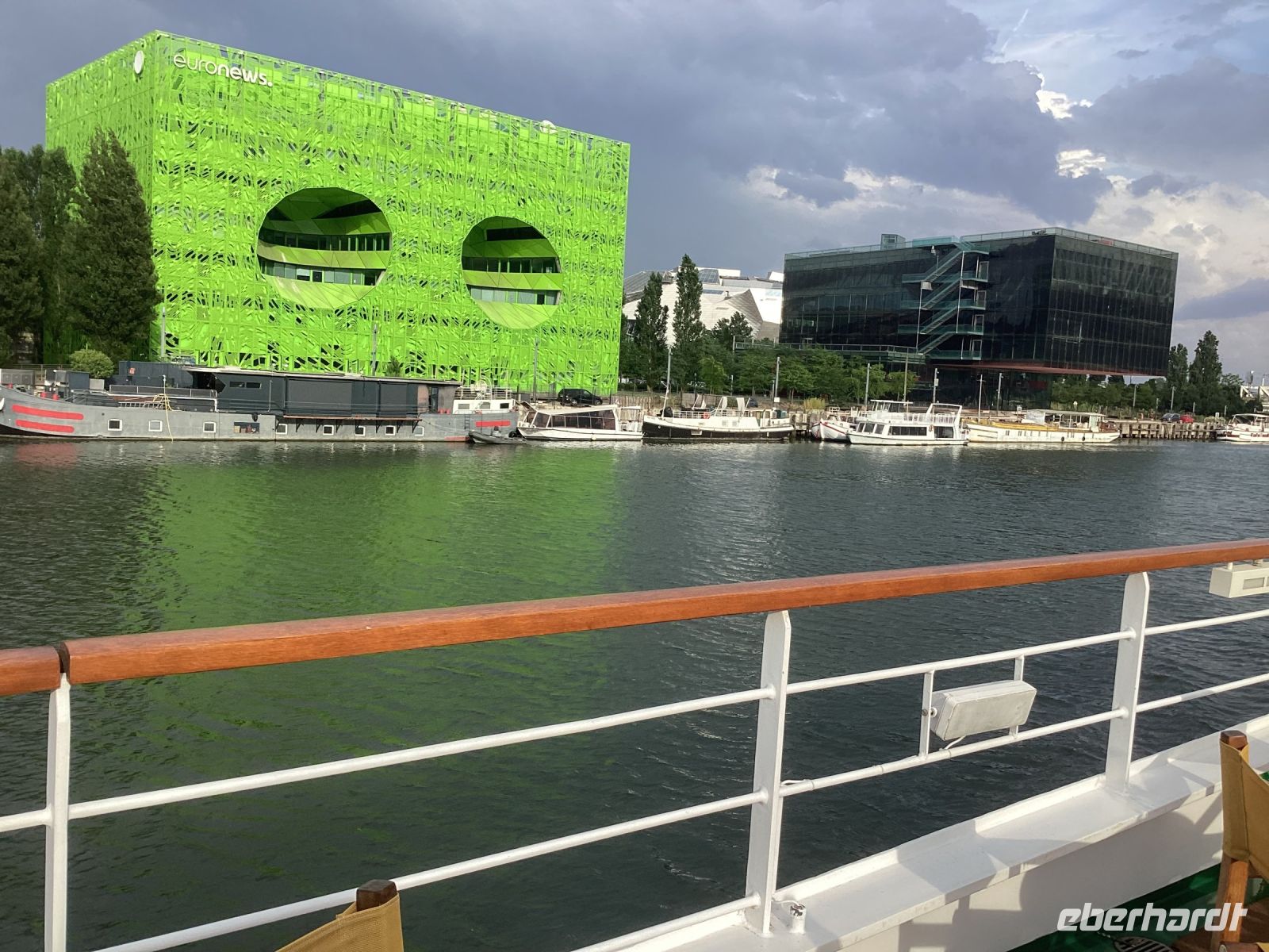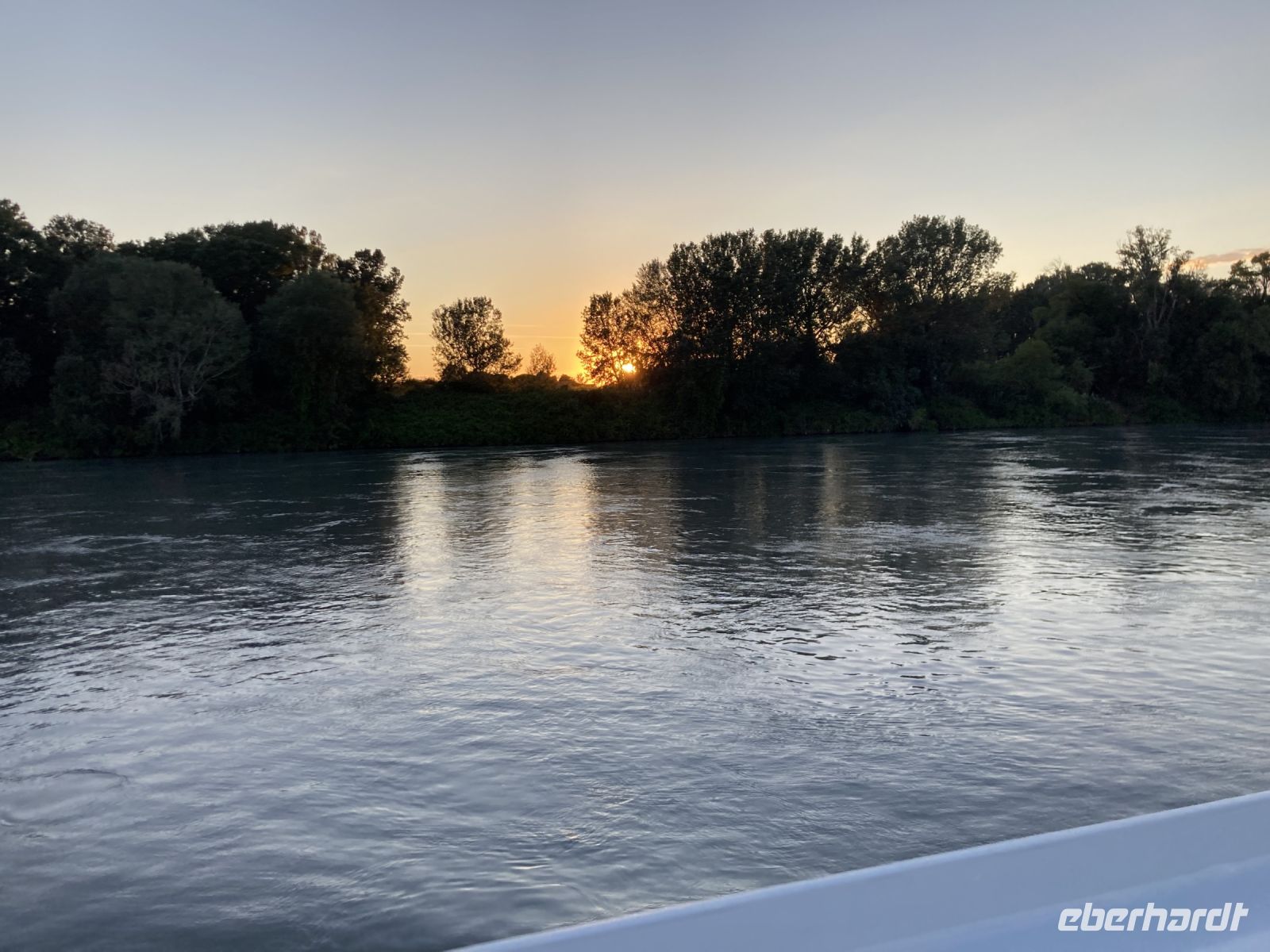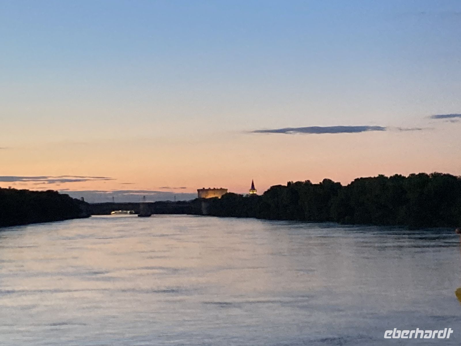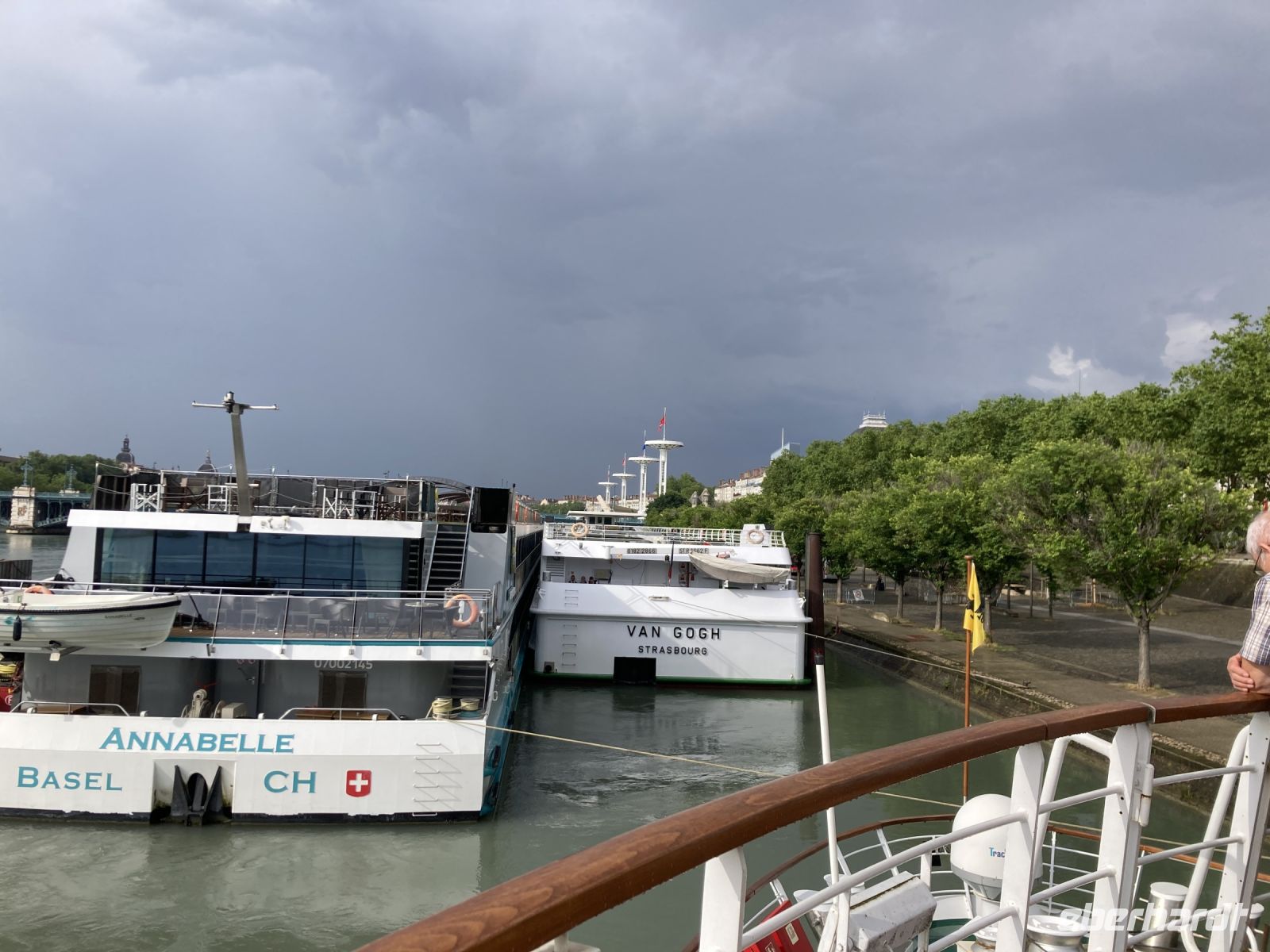 Nachdem wir unseren Kreuzfahrtdirektor Tobias schon kurz gesehen haben, lernen wir nun die Ausflugsmanagerin Jana kennen. Von ihr erfahren wir die letzen Informationen zu den Ausflügen. Glücklicherweise haben die meisten Eberhardt-Gäste ihre Ausflüge schon reserviert. Gerade in der Hochsaison ist eine Nachbuchung nicht immer möglich. Eigentlich sollten wir Lyon um 18 Uhr in Richtung Norden verlassen. Doch auch dieses Mal verzögert sich unsere Abfahrt, da Fluggäste fehlen. Aus der erhofften halben Stunden werden dann doch gute 60 Minuten, wobei die Fluggäste immer noch nicht an Bord sind, sondern bei einem außerplanmäßigen Stopp zusteigen werden. Uns ficht dies jedoch nicht an. Einige genießen die Ausfahrt auf dem Sonnendeck, andere sitzen schon beim Abendessen und lassen die Stadt an sich vorbei ziehen. Der Stopp hinter Lyon gestaltet sich dann doch recht interessant, denn das Anlegen ist für das doch recht große Schiff nicht ganz so einfach. Kapitän und Matrosen leisten Maßarbeit. Bei der Vorstellung der Crew erfahren wir dann, dass immer noch nicht alle Fluggäste an Bord sind. Geplant ist ein weiterer Stopp gegen Mitternacht. Wir lehnen uns ganz entspannt zurück und genießen einfach ohne Stress den Abend. Busfahren hat doch einige Vorteile….