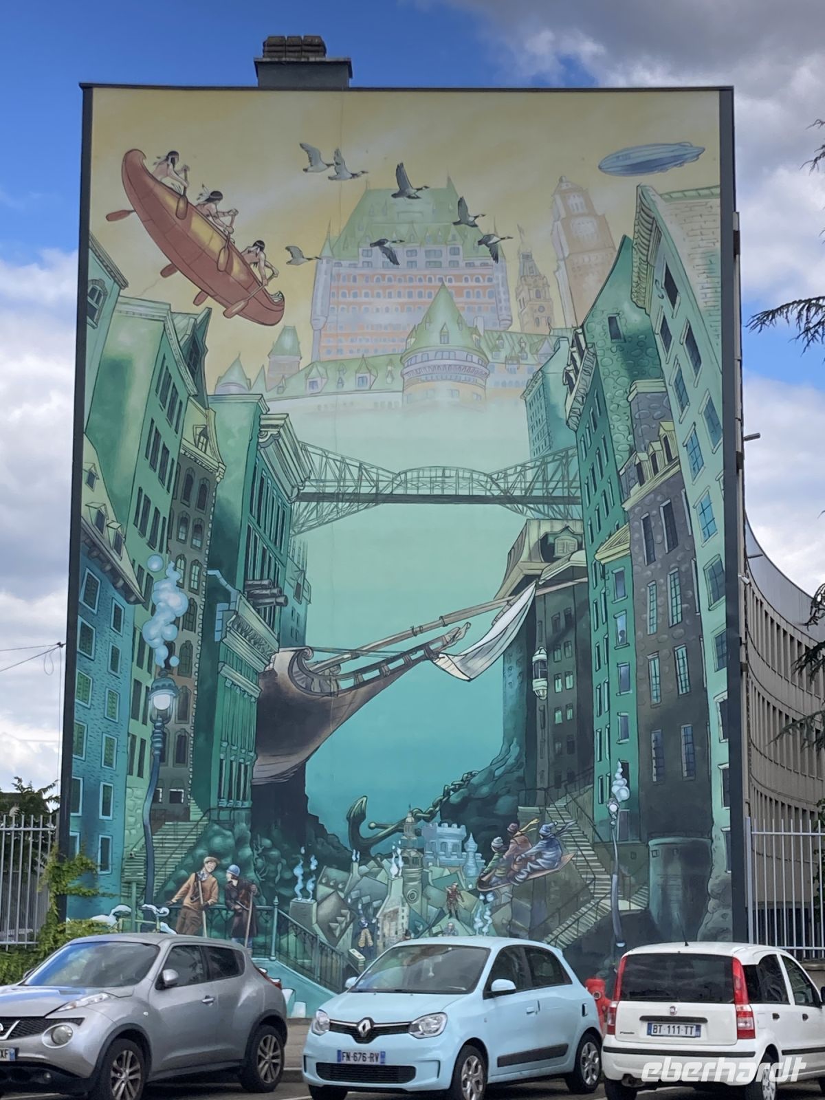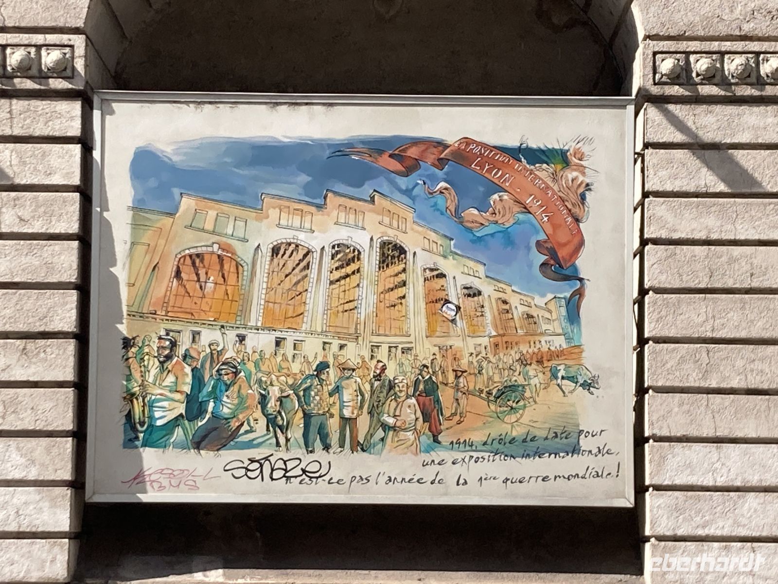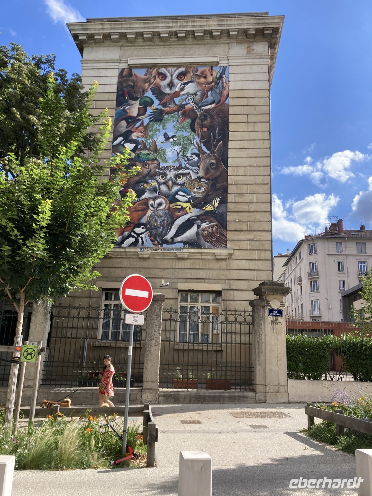 Johannes Paul II. kam hierher. Eine überlebensgroße Statue zeugt von diesem Ereignis. Von hier oben haben die Gästen nicht nur einen wunderbaren Ausblick über die Stadt, tatsächlich befindet man sich hier auch in dem Teil, den schon die Römer besiedelten. Wer in Lyon ist, kommt um gutes Essen nicht herum. In der unterliegenden Altstadt warten zahlreiche Restaurants auf ihre Gäste. Der Bouchon Lyonnais weist den Weg zu einer traditionellen Küche und natürlich dürfen die Traboules nicht fehlen. Was von außen wie der Eingang zu einem Privathaus aussieht, ist ein Wahrheit ein Labyrinth aus Durchgängen. Keine Angst, verlaufen können wir uns hier nicht. Doch eine eine Vielzahl von Häusern ist durch diese Durchgänge verbunden, um schnell einen regenfreien Weg vom Fluss zu den Händlern und Werkstätten zu gewährleisten. In Lyon soll es 500 dieser Traboules geben. Krönender Abschluss des Vormittages ist der Besuch der Markthalle, die nach Paul Bocuse benannt ist. Eine historische Markthalle ist es nicht, aber sie ist vom Warenangebot ein Ort, der selbst in Frankreich seinesgleichen sucht. Auf jeden Fall macht der Besuch Appetit auf das Mittagessen. Alle Ausflügler kehren zum Schiff zurück, wo schon alles für unsere Abfahrt vorbereitet ist. Auch ich bin von meinem Fußmarsch durch die Stadt zurückgekehrt. Allerdings standen bei mir nicht die historischen Sehenswürdigkeiten auf dem Plan, sondern die Wandbilder, die in Lyon zahlreich vertreten sind. Eine Freiluftgalerie, die phantastische Kunst bietet.