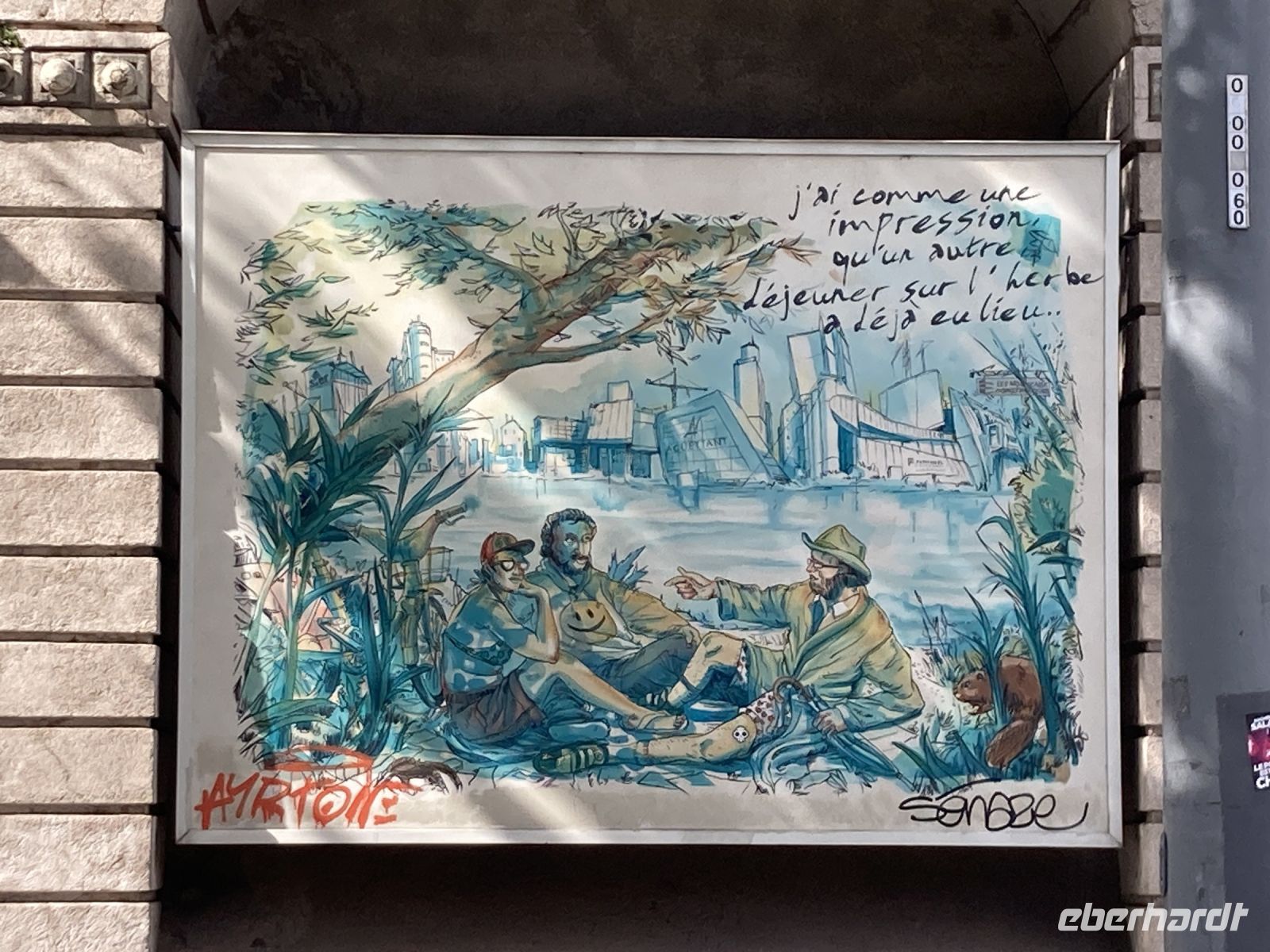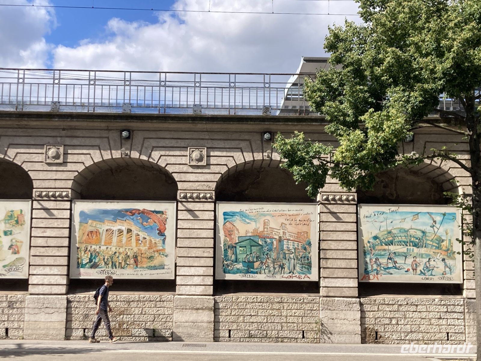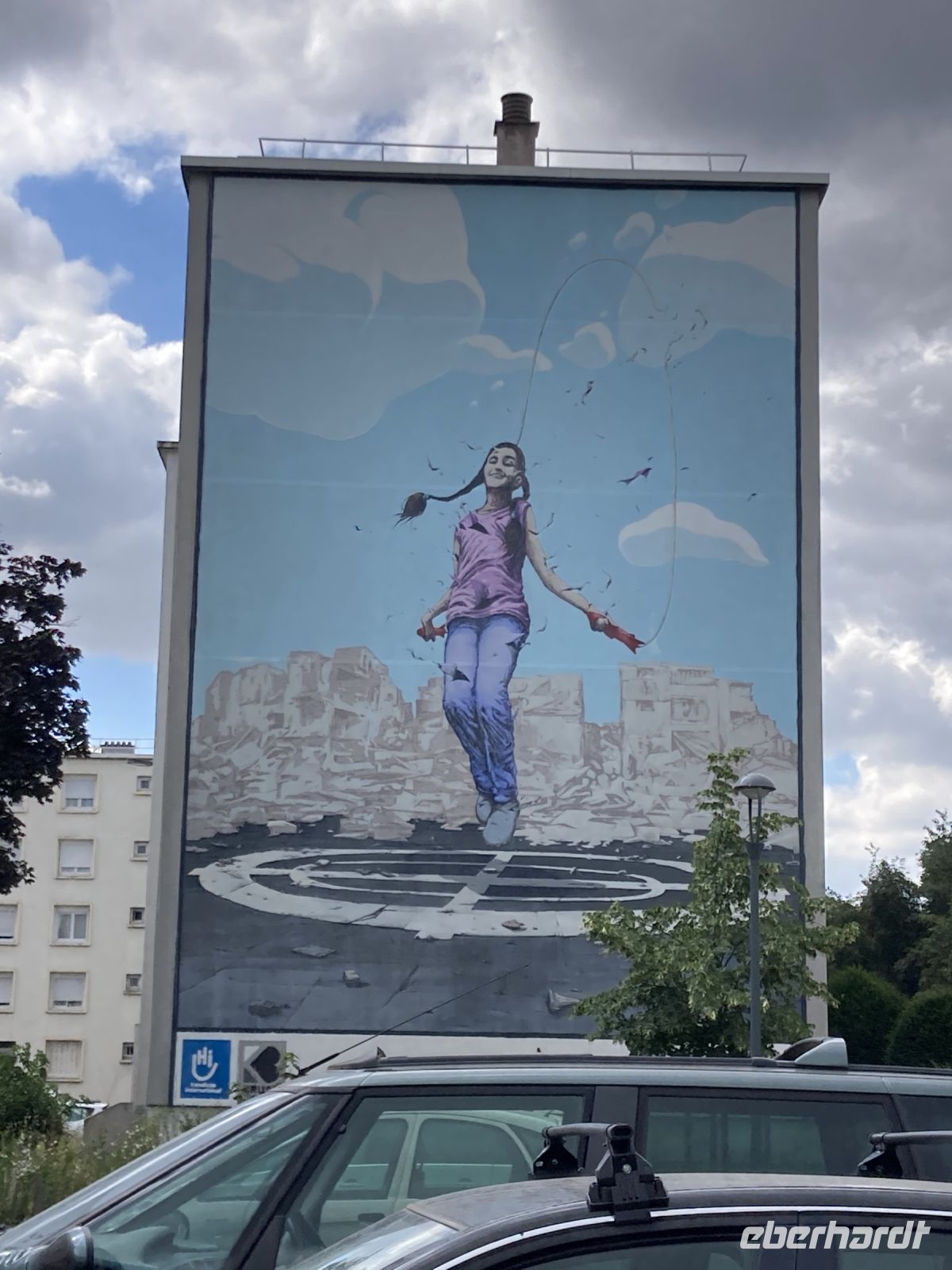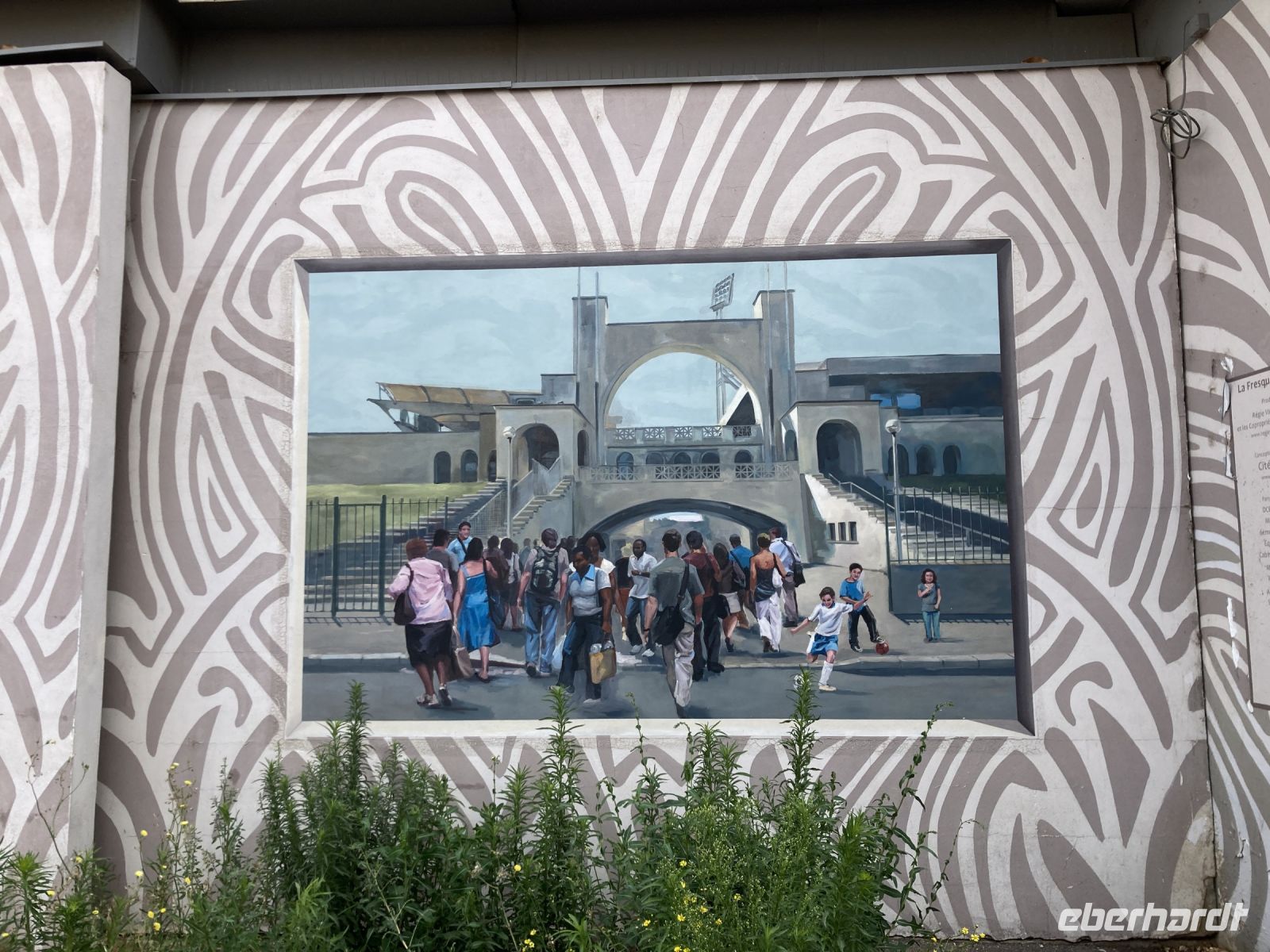 Johannes Paul II. kam hierher. Eine überlebensgroße Statue zeugt von diesem Ereignis. Von hier oben haben die Gästen nicht nur einen wunderbaren Ausblick über die Stadt, tatsächlich befindet man sich hier auch in dem Teil, den schon die Römer besiedelten. Wer in Lyon ist, kommt um gutes Essen nicht herum. In der unterliegenden Altstadt warten zahlreiche Restaurants auf ihre Gäste. Der Bouchon Lyonnais weist den Weg zu einer traditionellen Küche und natürlich dürfen die Traboules nicht fehlen. Was von außen wie der Eingang zu einem Privathaus aussieht, ist ein Wahrheit ein Labyrinth aus Durchgängen. Keine Angst, verlaufen können wir uns hier nicht. Doch eine eine Vielzahl von Häusern ist durch diese Durchgänge verbunden, um schnell einen regenfreien Weg vom Fluss zu den Händlern und Werkstätten zu gewährleisten. In Lyon soll es 500 dieser Traboules geben. Krönender Abschluss des Vormittages ist der Besuch der Markthalle, die nach Paul Bocuse benannt ist. Eine historische Markthalle ist es nicht, aber sie ist vom Warenangebot ein Ort, der selbst in Frankreich seinesgleichen sucht. Auf jeden Fall macht der Besuch Appetit auf das Mittagessen. Alle Ausflügler kehren zum Schiff zurück, wo schon alles für unsere Abfahrt vorbereitet ist. Auch ich bin von meinem Fußmarsch durch die Stadt zurückgekehrt. Allerdings standen bei mir nicht die historischen Sehenswürdigkeiten auf dem Plan, sondern die Wandbilder, die in Lyon zahlreich vertreten sind. Eine Freiluftgalerie, die phantastische Kunst bietet.