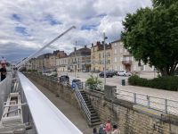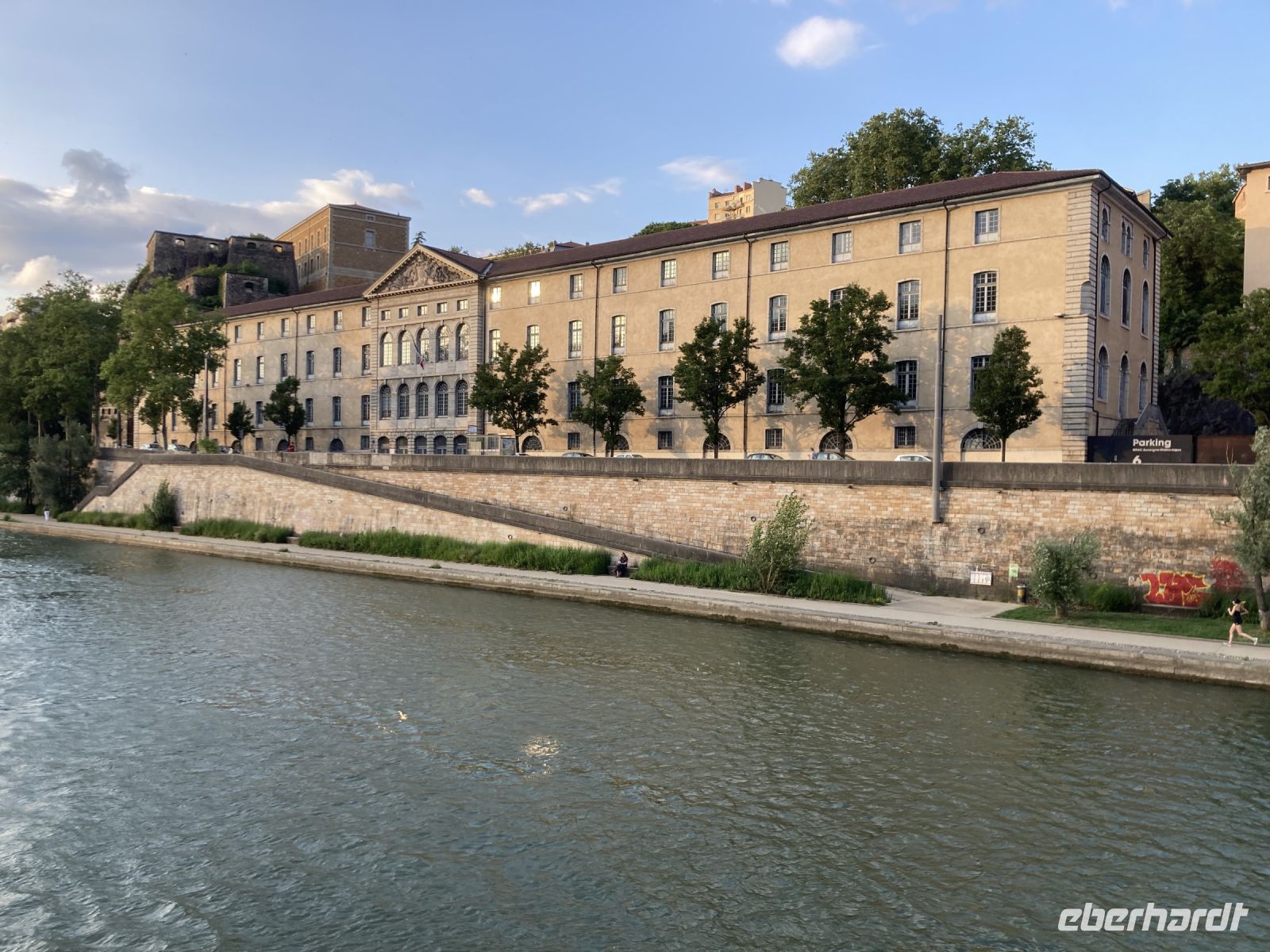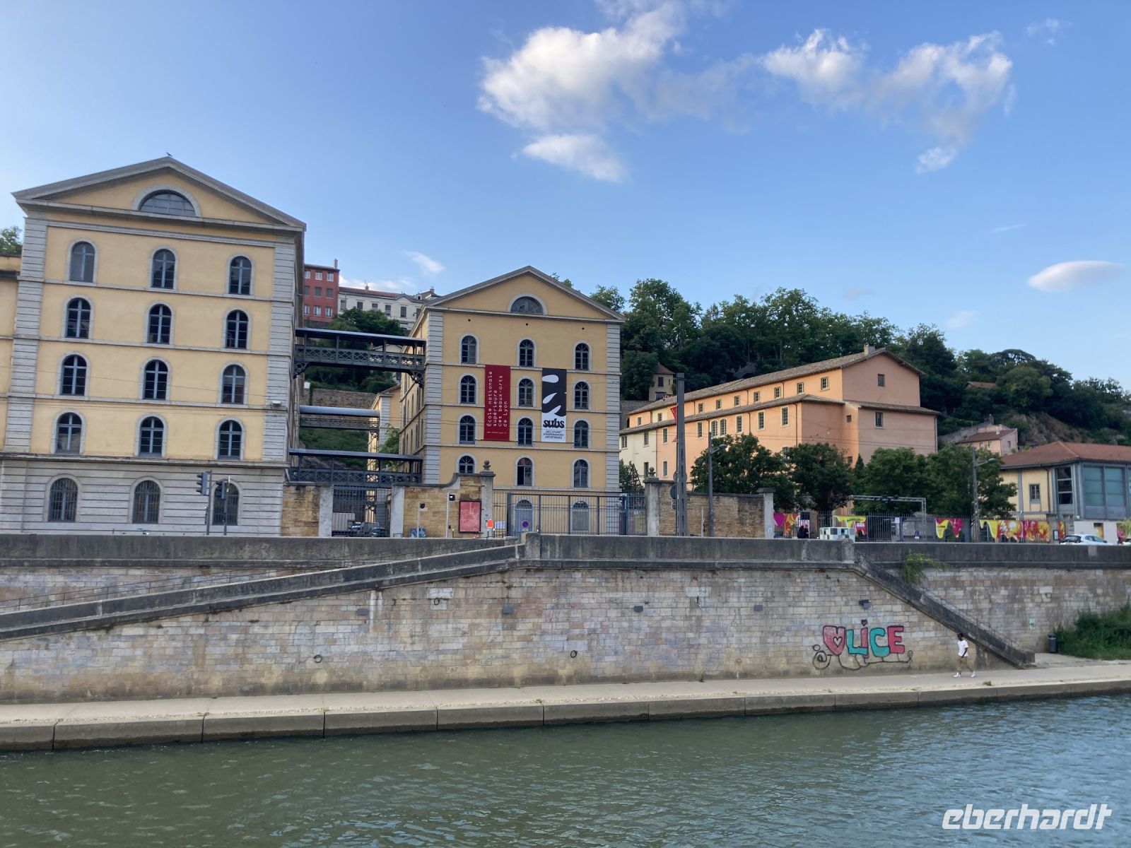 Mâcon haben wir erreicht und damit die Stadt des französischen Nationalspielers Antoine Griezmann, der hier das Licht der Welt erblickte. Heute eher eine beschauliche Kleintadt, war sie in der Geschichte von großer Bedeutung. Während die einen bei ihrem Ausflug nach Cluny unterwegs sind, werden wir einen Rundgang durch Mâcon unternehmen. Lohnend ist ein Spaziergang allemal, denn auch hier stand eins ein mächtiges Kirchenbauwerk, dessen Ausmaße heute nur noch zu erahnen sind. Leider hat der verbliebende Innenbereich heute geschlossen, sonst könnten wir uns am Modell die Größe besser vorstellen. Auch das heutige Museum hat am Montag geschlossen. Doch von außen können wir einen Blick wagen. Heutzutage dient es für Kunstausstellungen. In früheren Zeiten erhielten in dem Kloster der Ursulines junge Mädchen und Frauen eine schulische Ausbildung. Zurück geht das auf die aus Norditalien stammende Angela Merici, die um 1475 geboren wurde. Sie gründete den Orden, um Mädchen eine Schulbildung zu Teil werden zu lassen. Denn der Zugang zu Wissen war Frauen zu dieser Zeit noch verwehrt. Und noch eine Persönlichkeit lernen wir in dieser Stadt kennen. Alphonse Marie Louis Prat de Lamartine wurde hier im Oktober 1790 geboren. Schriftsteller, Lyriker und Außenminister und Demokrat, ein wahrer Homme de lettre, ein Mann des Wortes. Unser Spaziergang durch die Hauptstadt des Südburgunds endet nun auch, denn auf dem Sonnendeck wartet schon eine kulinarische Überraschung. Das Schöne an Flusskreuzfahrten ist, dass jeder es so gestalten kann, wie er oder sie es möchte. Während einige Gäste nach dem Mittagessen zur Weinverkostung aufbrechen, fahren wir anderen nun mit dem Schiff in Richtung Lyon. Unsere Ausflügler werden wir wieder in Trévoux an Bord nehmen. Nun bleibt uns noch die Einfahrt nach Lyon, bei der die meisten auf dem Sonnendeck Platz nehmen, um sich schon einen Überblick über die Sehenswürdigkeiten der Stadt zu verschaffen..