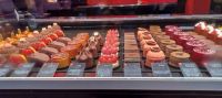 Am dritten Ausstieg besichtigen wir eine Markthalle, von denen es mehrere verteilt über die Stadt gibt. Aber diese sei die Gourmet-Halle mit dem Namen "Paul B Regionale Produkte, z.T. veredelt durch traditionelle Rezepturen. Ein Vorreiter für die feine Küche war der Meisterkoch Paul Bocuse", der das erste 3-Sternerestaurant in Lyon führte u.2018 im Hohen Alter verstarb. Seine Lebensgeschichte ist bemerkenswert, u. er wird nicht nur von Fachkollegen verehrt, sondern auch von der Stadt, die ihn in vielfältigster Formen als Werbeikone über seinen Tod hinaus weiterträgt. Wir nehmen eine kleine Salamiverkostung mit Rotwein vor u. halten die wunderbaren Produktpräsentationen auf Fotos fest.