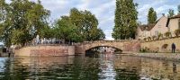 Ein ausgiebiges frühes Frühstück, dann verlassen wir das Schiff. Unser Fahrer, Jevgeniy, bringt uns nach Straßburg, wo wir am Nachmittag ein Hotel außerhalb des Altstadtrings beziehen. 16:00 Uhr starten wir per Bus u. zu Fuß bis zum Münster u. haben Gelegenheit zu einer individuellen Innenbesichtigung. Unsere Reiseleiterin ortet in der Zwischenzeit den Schiffsanleger u. das Abendrestaurant, so dass wir mit gezielter Nautik als letzte Gruppe das Boot besetzen u. eine wunderbare einstündige Fahrt auf der Ill u. ihren Nebenarmen durchführen. Wir passieren das Viertel "Petite France", die Festung, biegen über eine Schleusung in den Nebenarm, unterqueren zahlreiche kleine blumengeschmückte Brücken. Menschen säumen die Ufer, winken uns zu, ein Pärchen küsst sich innig auf der Brücke, wir klatschen Applaus. Wir sehen das "Deutsche Viertel", das in der Kaiserzeit errichtet wurde u. das moderne "Europa-Viertel" mit den Gebäuden wichtiger Europäischen Organisationen sowie die Sendezentrale des Senders "Arte". Eine wunderbare Architekturkombination hat Straßburg mit viel Grün.