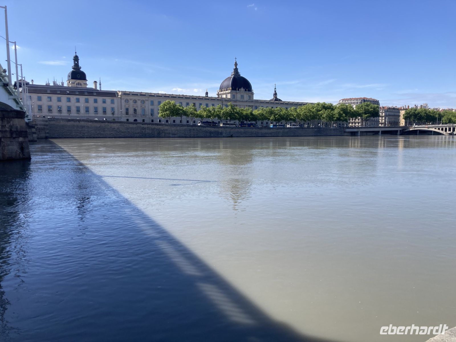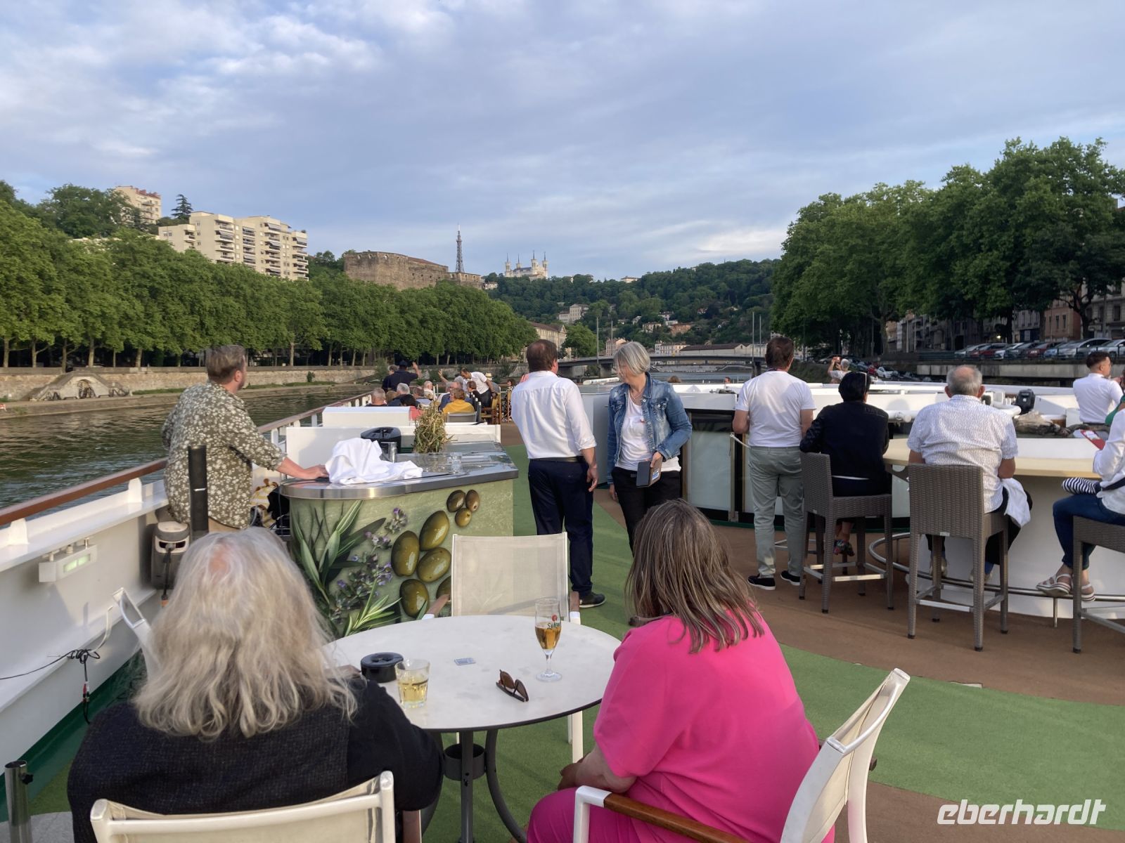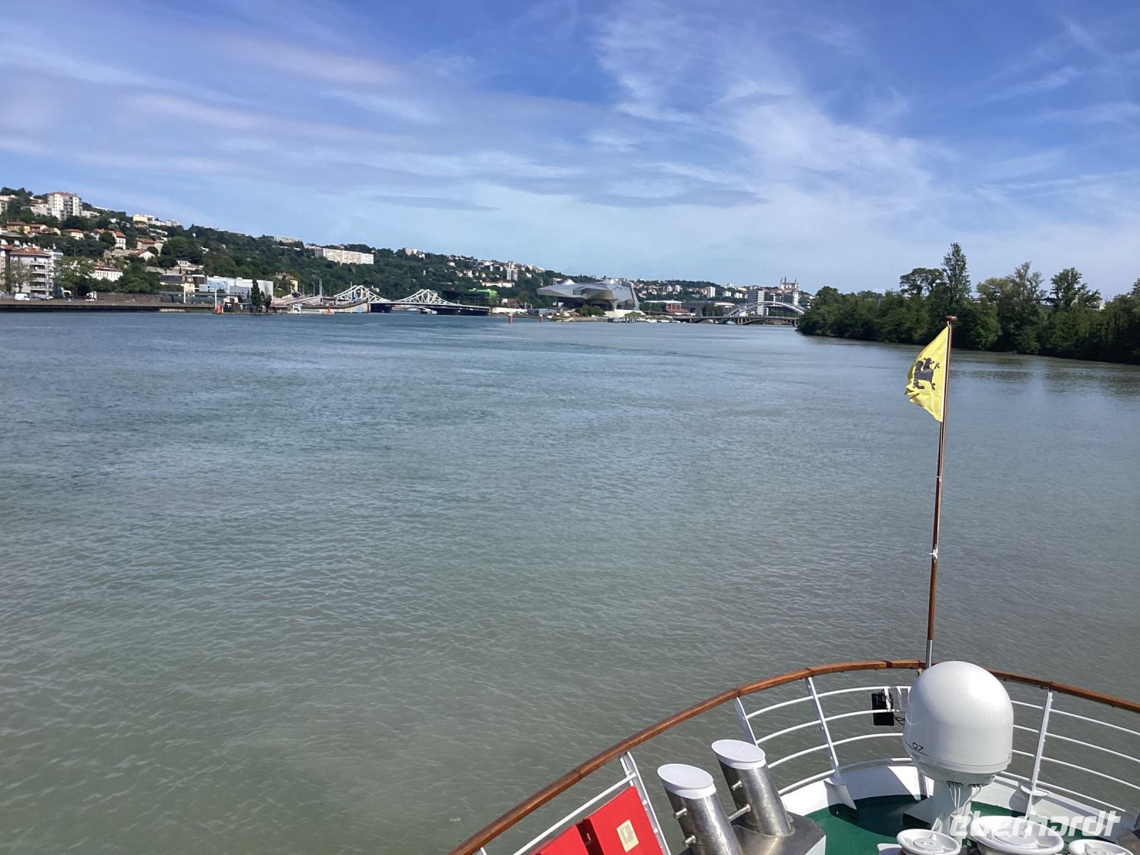 Keine Ferien und zudem noch ein Sonntag, das sind die Zutaten für eine gute Busfahrt ohne Stau. Auf unserer Fahrt nach Lyon durchfahren wir mehrere Départements, darunter auch das kleinste kleinste Frankreichs: Belfort. Aus dem Bus lässt sich die Festungsanlage sehen, die der Baumeister Vauban, der Spezialist für Militäranlagen unter Ludwig, XIV, plante. An Belfort schließt sich das weniger bekannte Département Franche-Comté an. Einmal mehr wird auf unserer Anreise deutlich, wie wichtig die Landwirtschaft für Frankreich ist. Kurz nach 15 Uhr erreichen wir Lyon und den Anleger. Mit ihren Ausweisdokumenten können die Gäste an der Rezeption einchecken, um gleich darauf ihre Kabine zu beziehen, Eine kleine Stärkung erwartet die Gäste im Restaurant. Die einzige Veranstaltung, die verpflichtend ist, ist die Sicherheitseinweisung. Der krönende Tagesabschluss ist eine Panoramafahrt auf der Saône, so dass wir auch schon die Altstadt von Lyon vom Sonnendeck an uns vorbeiziehen lassen können.