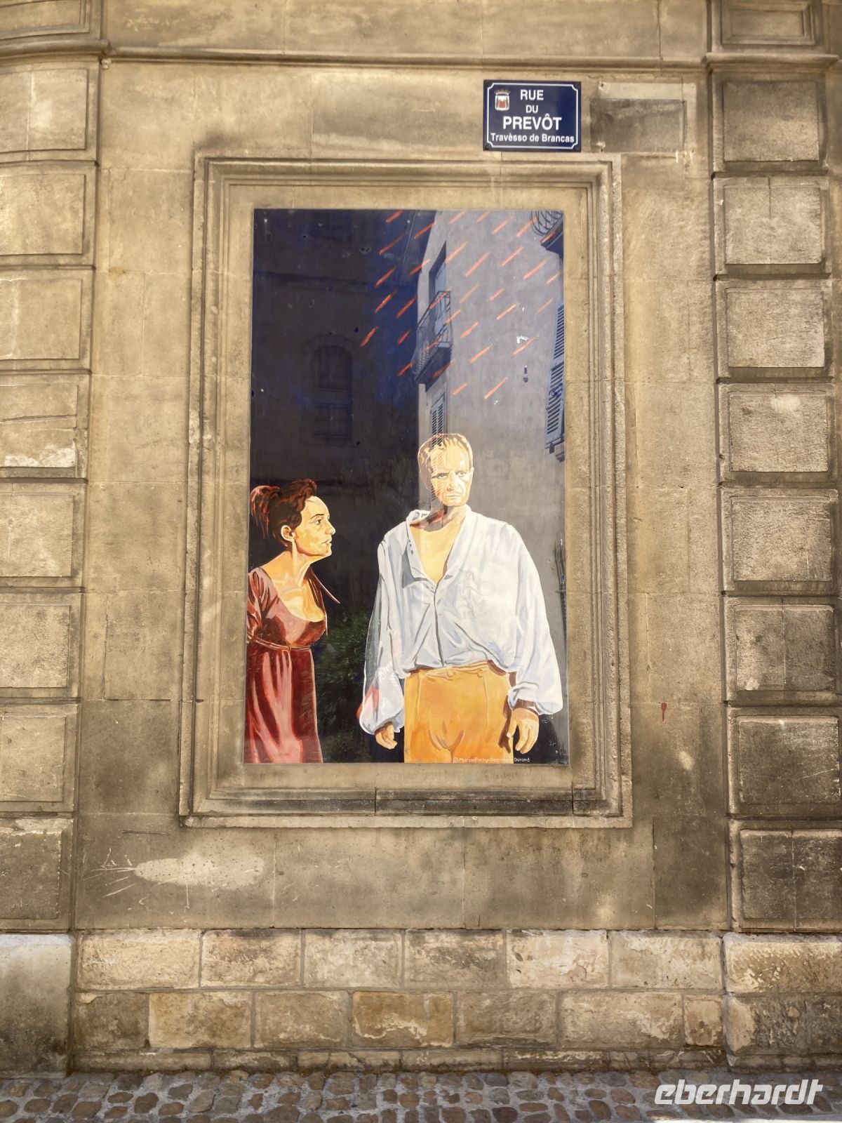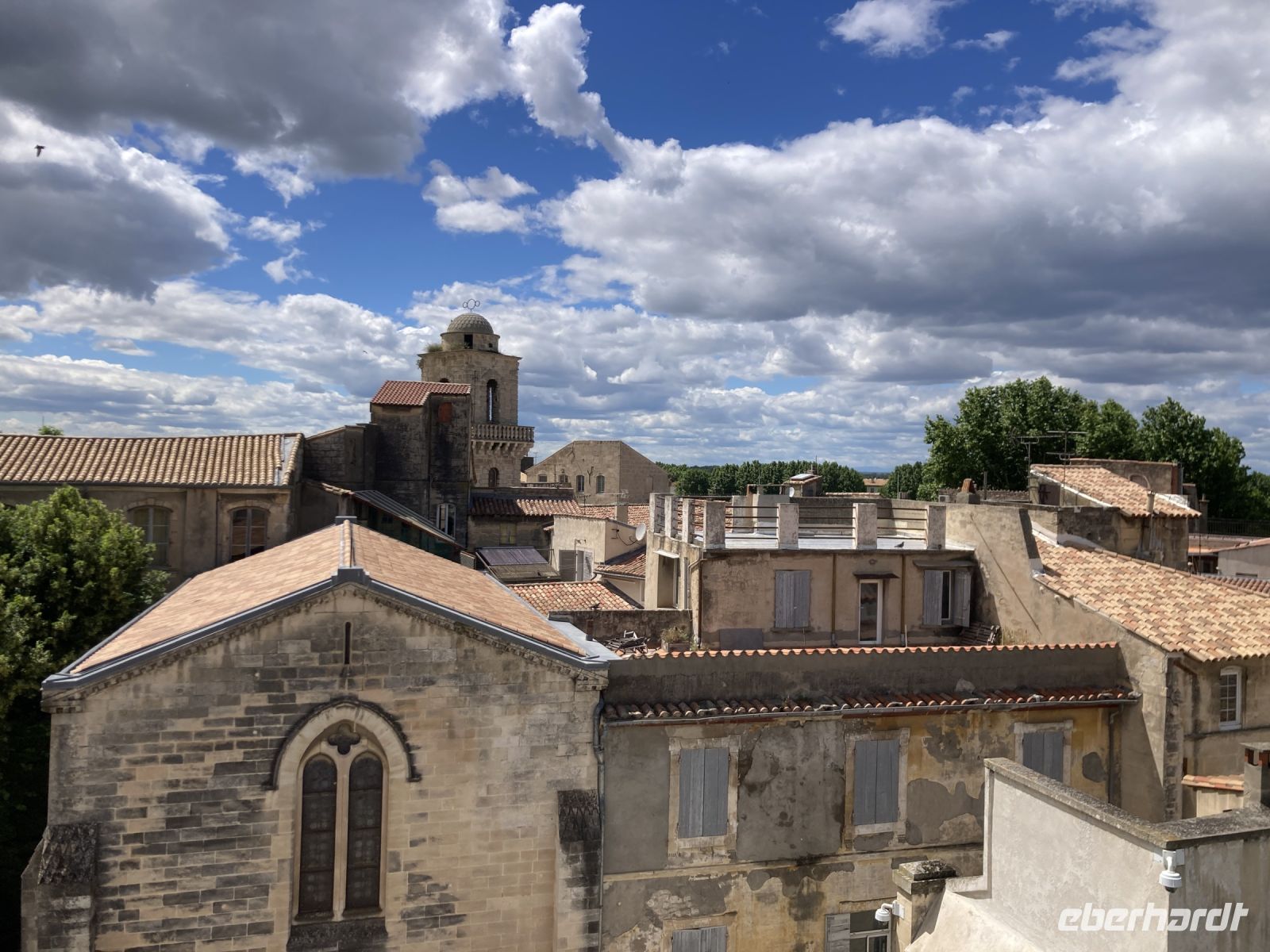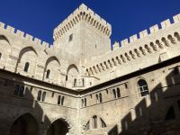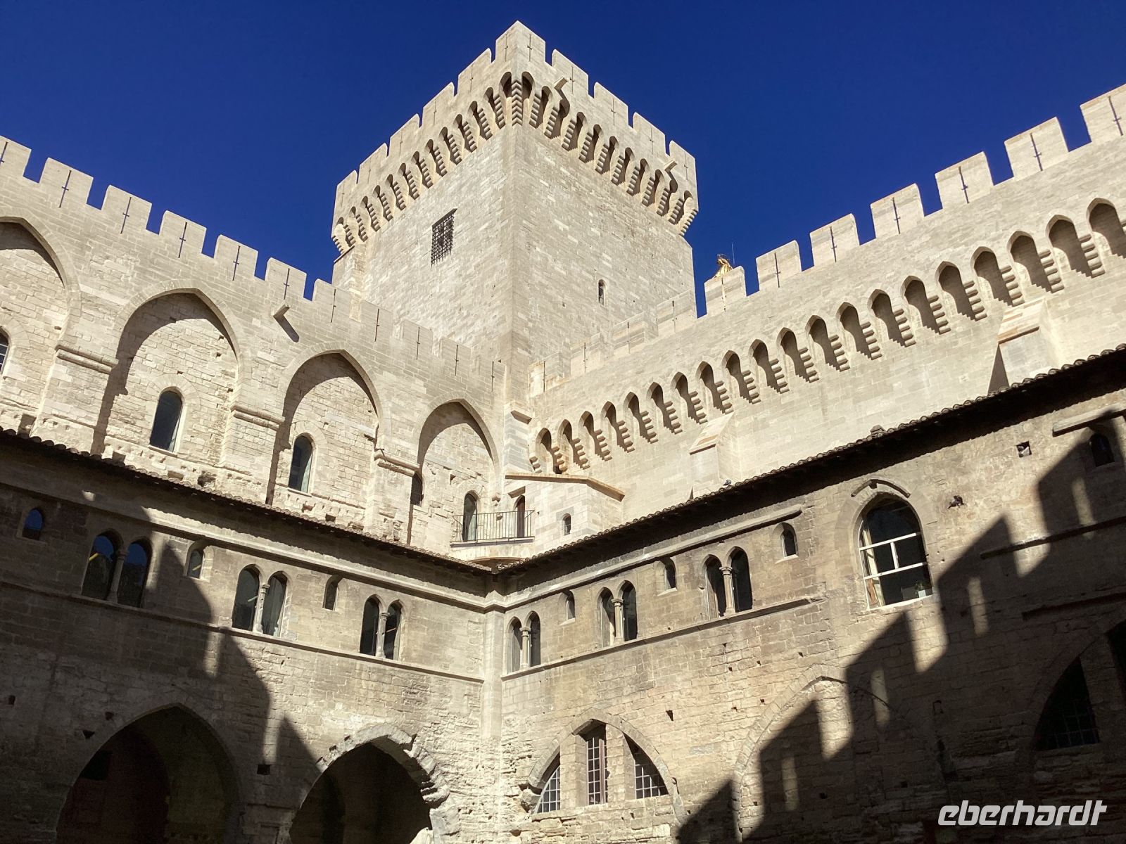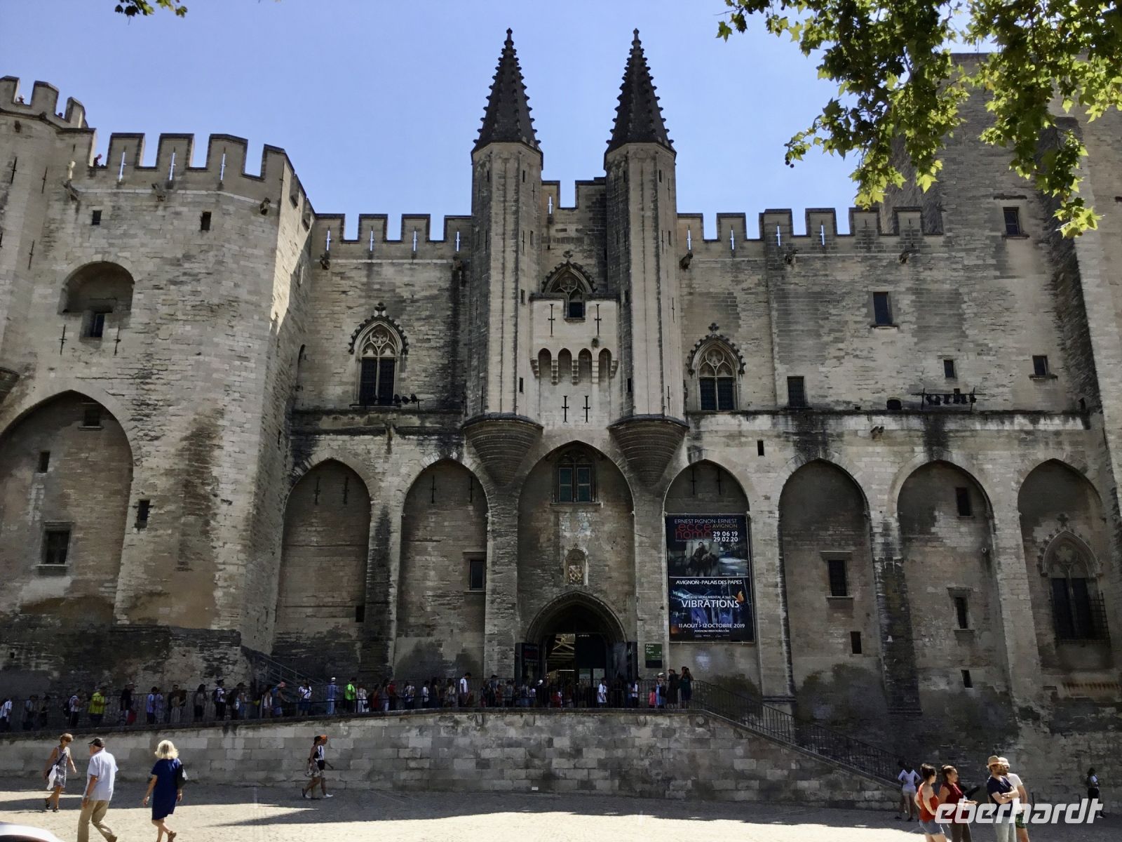 Ein voller Tag steht uns in Avignon zur Verfügung und diese Zeit lässt sich spielend in dieser besonderen Stadt verbringen. Der Vormittag ist dem Stadtrundgang gewidmet, der natürlich in Richtung Papstpalast führt. Die Gäste haben Gelegenheit den Palast auch von innen zu besichtigen. Allerdings hat die Saison schon begonnen und wir sind wahrlich nicht die einzigen Besucher in Avignon. Der Papstpalast ist heute nicht nur Museum, sondern auch Schauplatz des Avignoner Sommer: Zahlreiche Konzerte und Theateraufführungen finden hier statt, weshalb im Innenhof auch die Tribunen mit den Sitzplätzen aufgebaut sind. Noch hat der Theatersommer nicht begonnen und dennoch ist ein Teil des Palastes gesperrt. Louis Vuitton wir hier eine Modenschau präsentieren, weshalb schon die technischen Aufbauten vorgenommen werden. Wer mit offenen Augen durch Avignon läuft, entdeckt an einigen Fassaden Darstellungen von Theaterszenen und Fotos von bekannten Schauspielerinnen und Schauspielern, die in jungen Jahren hier im Sommer an Inszenierungen teilnahmen oder mit Regiegrößen diskutierten.