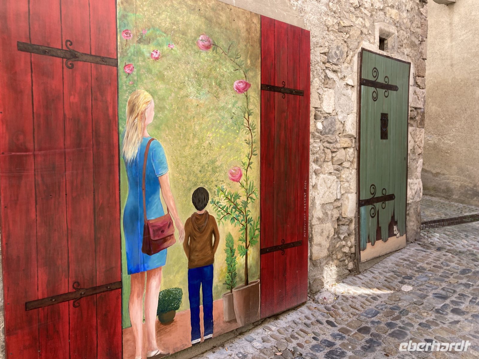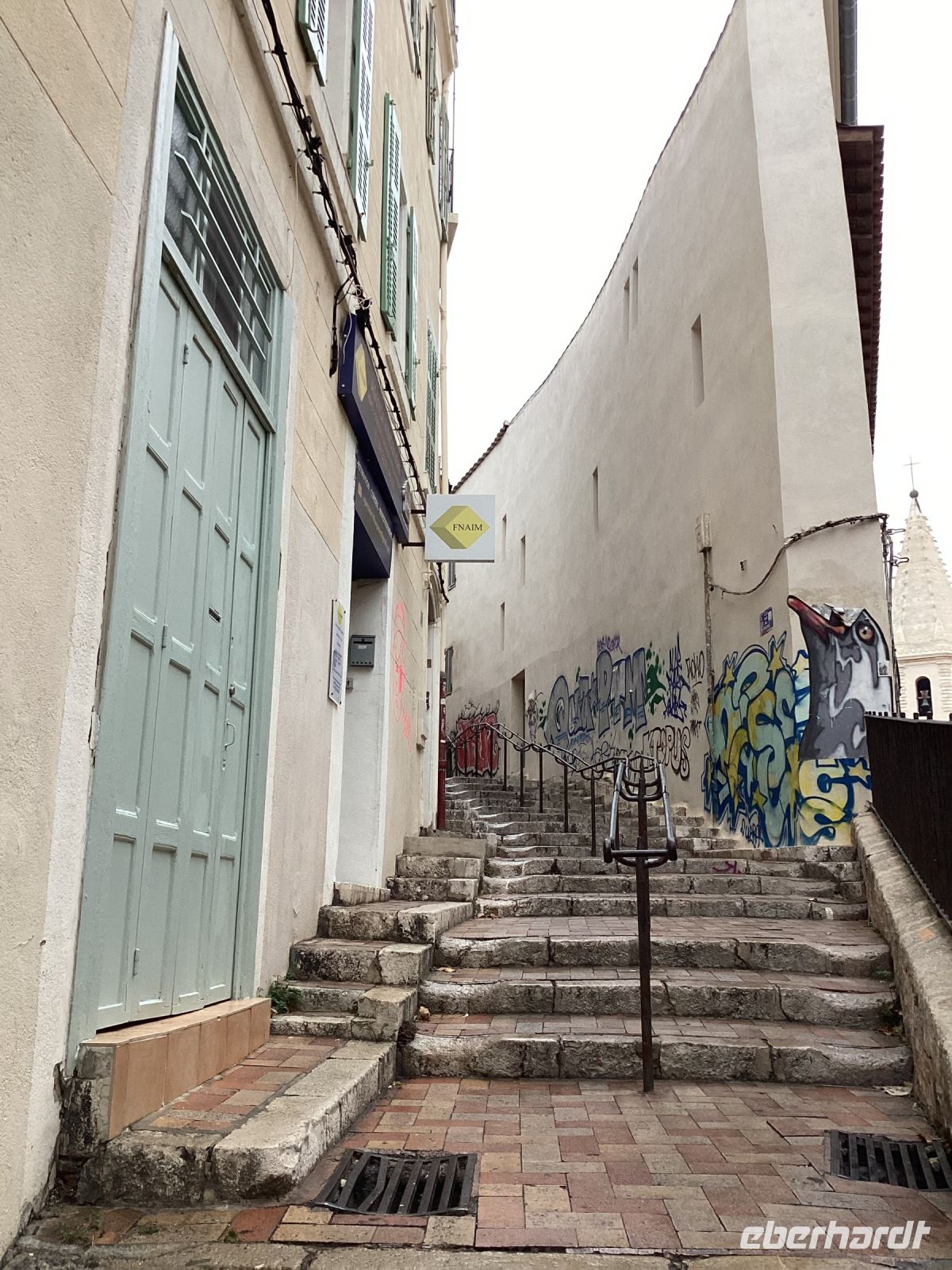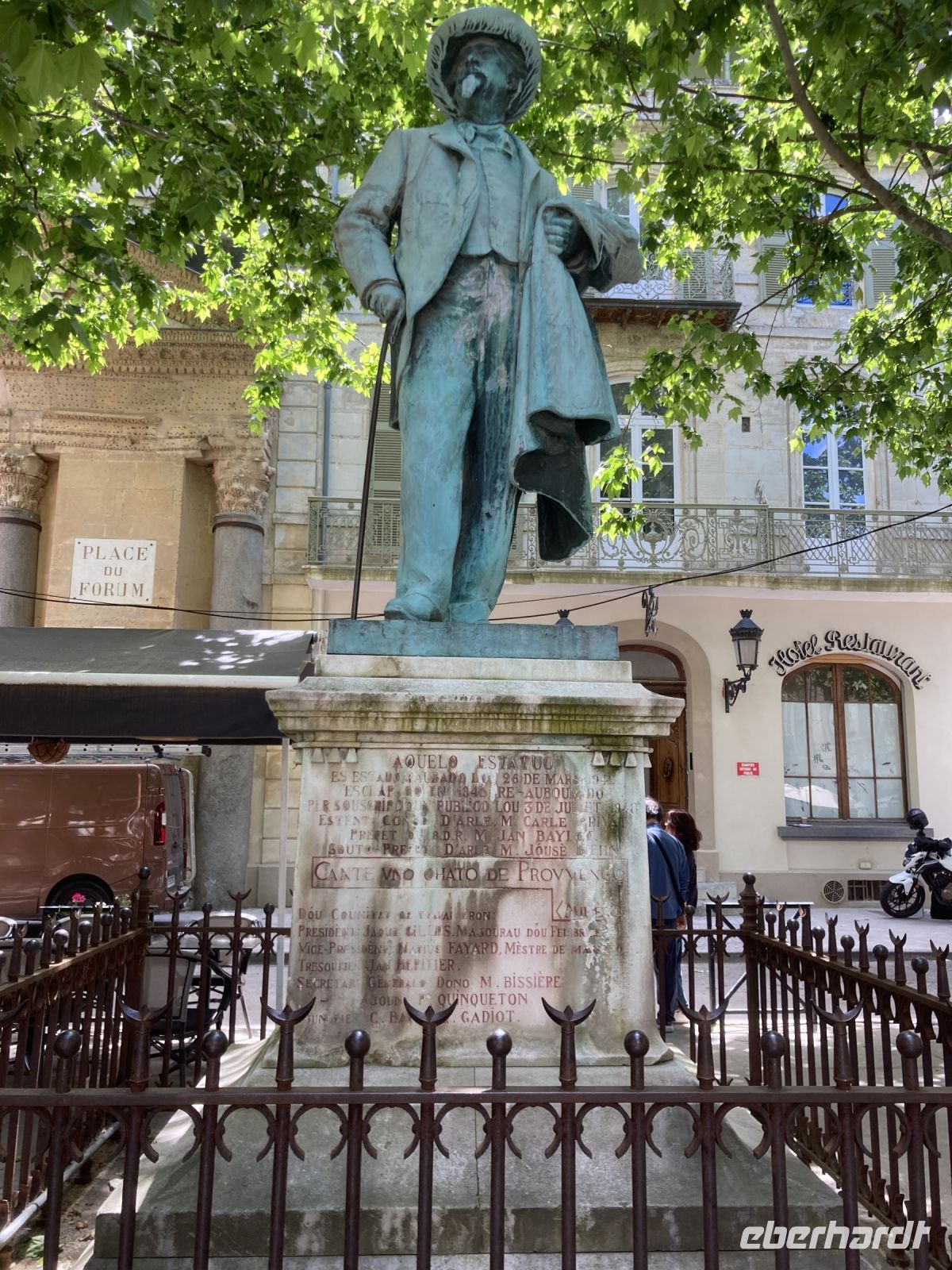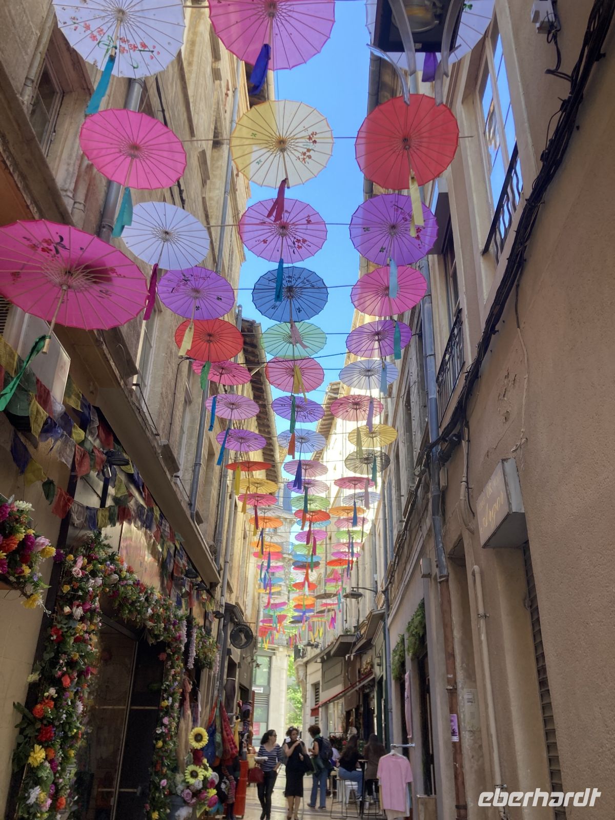 Ein voller Tag steht uns in Avignon zur Verfügung und diese Zeit lässt sich spielend in dieser besonderen Stadt verbringen. Der Vormittag ist dem Stadtrundgang gewidmet, der natürlich in Richtung Papstpalast führt. Die Gäste haben Gelegenheit den Palast auch von innen zu besichtigen. Allerdings hat die Saison schon begonnen und wir sind wahrlich nicht die einzigen Besucher in Avignon. Der Papstpalast ist heute nicht nur Museum, sondern auch Schauplatz des Avignoner Sommer: Zahlreiche Konzerte und Theateraufführungen finden hier statt, weshalb im Innenhof auch die Tribunen mit den Sitzplätzen aufgebaut sind. Noch hat der Theatersommer nicht begonnen und dennoch ist ein Teil des Palastes gesperrt. Louis Vuitton wir hier eine Modenschau präsentieren, weshalb schon die technischen Aufbauten vorgenommen werden. Wer mit offenen Augen durch Avignon läuft, entdeckt an einigen Fassaden Darstellungen von Theaterszenen und Fotos von bekannten Schauspielerinnen und Schauspielern, die in jungen Jahren hier im Sommer an Inszenierungen teilnahmen oder mit Regiegrößen diskutierten.