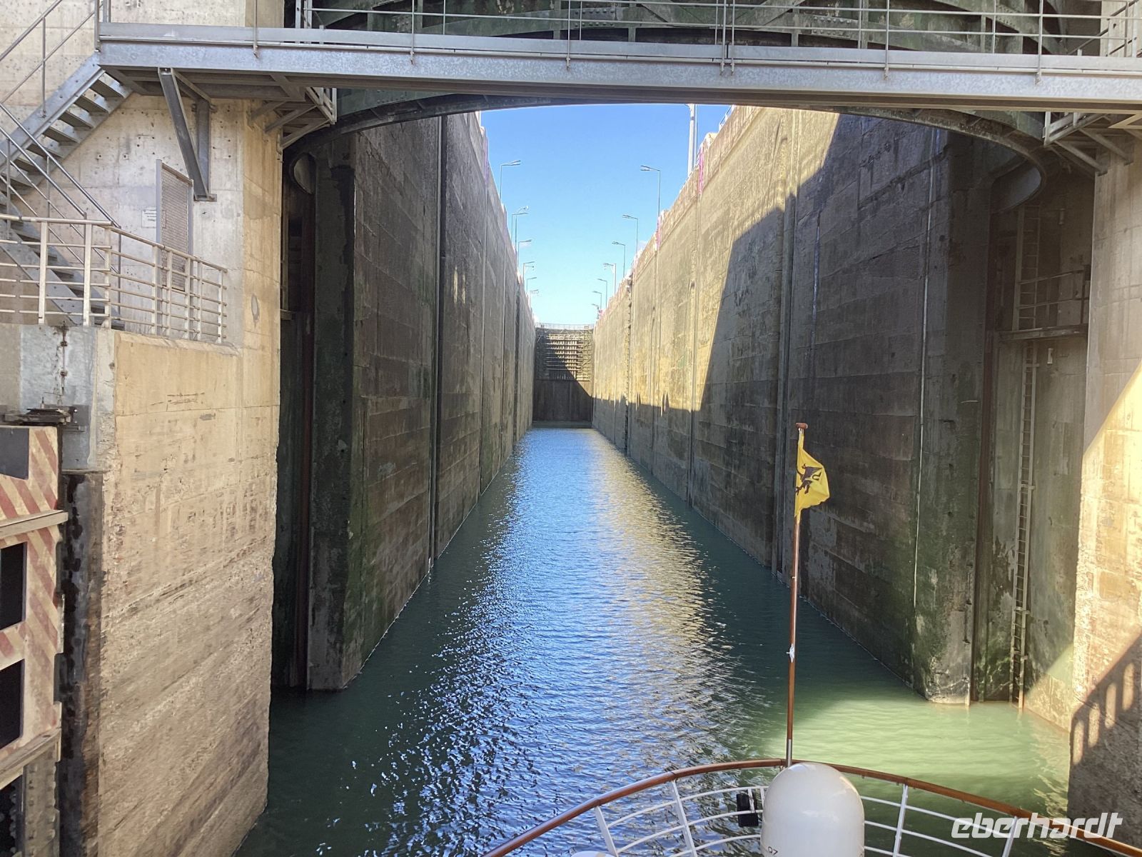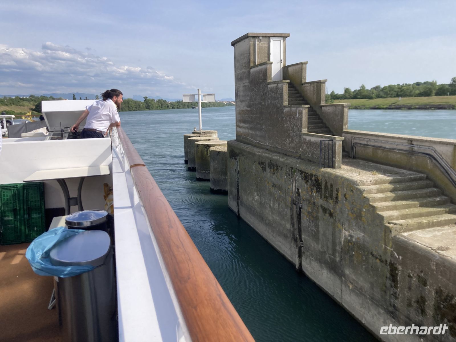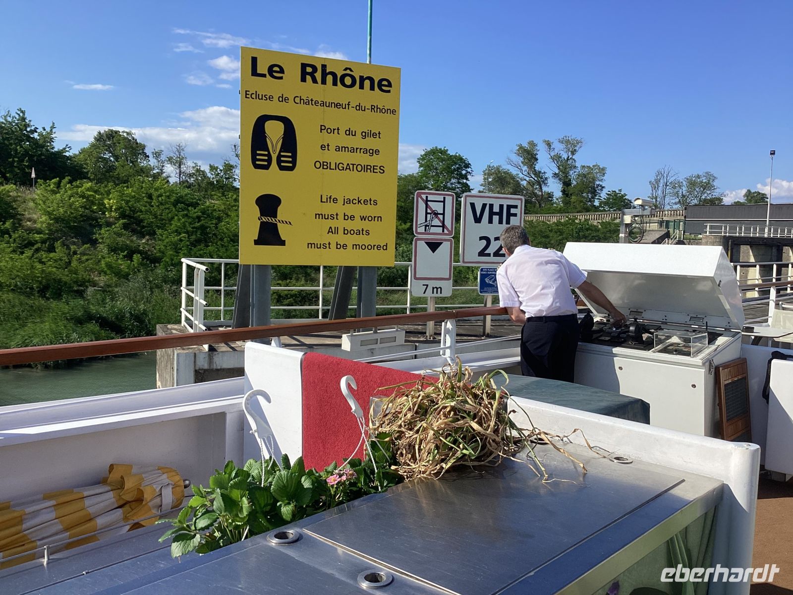 Zuvor besuchen wir jedoch ein Lavendel-Museum. Lavendel gibt es natürlich auch in anderen Regionen. Doch mit dem Süden Frankreich verbinden wir diese Pflanze besonders. Blühende Lavendelfelder sehen wir jetzt noch nicht, wohl aber erfahren wir viel über die Planze an sich und über deren Verwendung in der Kosmetik und als Heilmittel. Im Anschluss geht es nun in das Tal der Ardèche. Ein wunderschöne Landschaft sowohl über- als auch unteririsch. Denn hier hat sich ein Höhlen- bzw. Grottensystem entwickelt, welches auch auf unserem Programm steht. Aber Achtung, es sind doch einige Stufen, die zunächst nach unten, aber eben auch wieder nach oben genommen werden müssen. Für diejenigen, die lieber nicht abtauchen möchten, bietet auch die Landschaft rund um den Eingang zur Höhle reizvolle Fotomotive. Am Nachmittag bietet sich noch ein Rundgang durch das Städtchen Viviers. Auch wenn es heute kam vorstellbar ist. Im Mittelalter war diese Stadt überaus bedeutsam und rech noch dazu. Die kleinste Kathedrale ist ein architektonischer Beleg hierfür. Um 16:30 Uhr heißt es für uns alle : Alle an Bord. Soweit die Theorie. Leider haben zwei Gäste weder diese Zeit berücksichtigt noch haben sie ihre Landgangskarten abgeholt. Ein System funktioniert leider nur so gut, wie sich alle daran halten. Die Eberhardtgruppe wird nun Zeuge von einem Extra-Manöver. Spätestens jetzt sollten jedem Gast verständlich sein, warum der richtige Umgang mit den Landgangskarten so wichtig ist.
