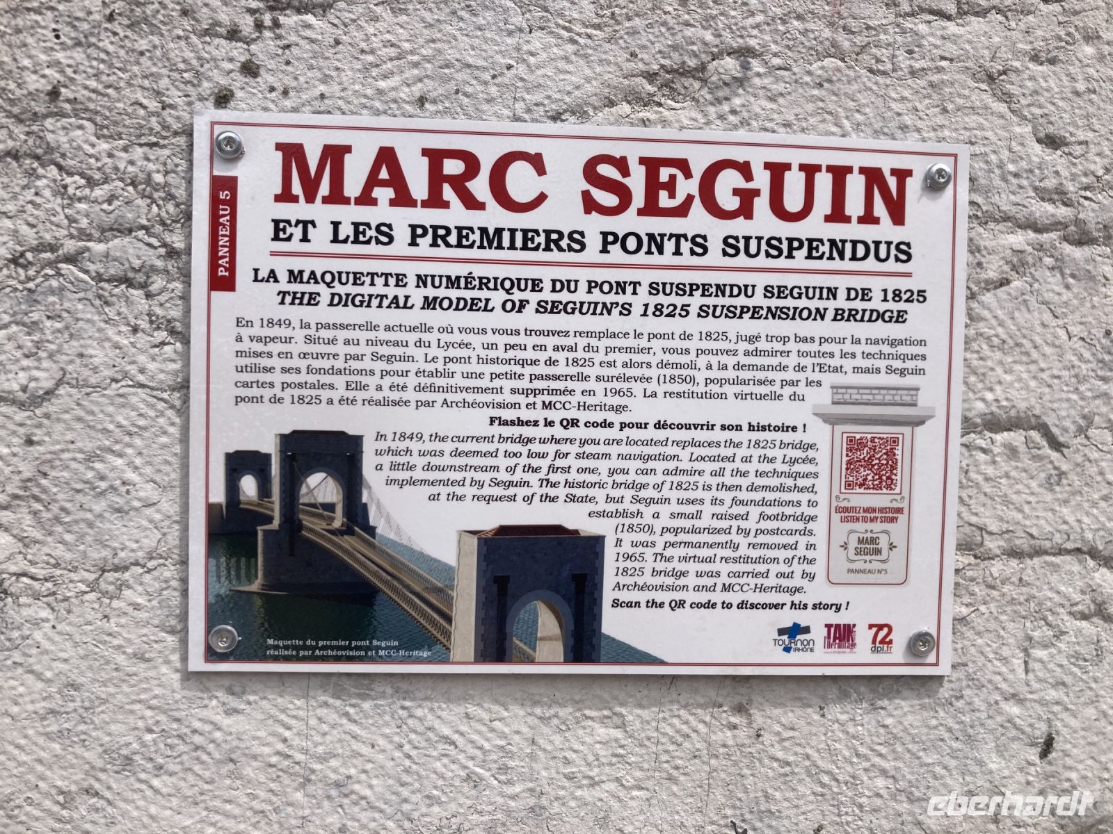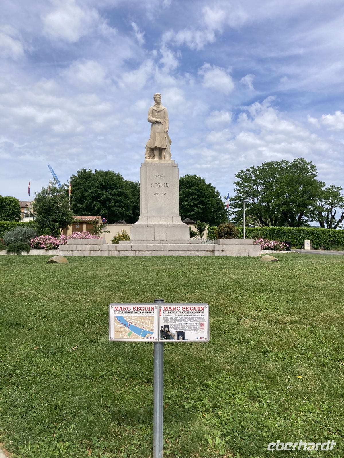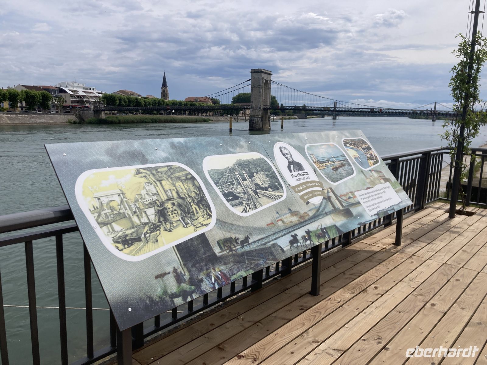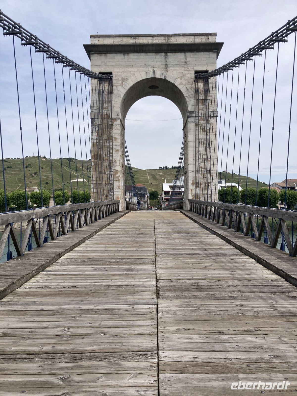 Der Vormittag lässt uns einen mittelalterlichen Ort am Rhône kennenlernen. Die Ausflügler zieht es zunächst mit einer kleinen Bahn auf die andere Flussseite, wo die Weinberge schon gut zu sehen sind. Natürlich darf eine Verkostung nicht fehlen. Aber auch Tournon lockt mit einer schönen Altstadt, schließlich waren die Herren von Tournon einst mächtig. Eine Besonderheit aus dem 19. Jahrhundert ist die Brücke über den Rhône. Die Rhônebrücke von Marc Seguin. Sie wurde Vorbild für viele Brücken entlang des Flusses. Marc Seguin, des Staue uns im der Nähe unseres Anlegers begrüßt, interessierte sich schon für das Bauwesen. Im Jahre 1849 wurde Seguins Hängebrücke in Tournon-sur-Rhône eingeweiht. In 50 Meter Höhe schwebt ihre Fahrbahn über dem Rhônefluss. Vier große Eisenseile, die an massiven Steinpfeilern, die sowohl in Tournon als auch in Tain-l’Hermitage verankert sind, tragen sie. Bahnbrechend innovativ war diese Bauform damals und diente als Modell für weitere Brücken. Doch nun ist unsere Zeit in Tournon-sur-Rhône auch schon beendet und wir treten den Weg in Richtig Avignon an.