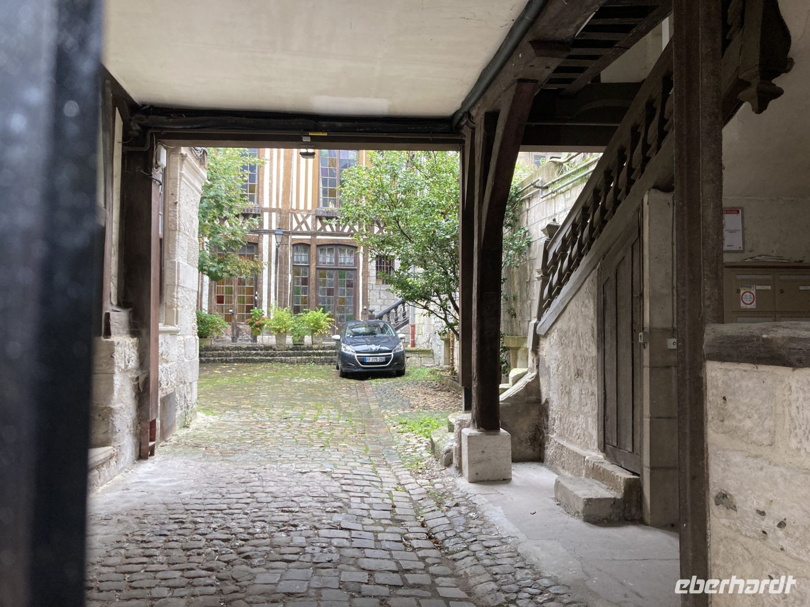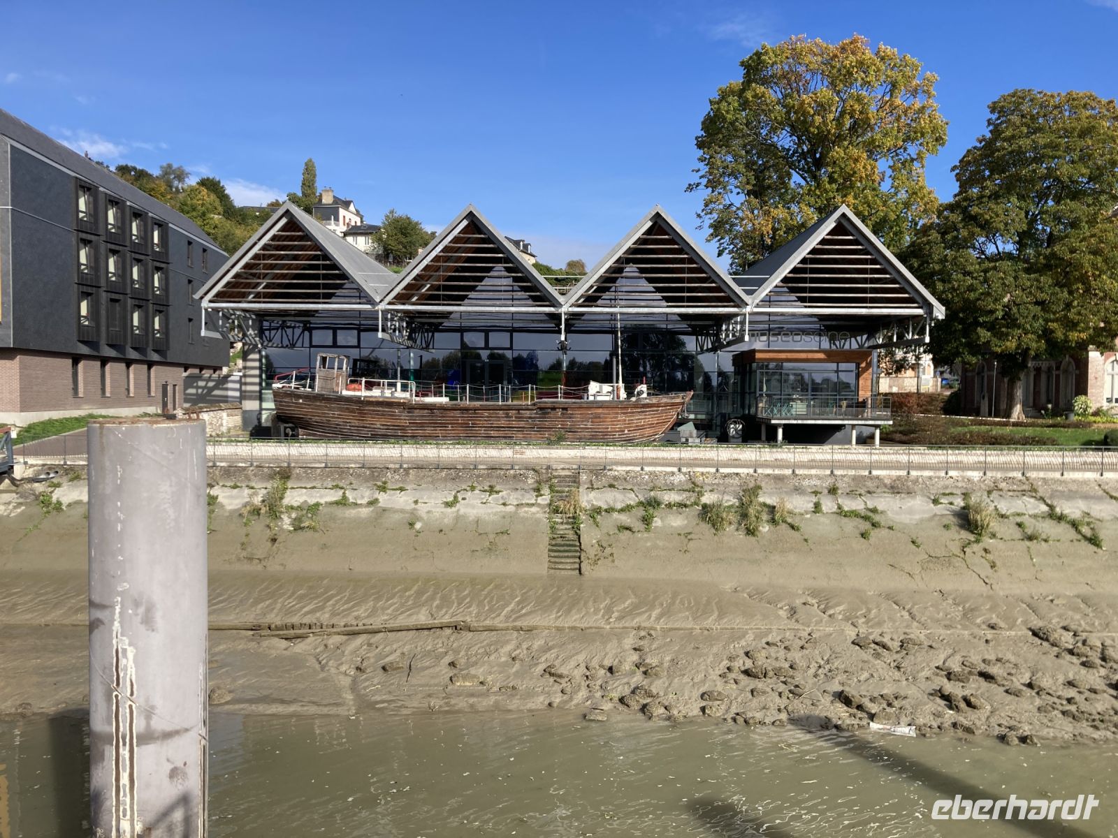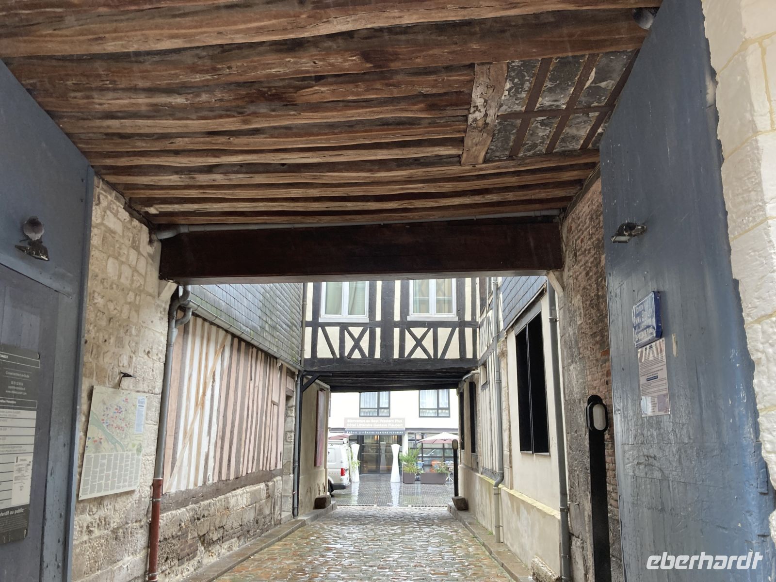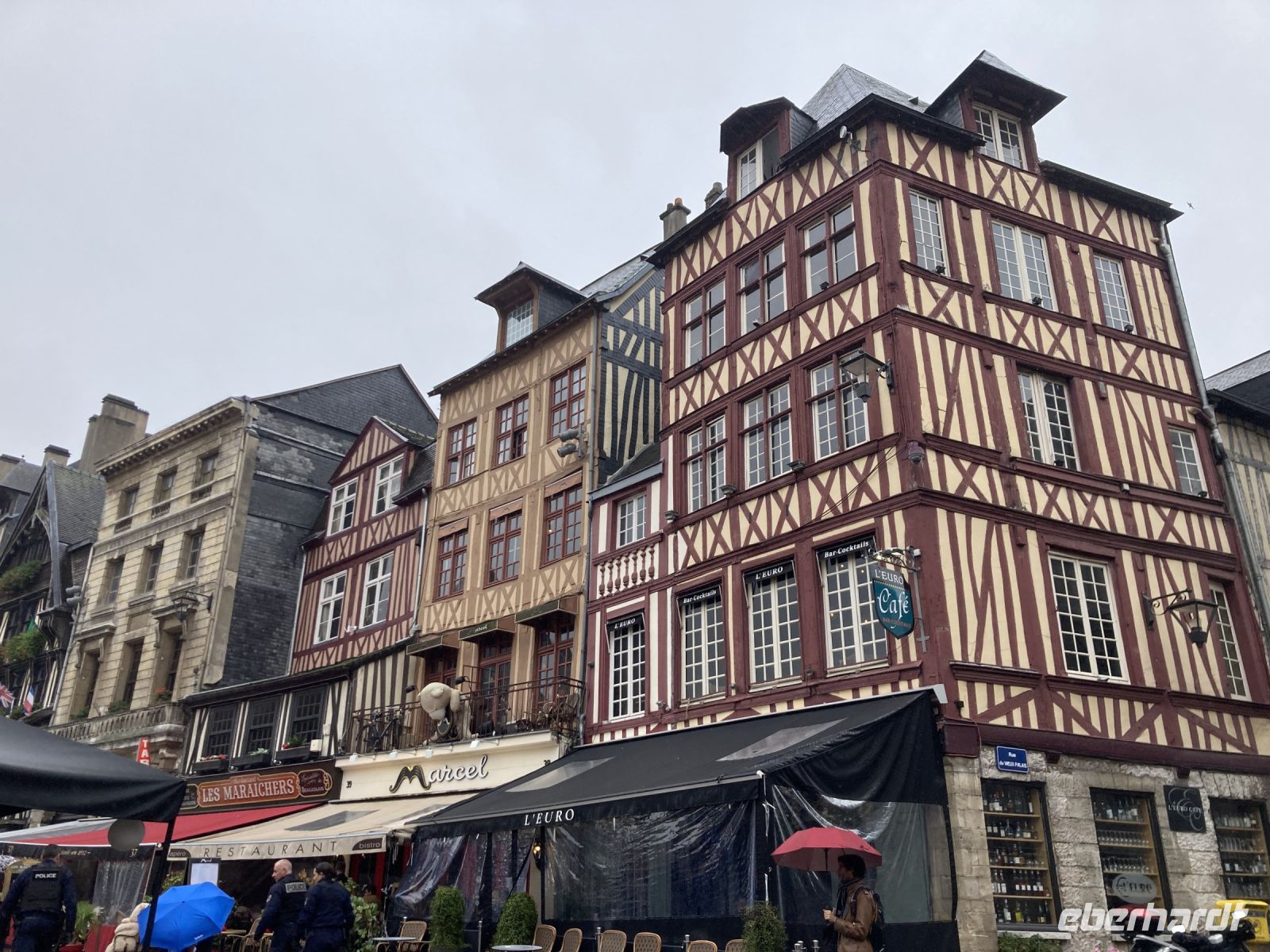 Wach werden wir heute in Caudebec-en-Caux. Wir starten den Tag mit einem gemütlichen Rundgang durch den Ort. Das Seine-Museum lädt schon mit einem Bootstyp, mit dem über Jahrhunderte Waren transportiert wurden. Die ersten Stände für den Flohmarkt sind auch schon aufgebaut. Es gibt also einiges zu sehen in dem kleinen Städtchen. Wir wollen zunächst zur Notre-Dame. Ein wunderbares Westportal zeichnet die Architektur aus. Zu entdecken gibt es so manche Kuriosität, vor allem die Darstellungen der Musikern und ein männliches Wesen, welches sich nun so gar nicht demütigt verhält, sind hier zu entdecken. Im Inneren sehen wir noch schöne Kirchenfenstern und ein besonderes Kreuz ist am Altarstein abgebildet. Die Templer scheinen hier gewesen zu sein. Auch ein anderes Gebäude im Ort spricht dafür: la Maison des Templiers aus dem 12. bis 13. Jahrhundert. Wir schlendern über dem Flohmarkt zurück zum Schiff, wo langsam auch das Mittagessen auf uns warten. Nach dem Essen geht es an die Küste. Deauville, Trouville und Honfleur. Drei Städte, die für die Normandie bedeutsam sind. Das Wetter spielt zum Glück einigermaßen mit. In Caudebec-en-Caux regnete es heftig.