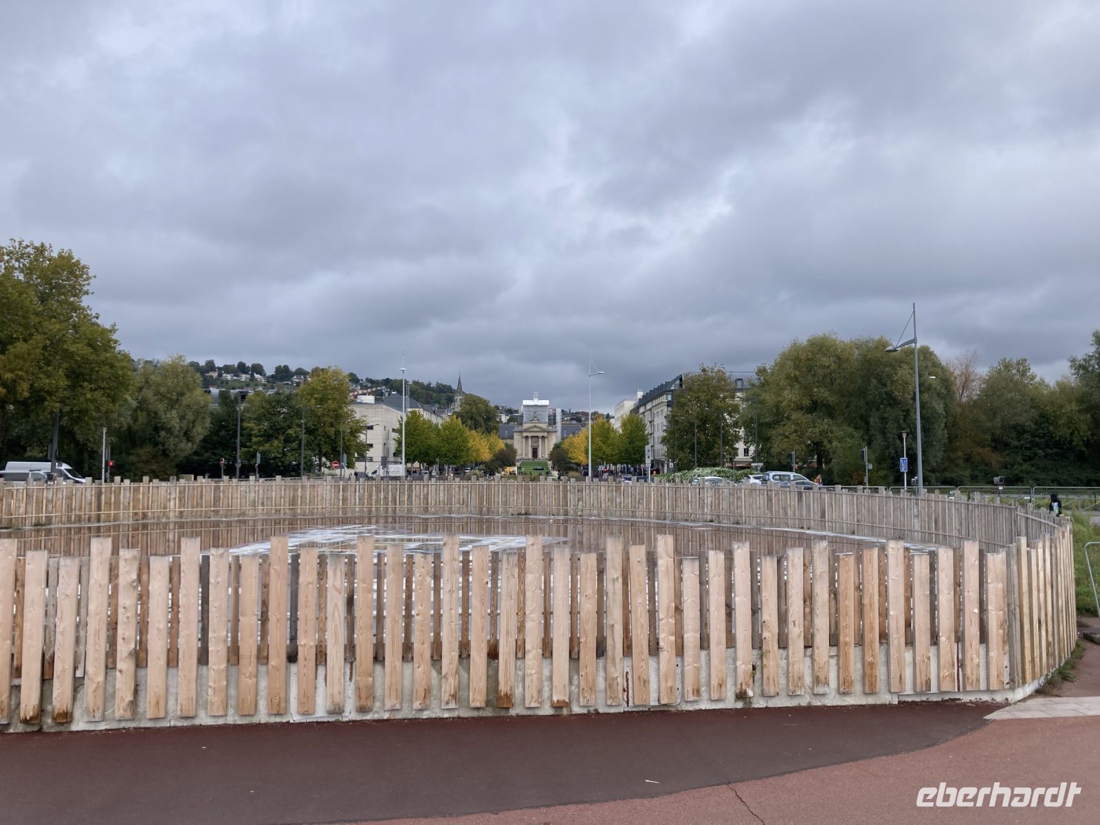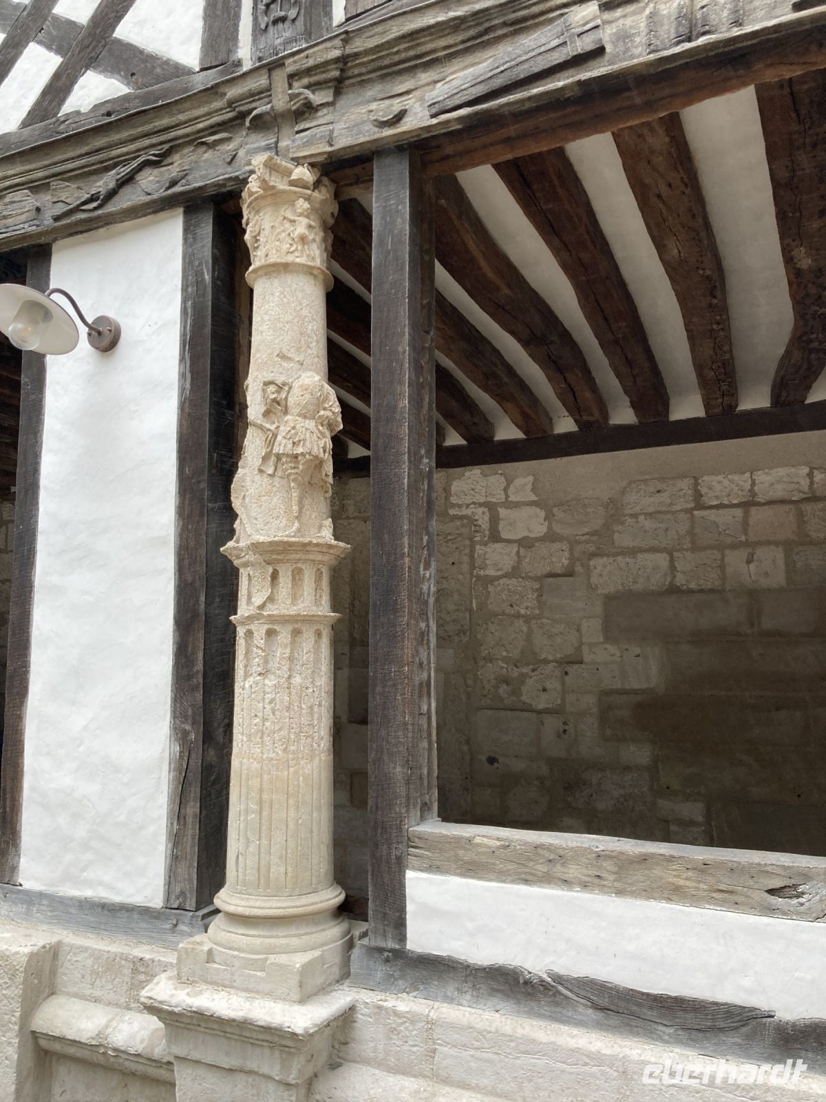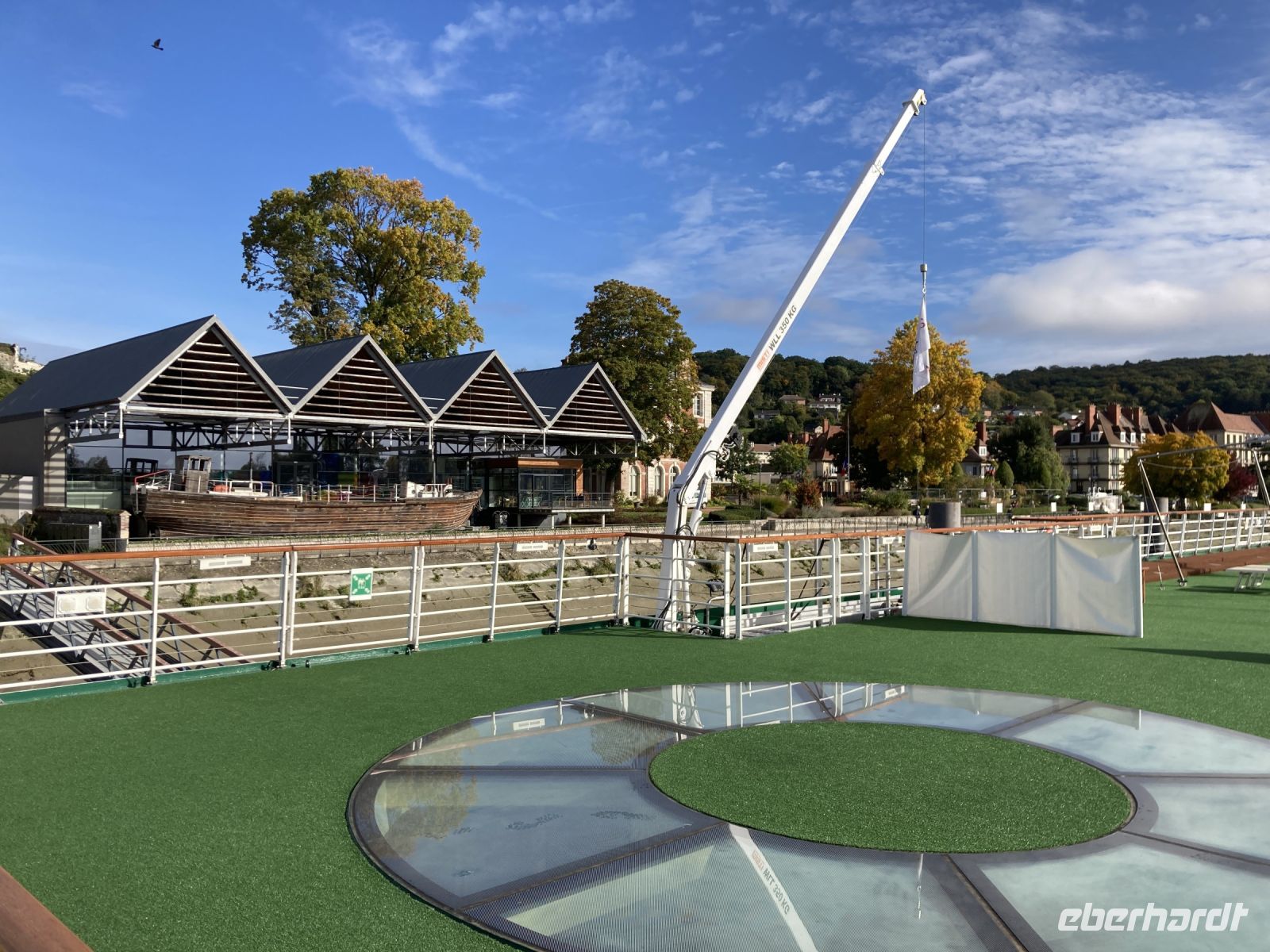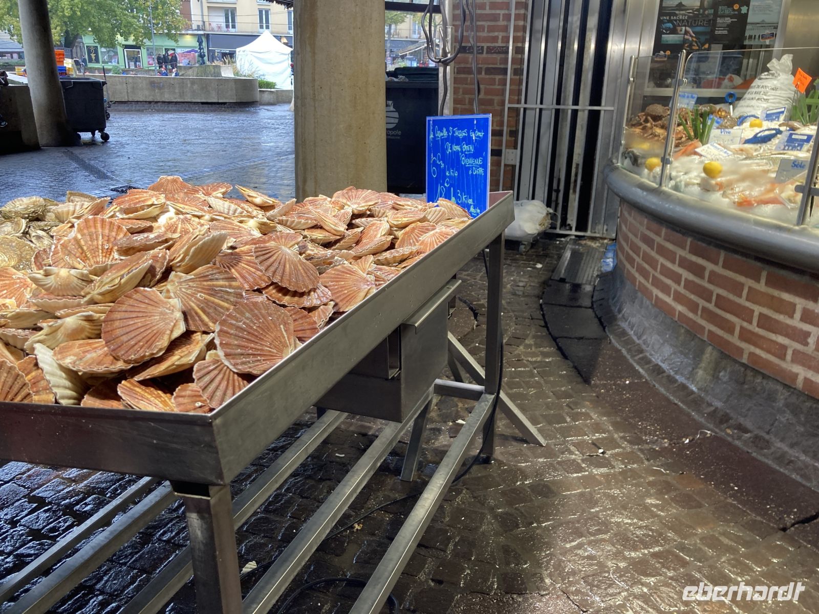 Wach werden wir heute in Caudebec-en-Caux. Wir starten den Tag mit einem gemütlichen Rundgang durch den Ort. Das Seine-Museum lädt schon mit einem Bootstyp, mit dem über Jahrhunderte Waren transportiert wurden. Die ersten Stände für den Flohmarkt sind auch schon aufgebaut. Es gibt also einiges zu sehen in dem kleinen Städtchen. Wir wollen zunächst zur Notre-Dame. Ein wunderbares Westportal zeichnet die Architektur aus. Zu entdecken gibt es so manche Kuriosität, vor allem die Darstellungen der Musikern und ein männliches Wesen, welches sich nun so gar nicht demütigt verhält, sind hier zu entdecken. Im Inneren sehen wir noch schöne Kirchenfenstern und ein besonderes Kreuz ist am Altarstein abgebildet. Die Templer scheinen hier gewesen zu sein. Auch ein anderes Gebäude im Ort spricht dafür: la Maison des Templiers aus dem 12. bis 13. Jahrhundert. Wir schlendern über dem Flohmarkt zurück zum Schiff, wo langsam auch das Mittagessen auf uns warten. Nach dem Essen geht es an die Küste. Deauville, Trouville und Honfleur. Drei Städte, die für die Normandie bedeutsam sind. Das Wetter spielt zum Glück einigermaßen mit. In Caudebec-en-Caux regnete es heftig.