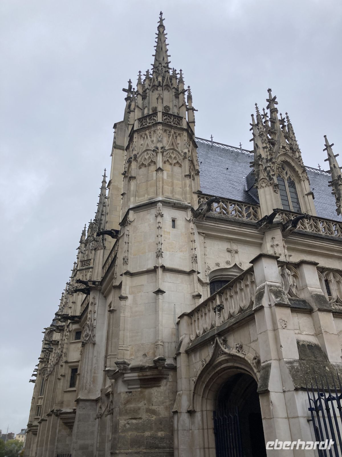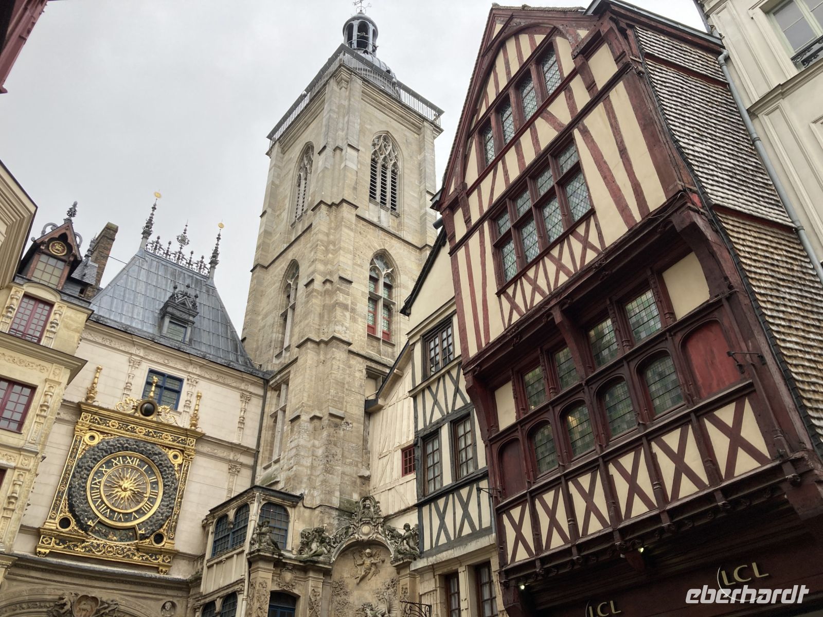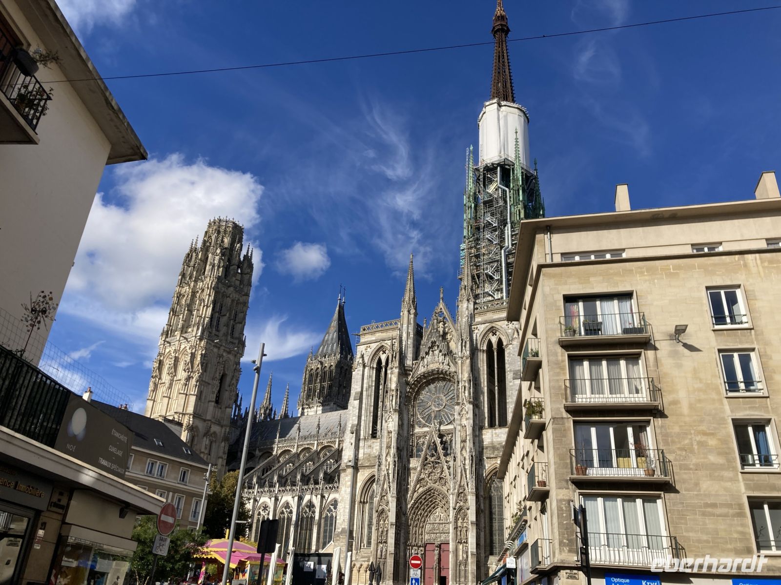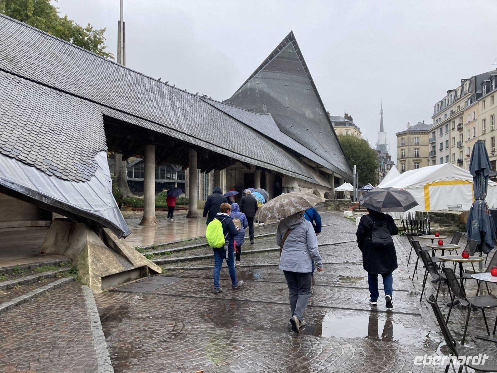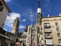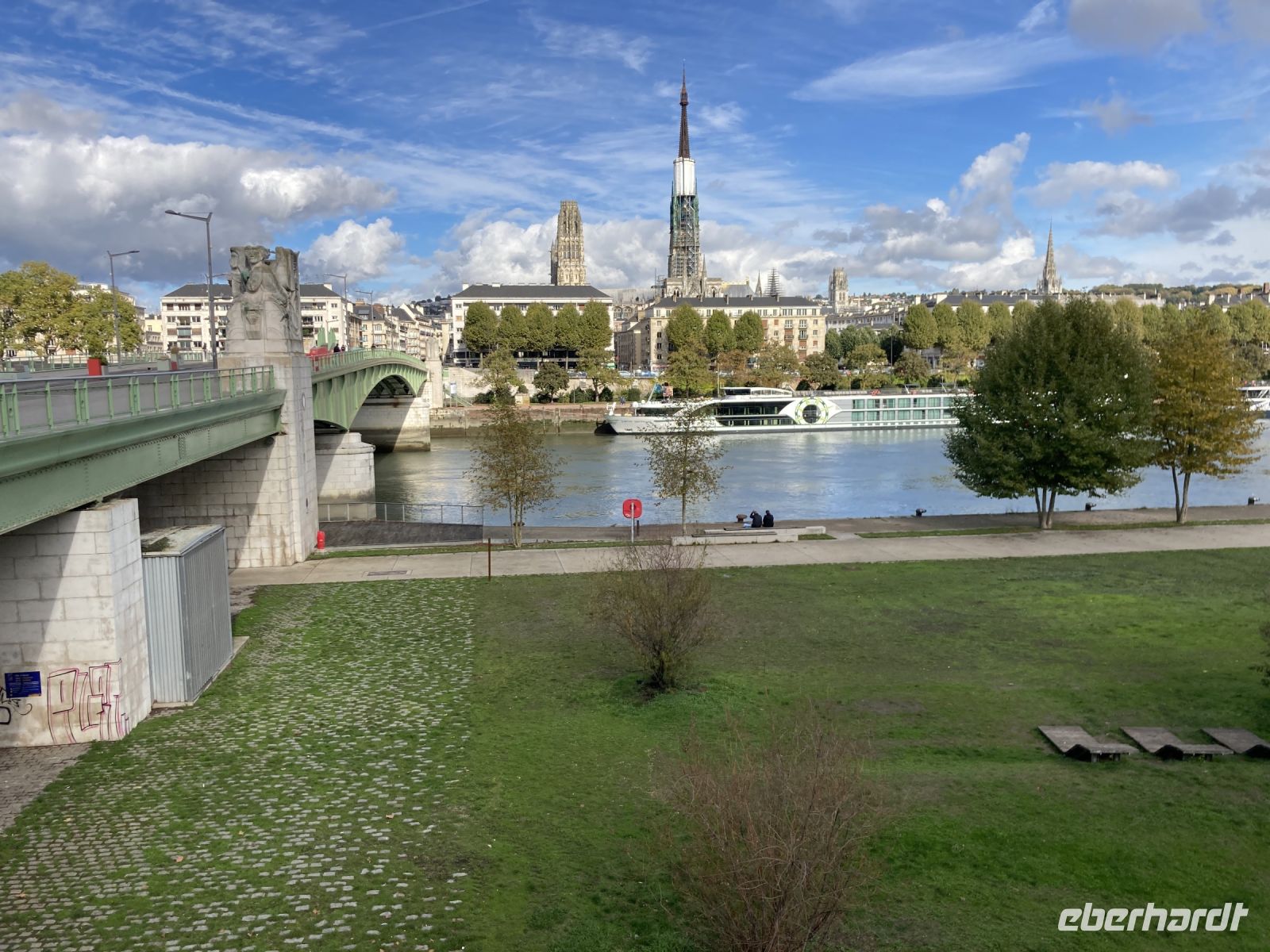 Am Vormittag können wir die Vorzüge einer Flusskreuzfahrt genießen. Sauna, Massage, Kosmetik und die Landschaft zieht an einem vorbei - wunderbar. Nach unserer Ankunft in Rouen beginnt dann auch unser Stadtrundgang. Den Schirm haben wir sicherheitshalber eingepackt. Wir werden ihn auch leider benutzen müssen. Neben den vielen Fachwerkhäusern, die das Stadtbild prägen, sind es auch die zahlreichen Kirchtürme, die Rouen eine besondere Silhouette verleihen. Wir haben sie nicht gezählt, aber sie haben der Stadt den Beinamen als Stadt der 100 Kirchtürme eingetragen. Eine moderne Kirche lernen wir am Altmarkt kennen. An diesem Platz wurde 1431 Jeanne d’Arc verbrannt. Die Kirchenfenster erzählen ihre Lebensgeschichte. Das nächste Gotteshaus, welches wir besuchen, ist die Kathedrale Notre-Dame. Dieser Kirchenbau hat Claude Monet zu einer ganzen Serie von Bildern inspiriert. Viele Besonderheiten hat diese Kathedrale. Der Großteil der Besucher kommt aber vor allem wegen einer Person: Richard Löwenherz hatte im 12.Jahrhundert verfügt, dass sein Herz hier seine letzte Ruhe finden sollte. Sehr zum Leidwesen der Engländer, die es natürlich gerne auf der Insel hätten. Viele Geschichten lassen sich über Rouen erzählen. Tatsächlich lädt sie aber auch einfach zum Flanieren und zum Einkaufen ein. Und tatsächlich kommen auch einige Gäste mit verheißungsvollen Tüten wieder an Bord.