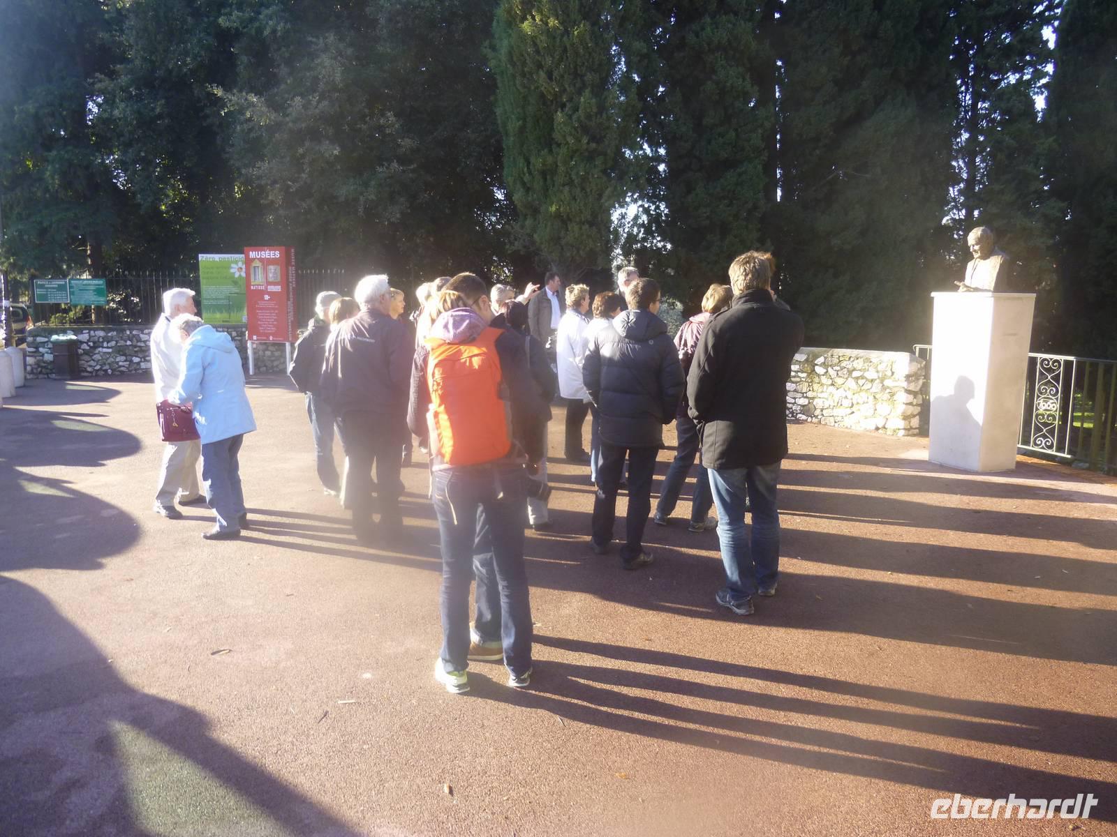Heute Morgen begrüßen wir wieder unsere Reiseleiterin Christel und unseren Busfahrer Phillipe und unternehmen zunächst bei strahlendem Sonnenschein eine ausgiebige Stadtführung mit kombinierten Rundgang in Nizza. Christel zeigt uns einen tollen Aussichtspunkt, von dem wir eine tolle Aussicht auf die Stadt genießen. Anschließend fahren wir weiter vorbei an den schönen Häusern der Jahrhundertwende mit Ihren unterschiedlichen Balkons nach Cimiez. Hier besuchen wir den Klostergarten und unternehmen einen kleinen Spaziergang. Danach fahren wir vorbei an der russischen Kirche zum berühmten Hotel Negresco. Hier haben wir eine kleine Überraschung für unsere Gäste vorbereitet. Normalerweise kann man nicht einfach in das Hotel hinein spazieren, ohne eine Reservierung zu haben. So haben Christel und Vicky für die Gruppe eine Kaffeepause im Hotel organisiert und wir können den Innenraum in seiner vollen Pracht bewundern. Bei einem Café au Lait sitzen wir gemütlich zusammen und genießen die Atmosphäre. Auch nehmen wir den Geburtstag eines Gastes zum Anlass um ihm ein Stück leckeren Apfelkuchen mit Vanilleeis zu servieren. Auch ein Geburtstagsständchen darf nicht fehlen. Danach entführt Christel uns zu einem Rundgang in der nizzianischen Altstadt mit ihrem schönen Blumenmarkt. Vicky besorgt in der Zwischenzeit einen Satz französische Euromünzen, für die Gäste, die dies wünschen. Zurück angekommen am Bus verlässt uns Christel für heute und wir fahren weiter in das schöne Örtchen Antibes. Hier unternehmen wir einen kleinen Bummel durch die Altstadt bis zum Picasso Museum . Einige Gäste gehen hinein und schauen sich die Gemälde, die zu Picassos Lebzeiten hier entstanden sind, genauer an. Wir verweilen noch ein wenig, bevor wir mit vielen Eindrücken im Gepäck am Nachmittag zurück nach Nizza fahren. Einige Gäste erkunden die Stadt noch individuell, bevor wir uns am Abend zu unserem Abendessen wieder treffen. Gemeinsam fahren wir mit der Tram, die wir inzwischen schon gut kennen, in den neuen Teil der Stadt bis zur Station Avenue Jean Médcin. Von hier aus laugen wir gemeinsam zum Restaurant Le Ligure, wo wir bereits erwartet werden. Bei einem leckeren Abendessen mit Gemüsesuppe, Rindfleisch in Rotweinsauce und einem Früchte Sorbet und dem ein oder anderen Glas Wein lassen wir den Abend wieder gemütlich ausklingen. Im Hotel angekommen, nehmen einige Gäste noch einen Drink an der Bar, bevor wir alle seelig in unsere Bette fallen.