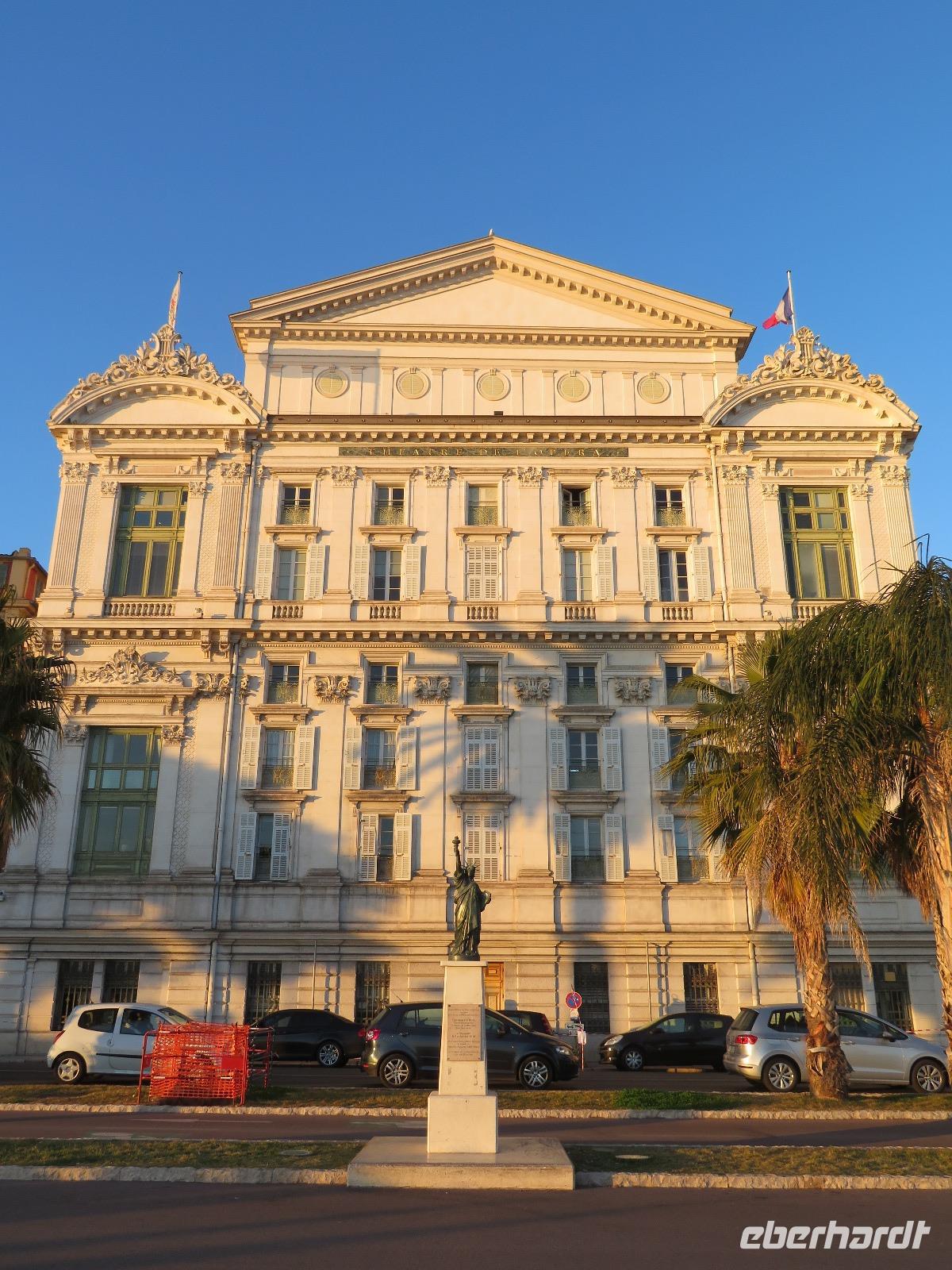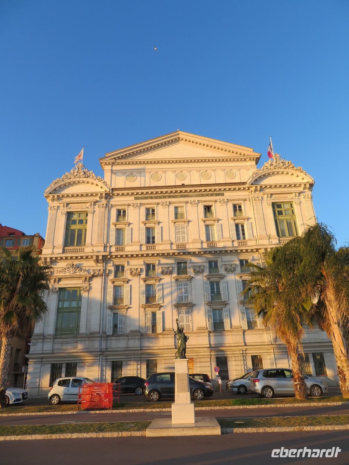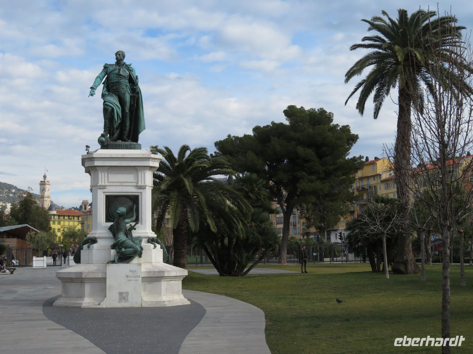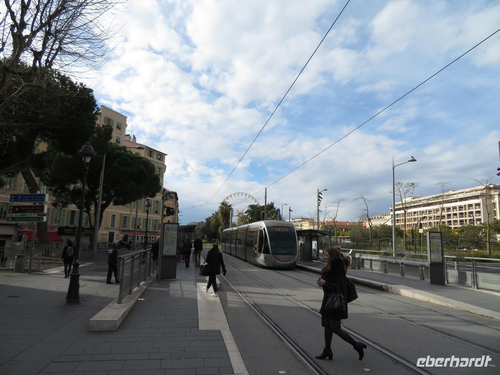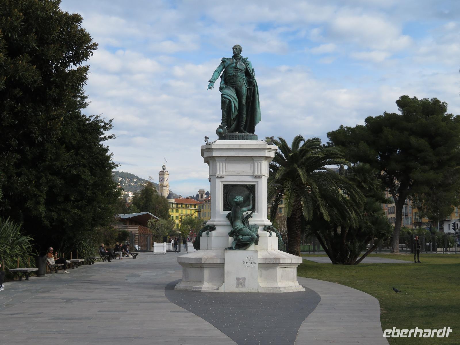 Nur ein kurzer Fußweg trennt unser Hotel von der Fußgängerzone „Rue Masséna", über welche wir in westlicher Richtung in wenigen Minuten das Herzstück der Stadt, „Place Masséna" erreichen. Herrschaftliche Gebäude des 17.Jahrhunderts mit Fassaden und malerischen Arkadenbögen in Rot und Ocker rahmen den wichtigsten und größten Platz Nizzas und tragen zum italienischen Flair der Stadt bei. Seit der Neugestaltung des Stadtraumes vor etwa zehn Jahren ist der Autoverkehr aus der Altstadt verbannt, eine hochmoderne Straßenbahn steht als preiswertes Transportmittel zur Verfügung und an allen Haltestellen bereichert moderne Kunst den Stadtraum. Am schönsten finde ich persönlich die Installation „Conversation à Nice" vom katalanischen Künstler Jaume Plensa: Sieben in wechselnden Farben beleuchtete Skulpturen auf zehn Meter hohen Masten stellen die sieben Kontinente dar.