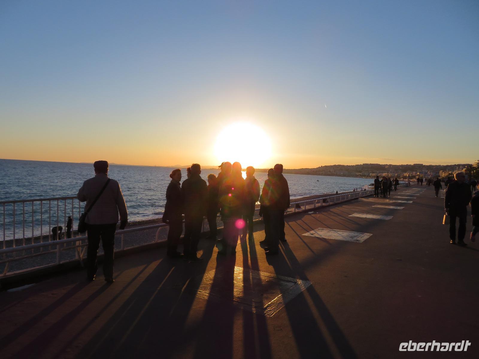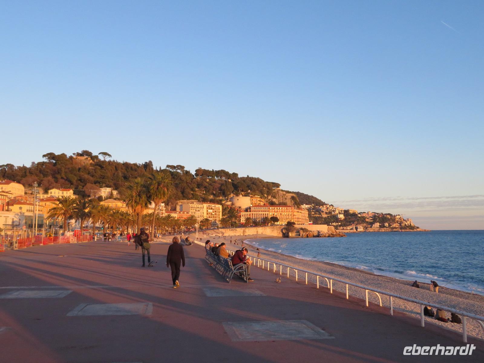 Bereits auf der Busfahrt vom Flughafen zum Hotel lernen wir die Engelsbucht mit der am Meer entlang verlaufenden „Promenade des Anglais" kennen, die ihren Namen von den „Entdeckern" der wunderbar milden Winter der Côte d'Azur hat: den Engländern! Sie waren die ersten „Überwinterer", vor allem, wenn sie an Rheuma oder Asthma litten und über ausreichend Vermögen verfügten. Zahllose Hotels wurden an der Uferpromenade gebaut, das bekannteste ist das „Negresco", ein Luxushotel im Stil der Belle Époque mit einer auffälligen, pinkfarbenen Kuppel auf dem Eckturm.