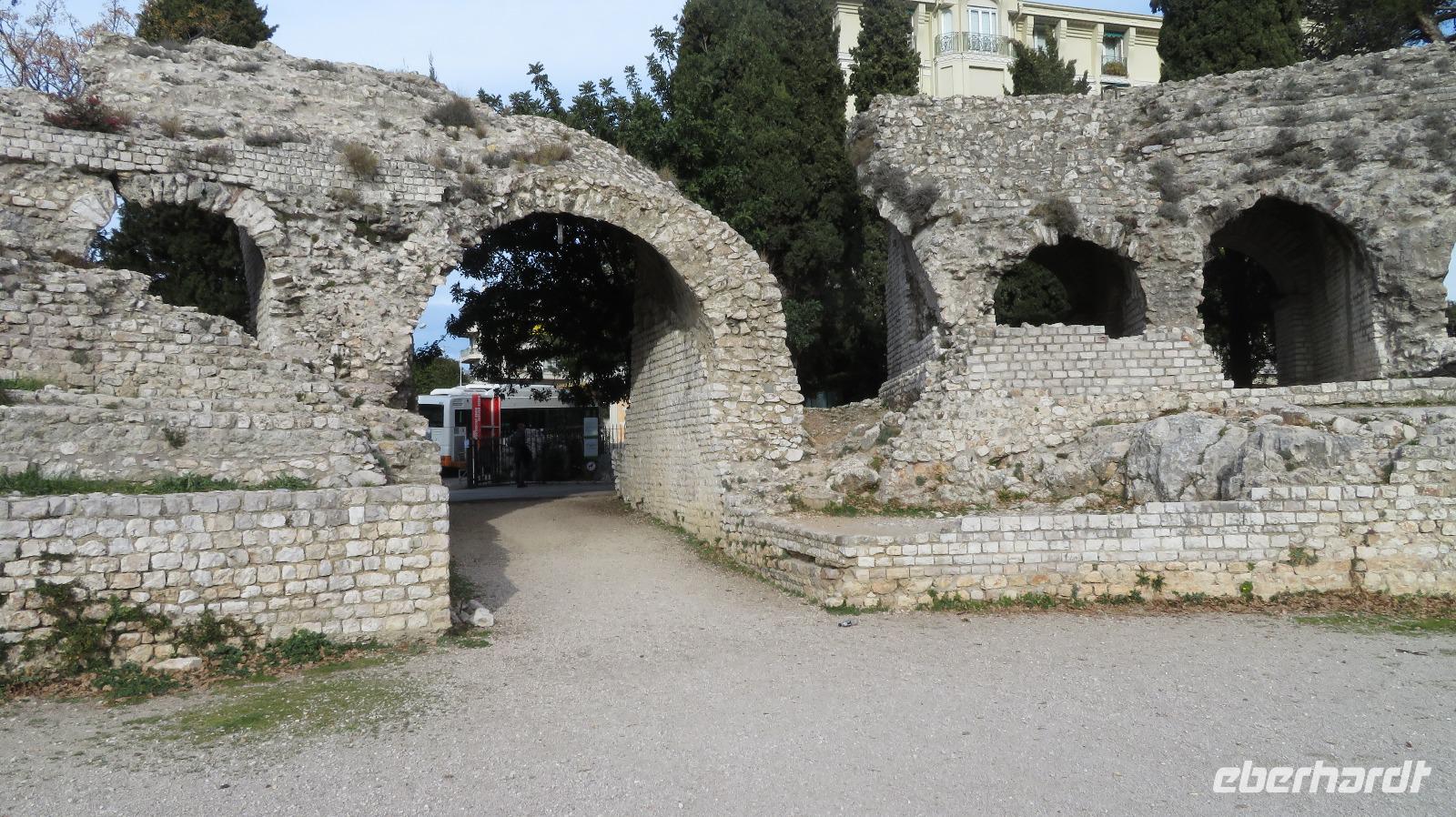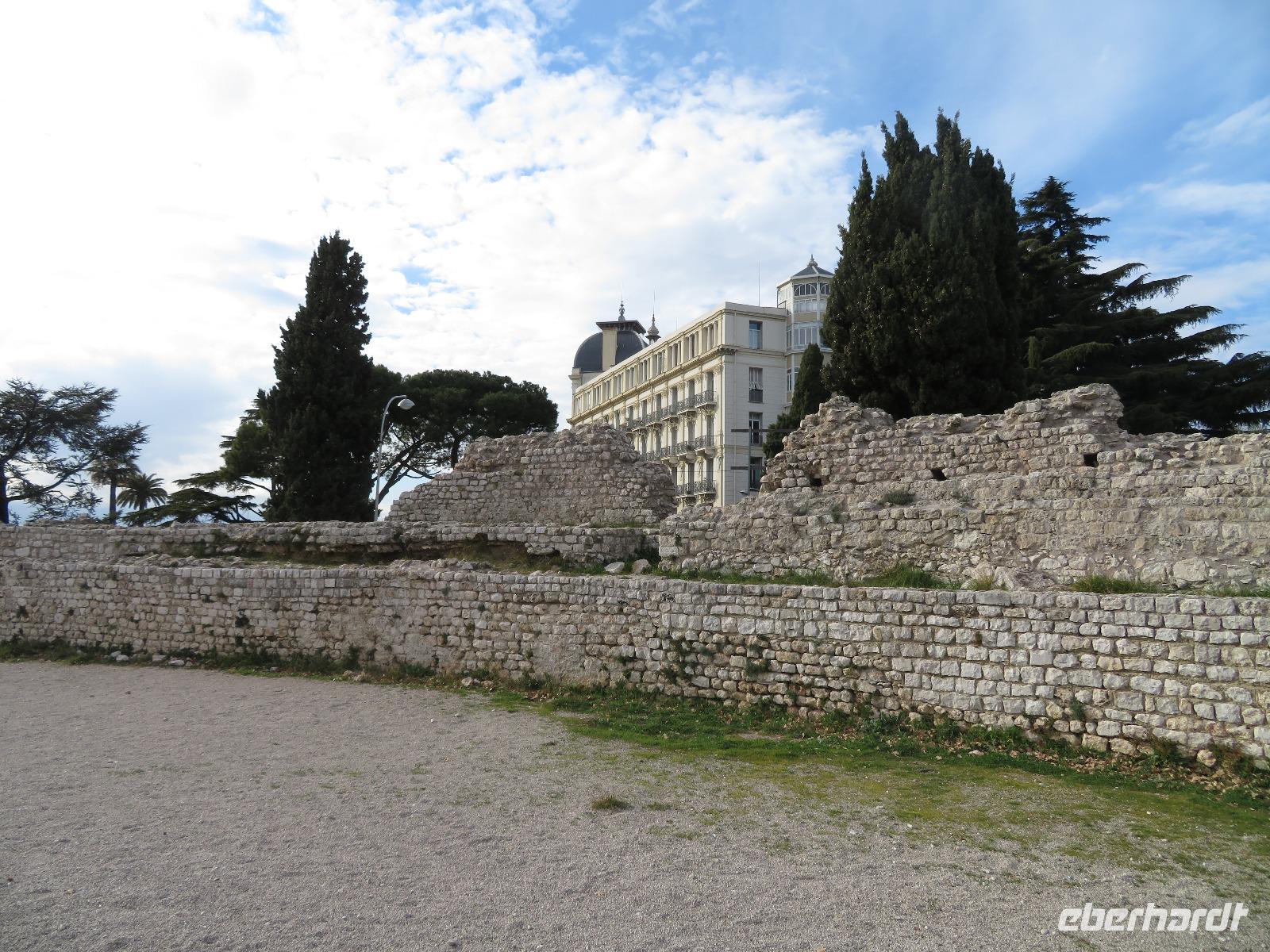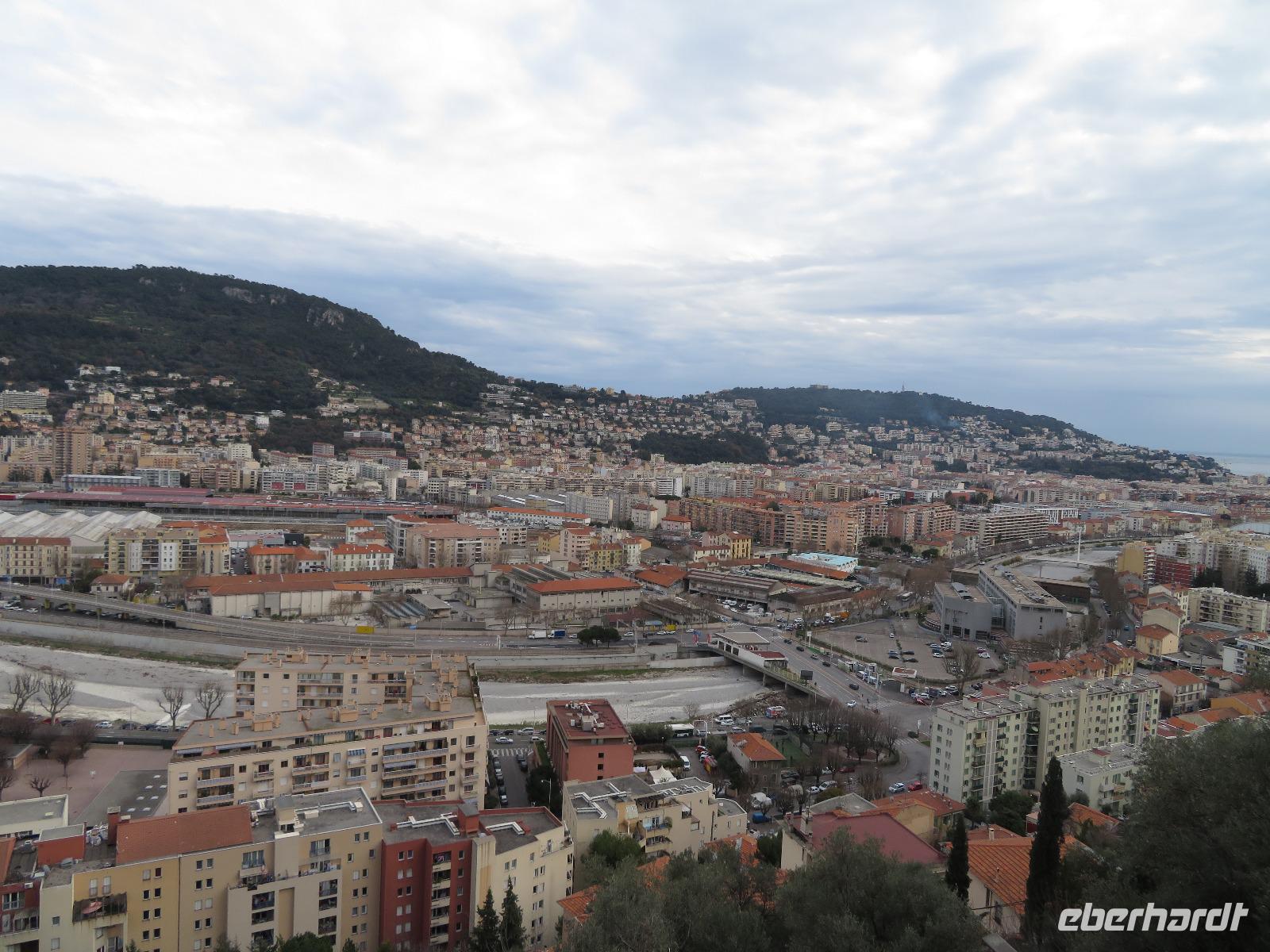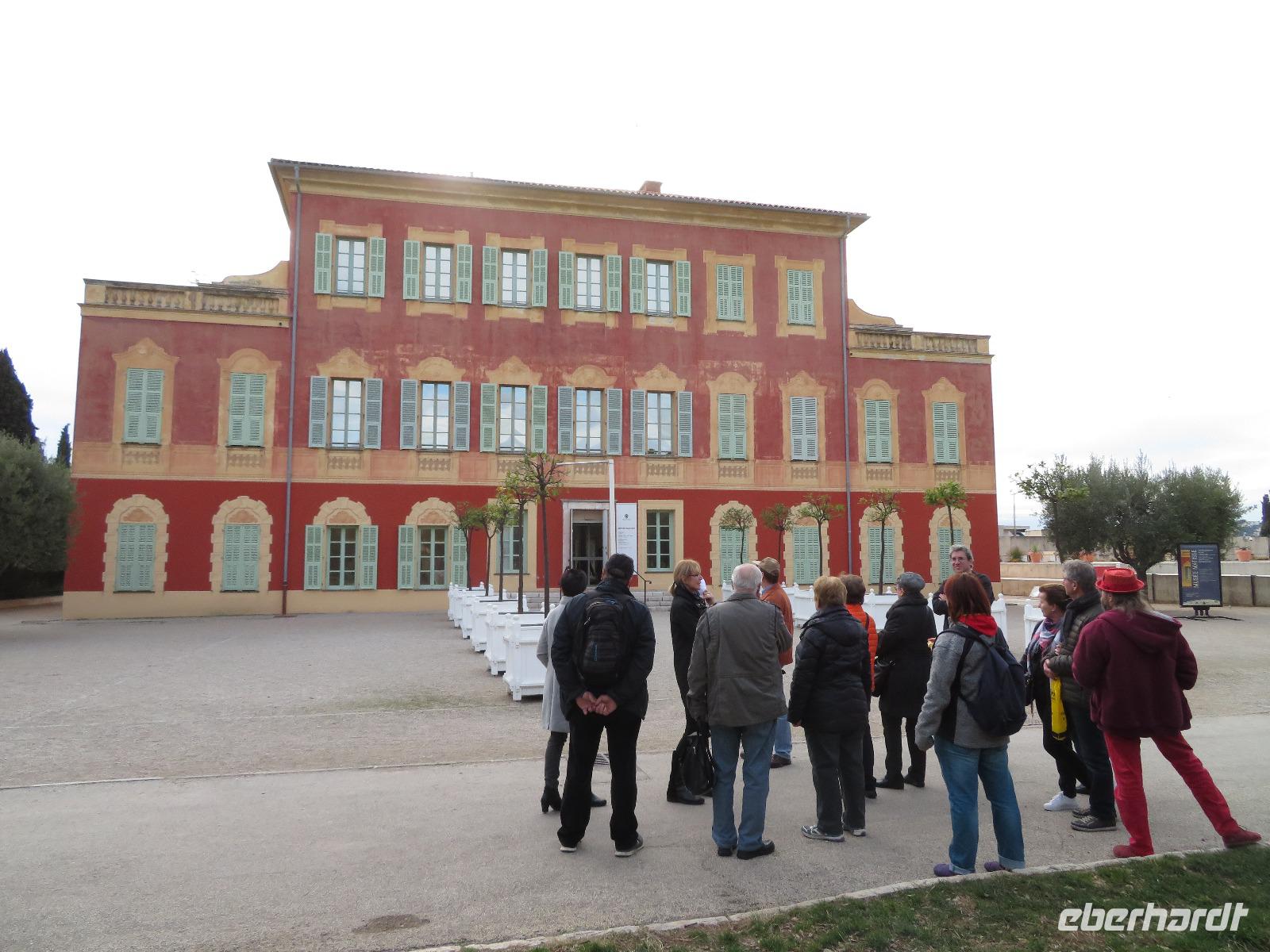 Mit dem Linienbus fahren wir in das nördlich der Altstadt gelegene Stadtviertel Cimiez, welches auf einem Hügel hoch über den Dächern von Nizza liegt. Hier kann man bis heute in den luxuriösen Winterresidenzen des europäischen Hochadels wohnen! Die großzügigen Freitreppen, die kunstvollen schmiedeeisernen Gitter und Brüstungen, die Wintergärten und Privatparks lassen uns ein wenig vom Leben in der „Belle Epoque" erahnen. Das prächtigste aller Palais ist das für Queen Victoria 1897 fertiggestellte Winterpalais Régina I, welches die schönste Fassade von Nizza besitzt: Eine Veranda aus Glas, Balkonelemente mit schmiedeeisernen Gittern und verspielte Türmchen auf dem Dach. Hier lebte und malte Henri Matisse mehrere Jahre. Wir spazieren durch den „Parc des Arènes" zu den Ruinen römischer Thermen und besuchen die Kirche eines Franziskanerklosters. Dort sind wertvolle Gemälde des berühmten Malers Louis Bréa aus konservatorischen Gründen hinter einer Gaze versteckt - sie, wie auch die gesamte Kirche warten dringend auf eine Restaurierung! Vom ehemaligen Klostergarten aus haben wir einen sehr schönen Ausblick auf den „Mont Boron" im Osten der Stadt, die weiße Halbkugel der beweglichen Kuppel des Observatorium von Gustav Eiffel ist ganz leicht zu erkennen, etwas mehr Mühe haben wir, in weiter Ferne Türmchen der Villa von Elton John, dem bekannten britischen Sänger und Komponisten, zu erspähen. Um so besser kann man das Flussbett des Paillon und den Schlossberg (Colline du Château), der hoch über Nizza thront, erkennen. Wer die steile Treppe hinauf auf den Schlossberg nicht nehmen möchte, kann kostenlos einen Aufzug benutzen. Oben angekommen wird man mit einem atemberaubenden Ausblick belohnt!