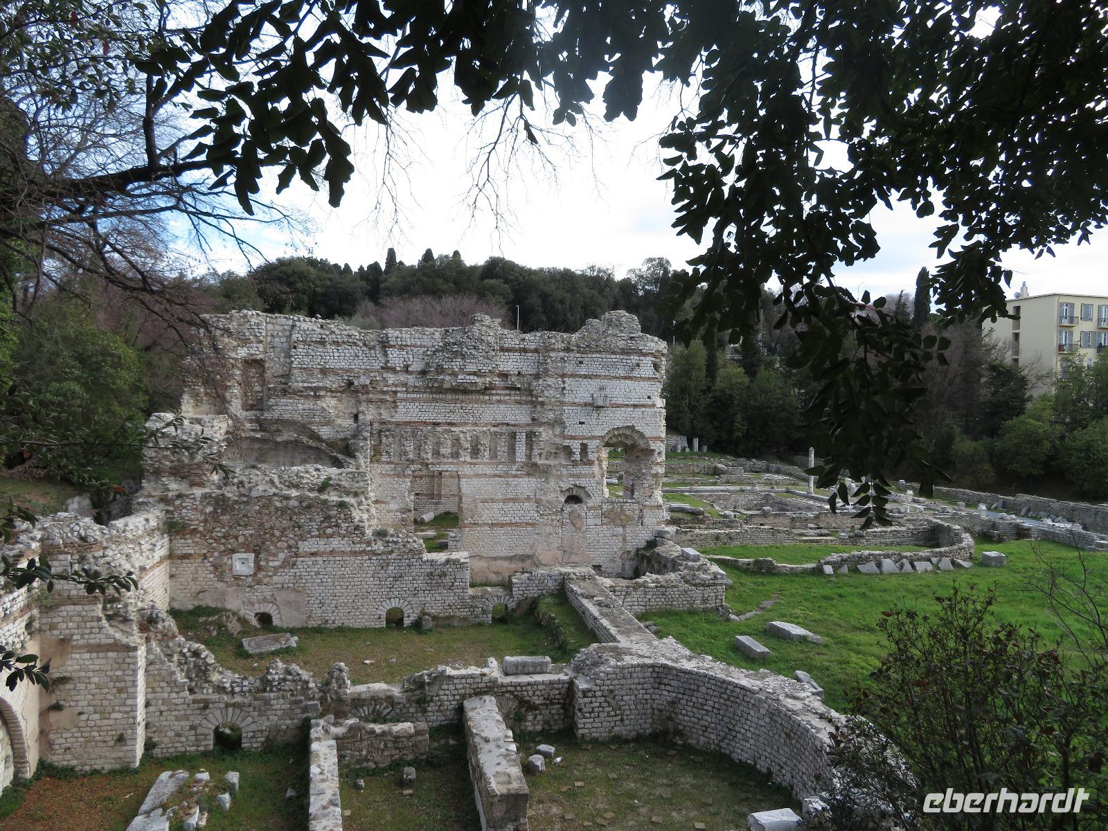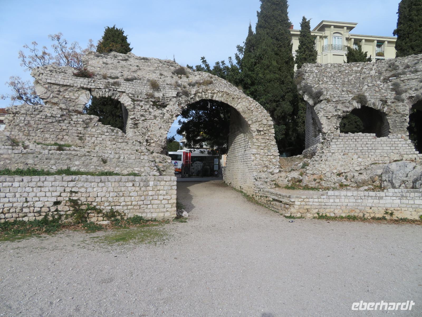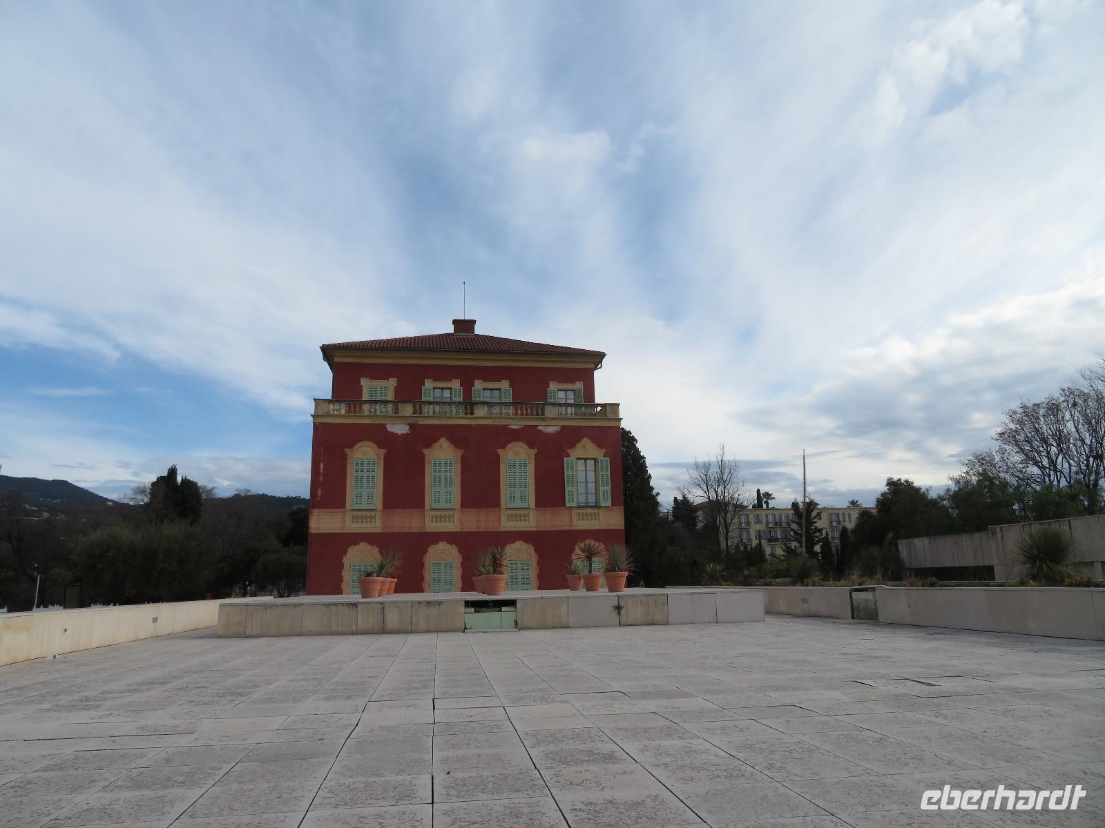 Mit dem Linienbus fahren wir in das nördlich der Altstadt gelegene Stadtviertel Cimiez, welches auf einem Hügel hoch über den Dächern von Nizza liegt. Hier kann man bis heute in den luxuriösen Winterresidenzen des europäischen Hochadels wohnen! Die großzügigen Freitreppen, die kunstvollen schmiedeeisernen Gitter und Brüstungen, die Wintergärten und Privatparks lassen uns ein wenig vom Leben in der „Belle Epoque" erahnen. Das prächtigste aller Palais ist das für Queen Victoria 1897 fertiggestellte Winterpalais Régina I, welches die schönste Fassade von Nizza besitzt: Eine Veranda aus Glas, Balkonelemente mit schmiedeeisernen Gittern und verspielte Türmchen auf dem Dach. Hier lebte und malte Henri Matisse mehrere Jahre. Wir spazieren durch den „Parc des Arènes" zu den Ruinen römischer Thermen und besuchen die Kirche eines Franziskanerklosters. Dort sind wertvolle Gemälde des berühmten Malers Louis Bréa aus konservatorischen Gründen hinter einer Gaze versteckt - sie, wie auch die gesamte Kirche warten dringend auf eine Restaurierung! Vom ehemaligen Klostergarten aus haben wir einen sehr schönen Ausblick auf den „Mont Boron" im Osten der Stadt, die weiße Halbkugel der beweglichen Kuppel des Observatorium von Gustav Eiffel ist ganz leicht zu erkennen, etwas mehr Mühe haben wir, in weiter Ferne Türmchen der Villa von Elton John, dem bekannten britischen Sänger und Komponisten, zu erspähen. Um so besser kann man das Flussbett des Paillon und den Schlossberg (Colline du Château), der hoch über Nizza thront, erkennen. Wer die steile Treppe hinauf auf den Schlossberg nicht nehmen möchte, kann kostenlos einen Aufzug benutzen. Oben angekommen wird man mit einem atemberaubenden Ausblick belohnt!